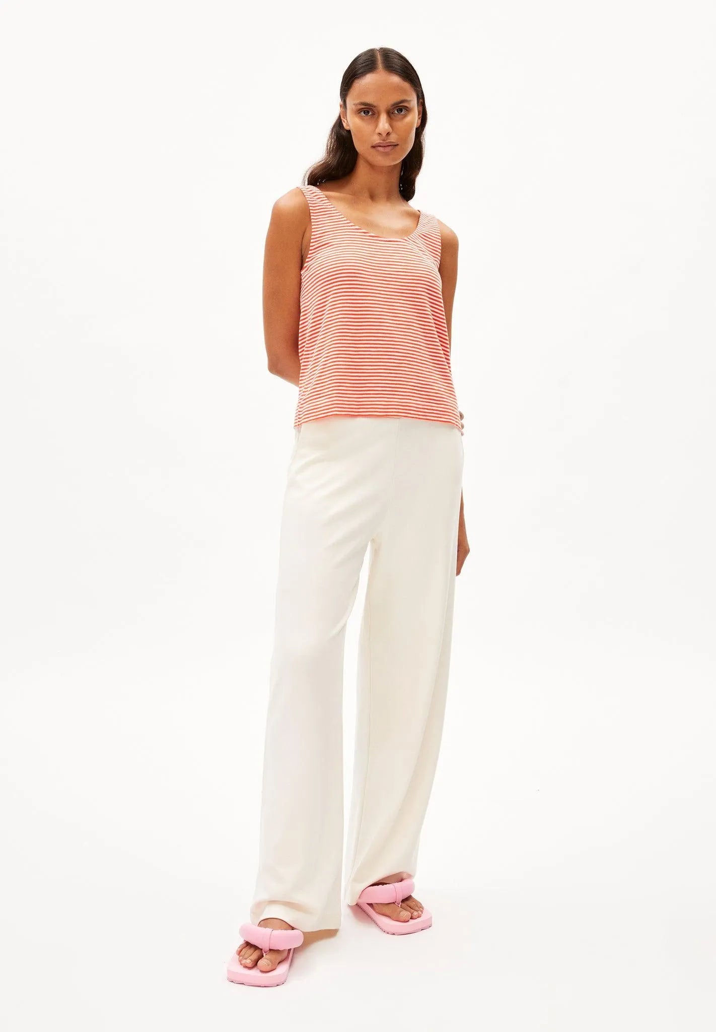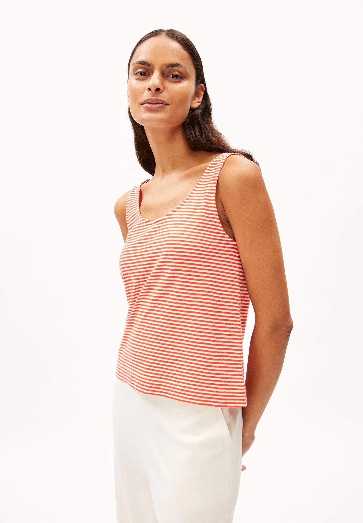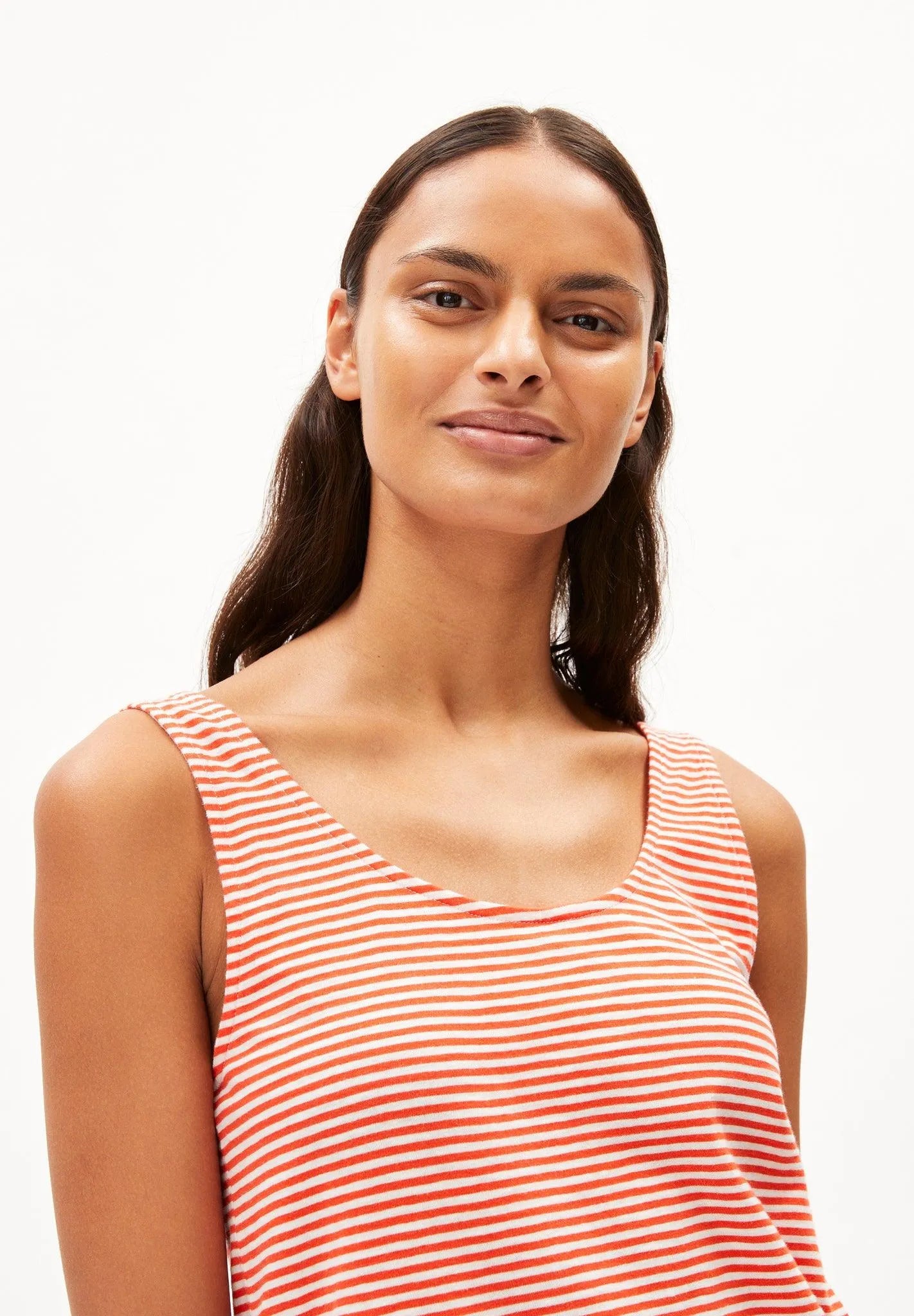 Camiseta sin mangas de cuello redondo con estampado a rayas rojo y blanco.