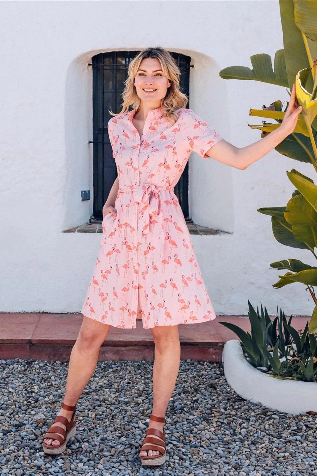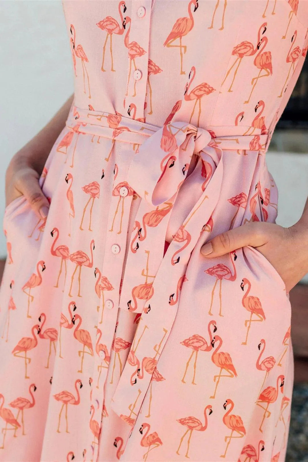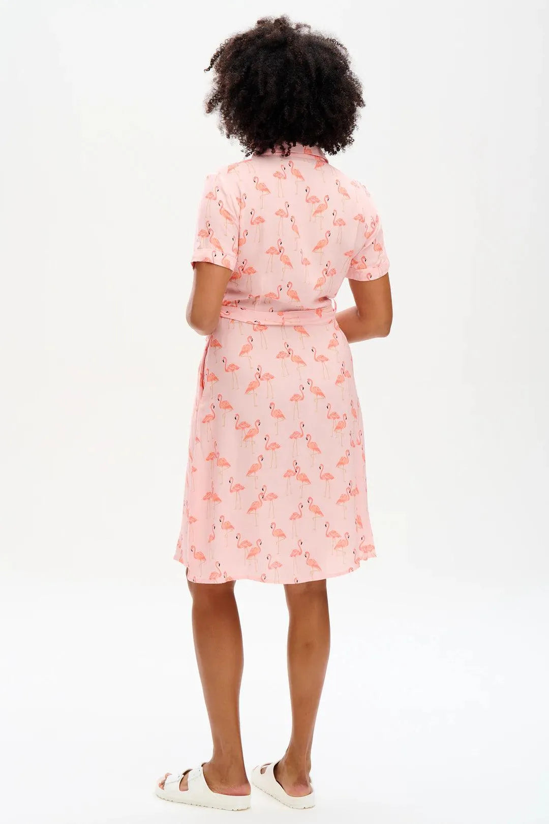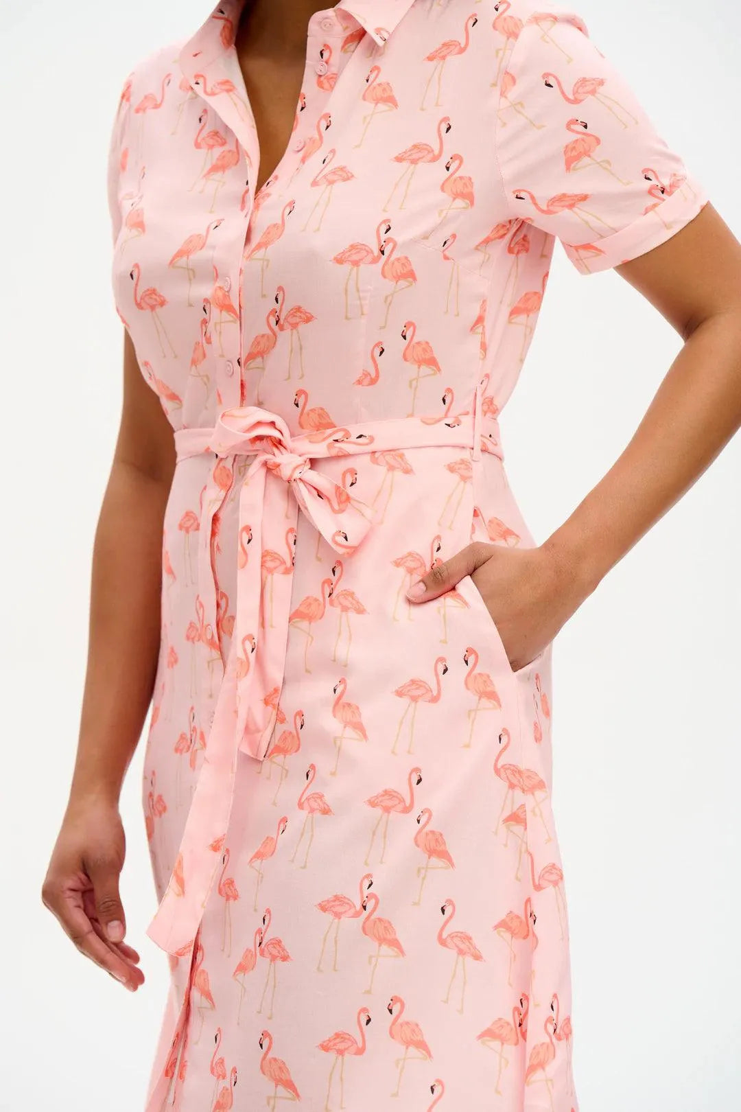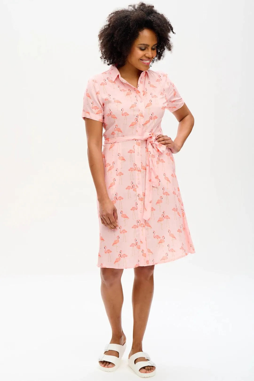¿A quién no le gusta un vestido camisero? La forma Abby combina mangas cortas, cintura anudada y una falda acampanada para crear una silueta favorecedora. Este estampado de flamencos pictóricos tiene un toque muy femenino, con ilustraciones de flamencos rosas suaves sobre una base rosa pálido.
