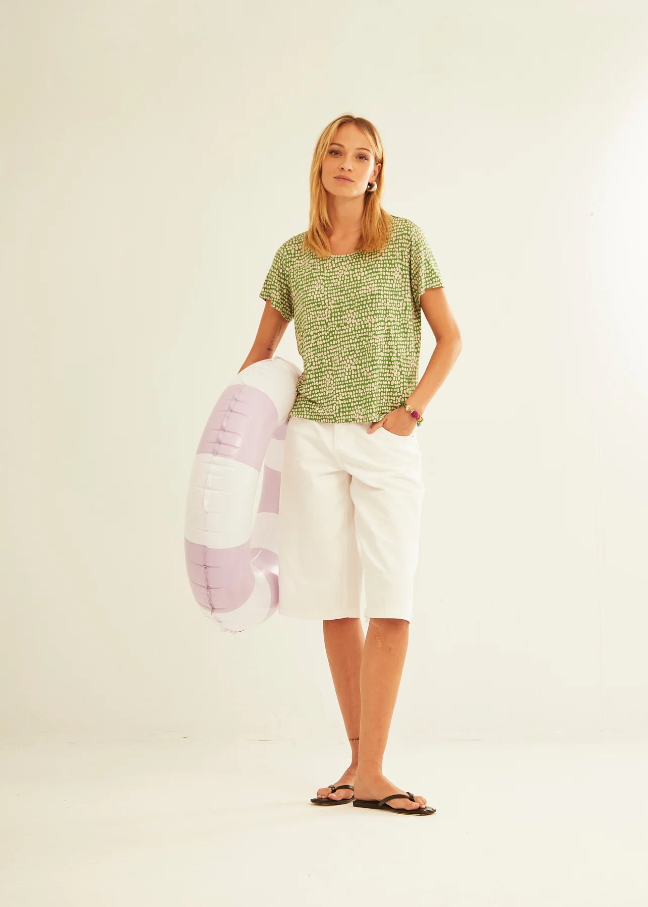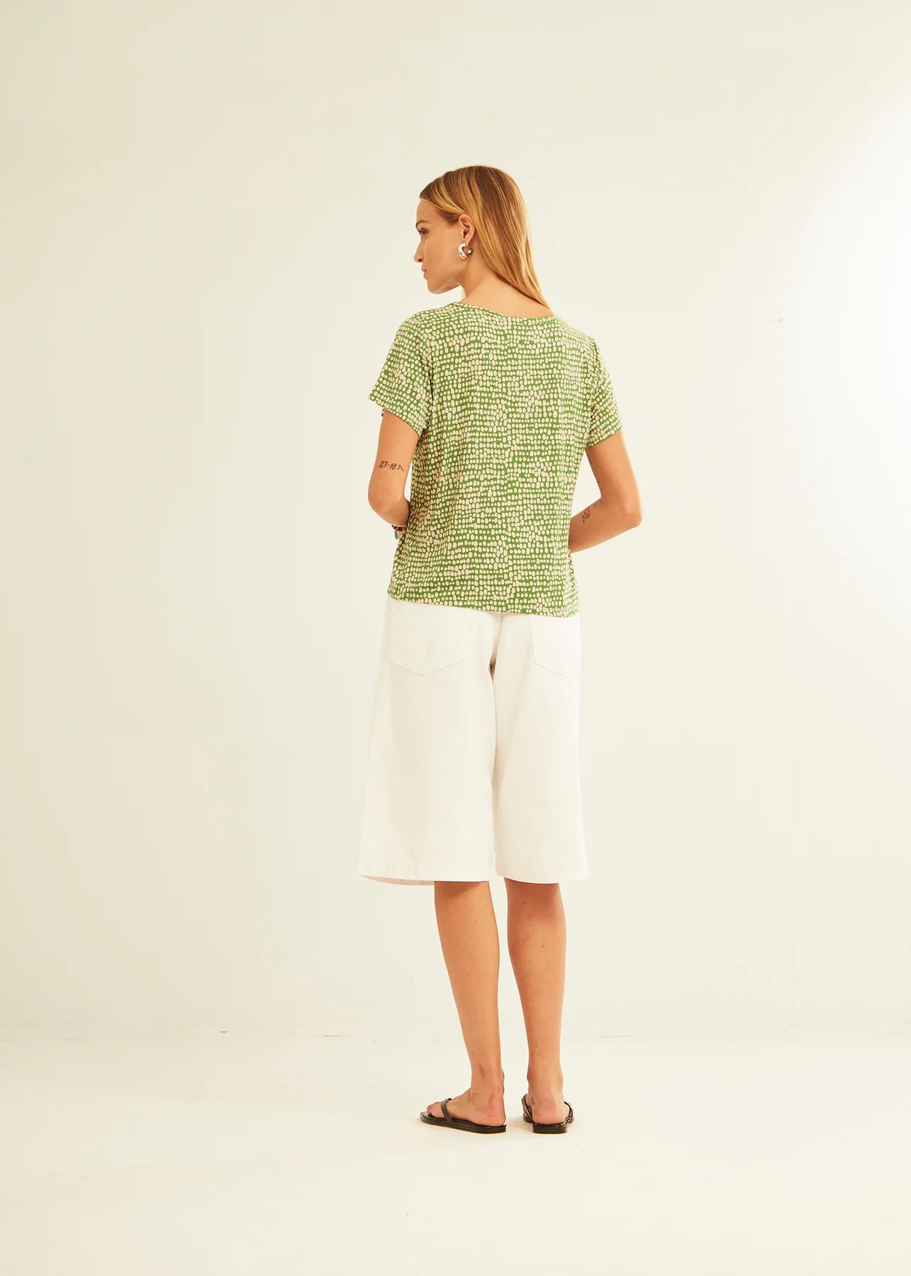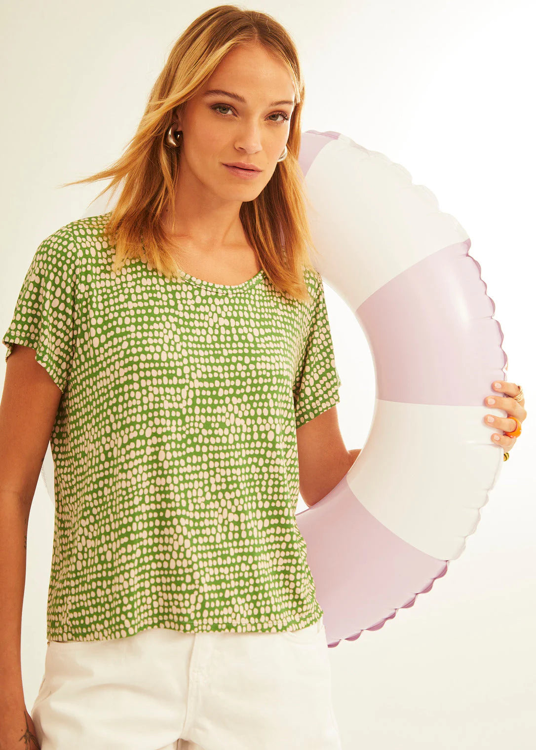Camiseta de manga corta con escote redondo, corte evasé y estampado Green & White. Composición: Viscosa 95% Elastano 5%.