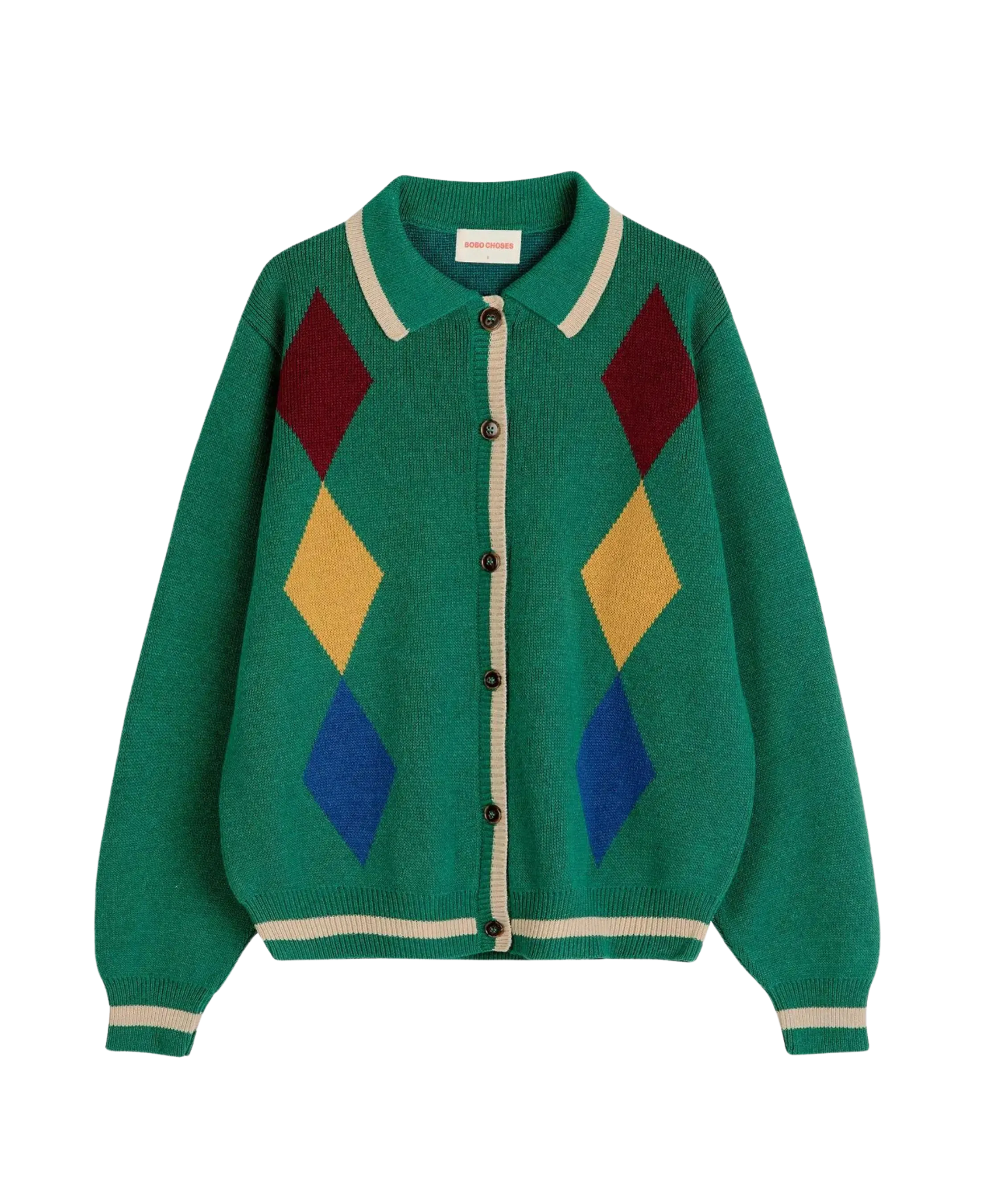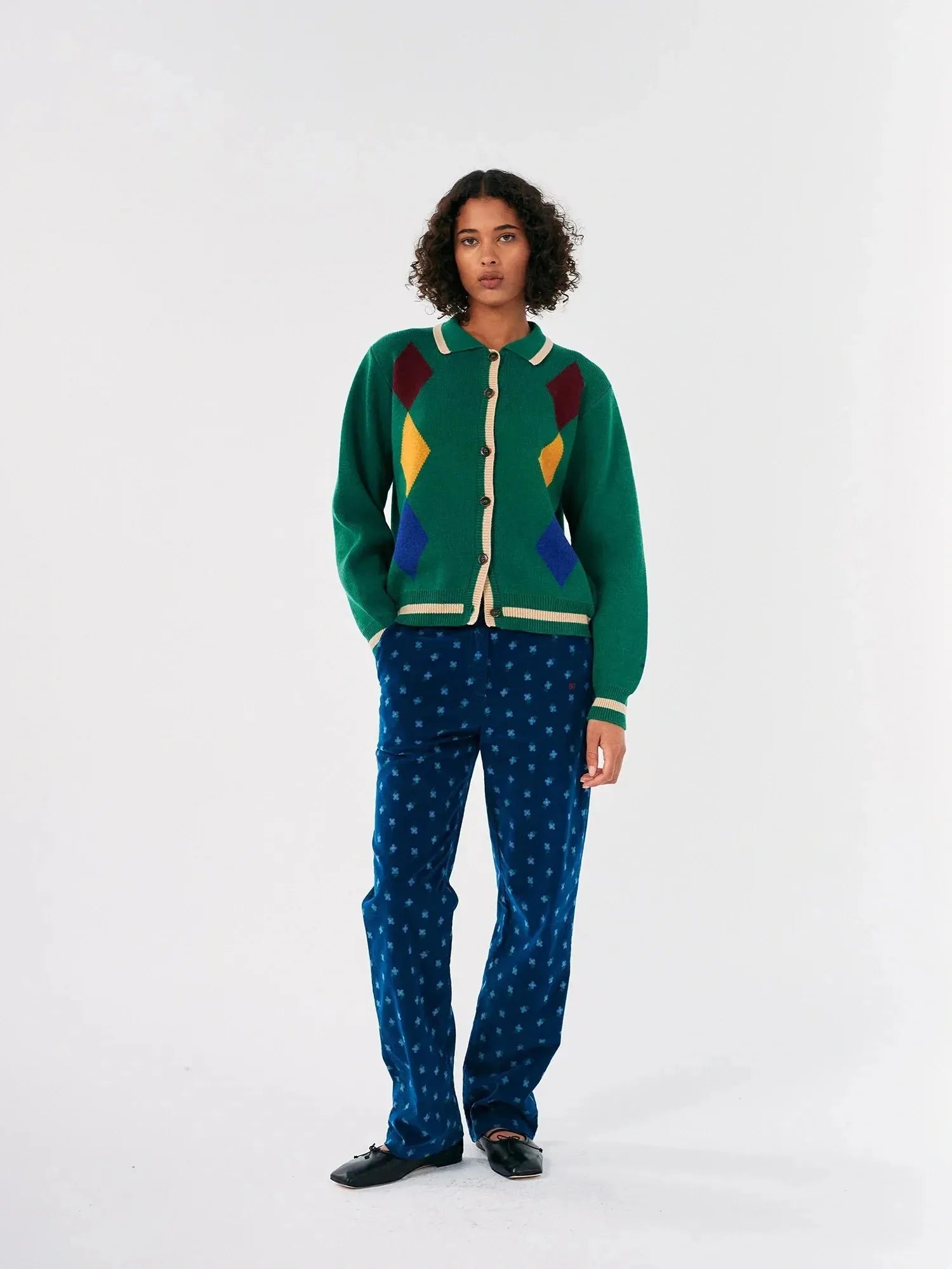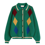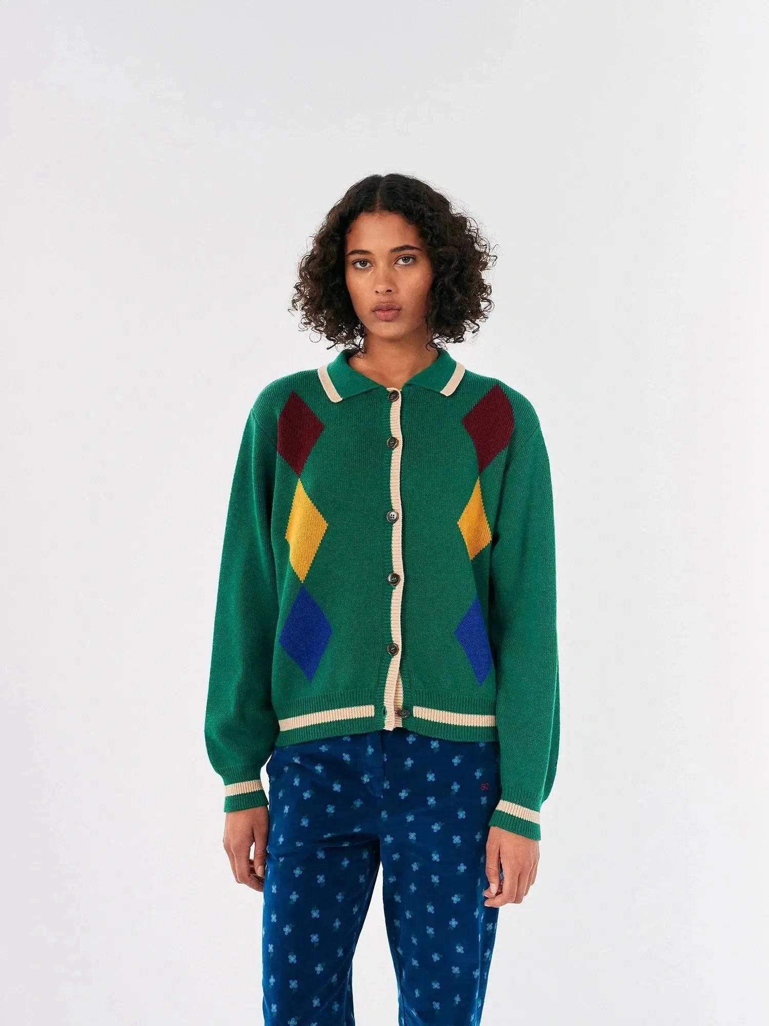 Este cárdigan verde oscuro destaca por su estilo atemporal pero moderno y juguetón, inspirado en los alegres arlequines italianos de los cuentos infantiles. El estampado delantero presenta atrevidos rombos rojos, amarillos y azules que recorren la pieza. Captan fácilmente la atención de todos, creando conjuntos llenos de personalidad.