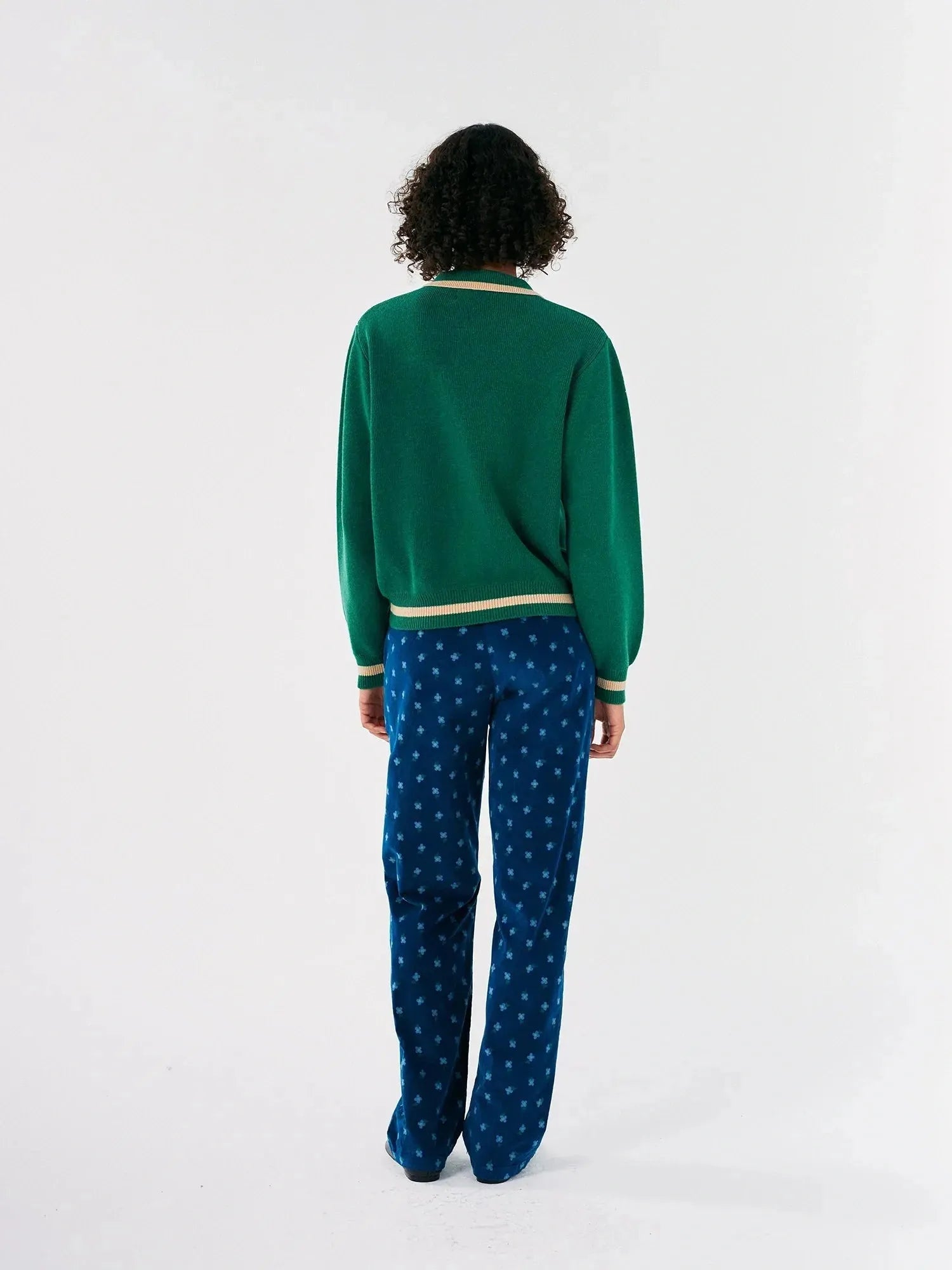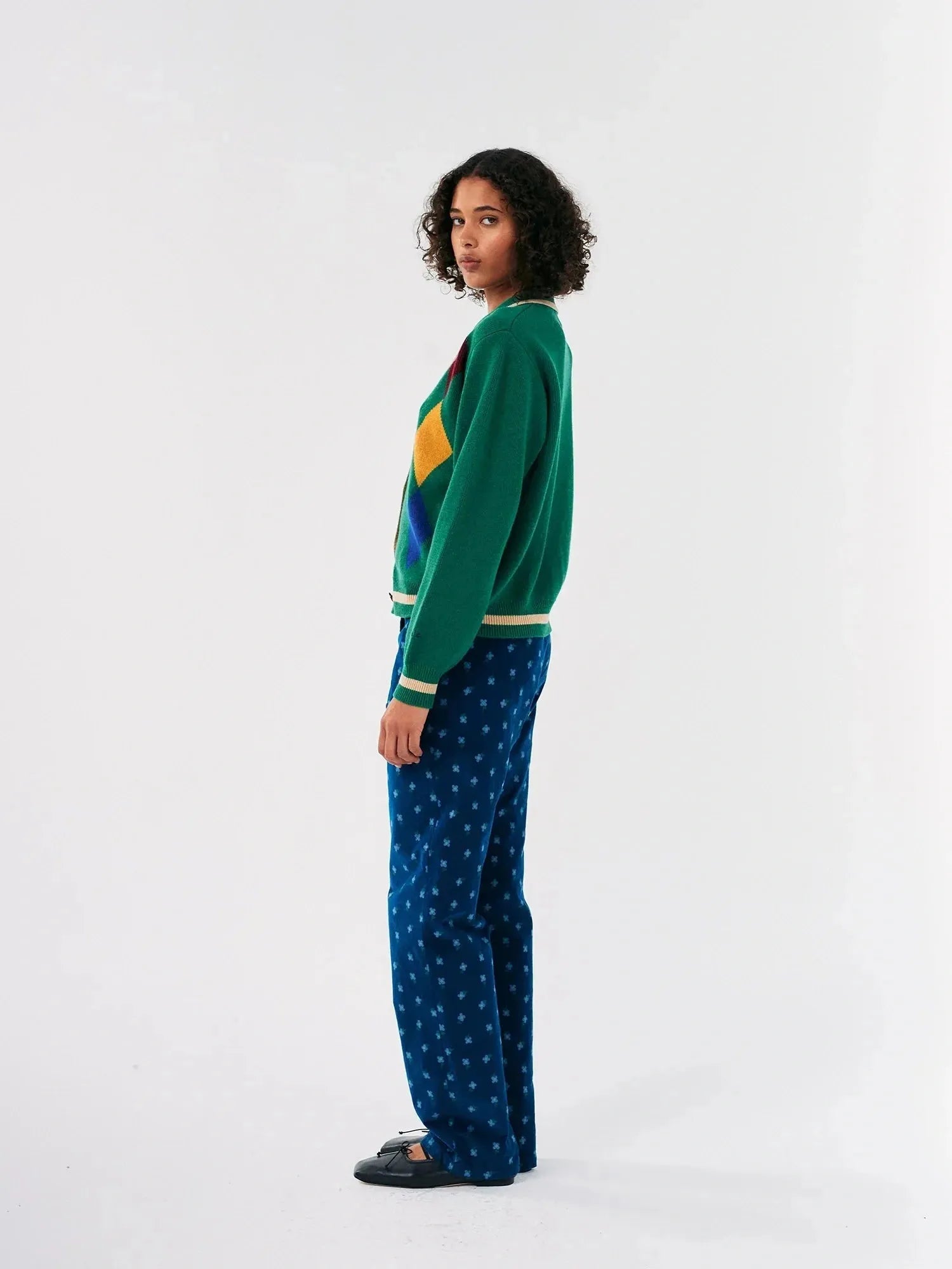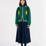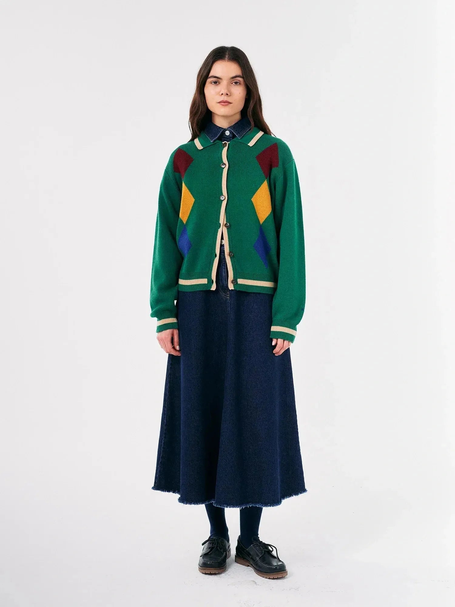 Este cárdigan verde oscuro destaca por su estilo atemporal pero moderno y juguetón, inspirado en los alegres arlequines italianos de los cuentos infantiles. El estampado delantero presenta atrevidos rombos rojos, amarillos y azules que recorren la pieza. Captan fácilmente la atención de todos, creando conjuntos llenos de personalidad.