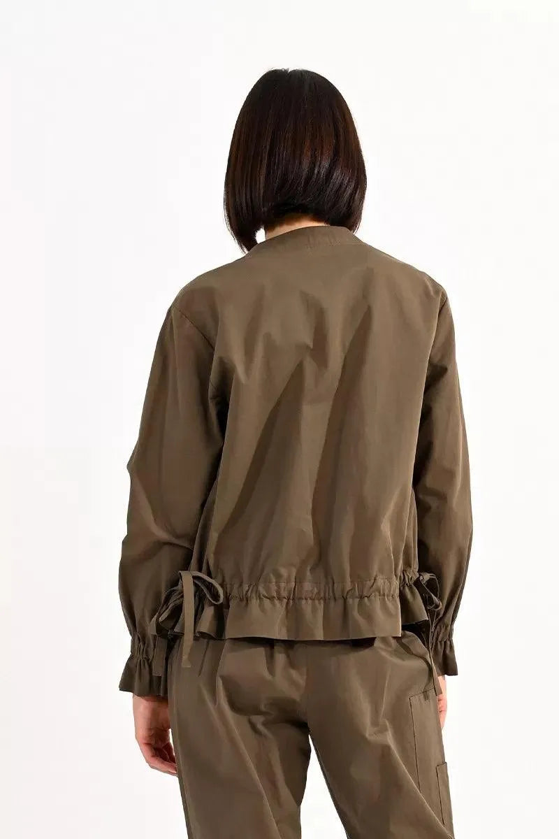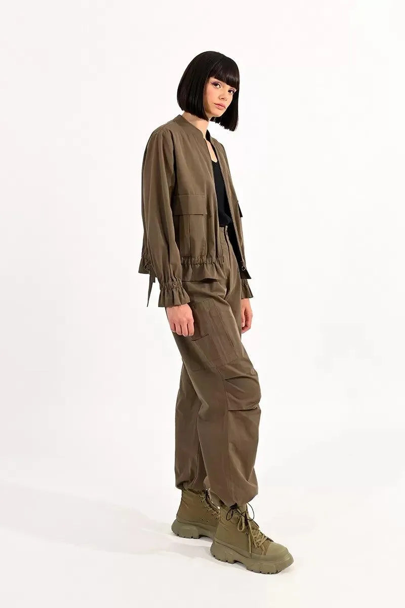 Chaqueta de manga larga poeta, cuello mao y corte recto. Modelo con bolsillos grandes frontales y volantes en el bajo.