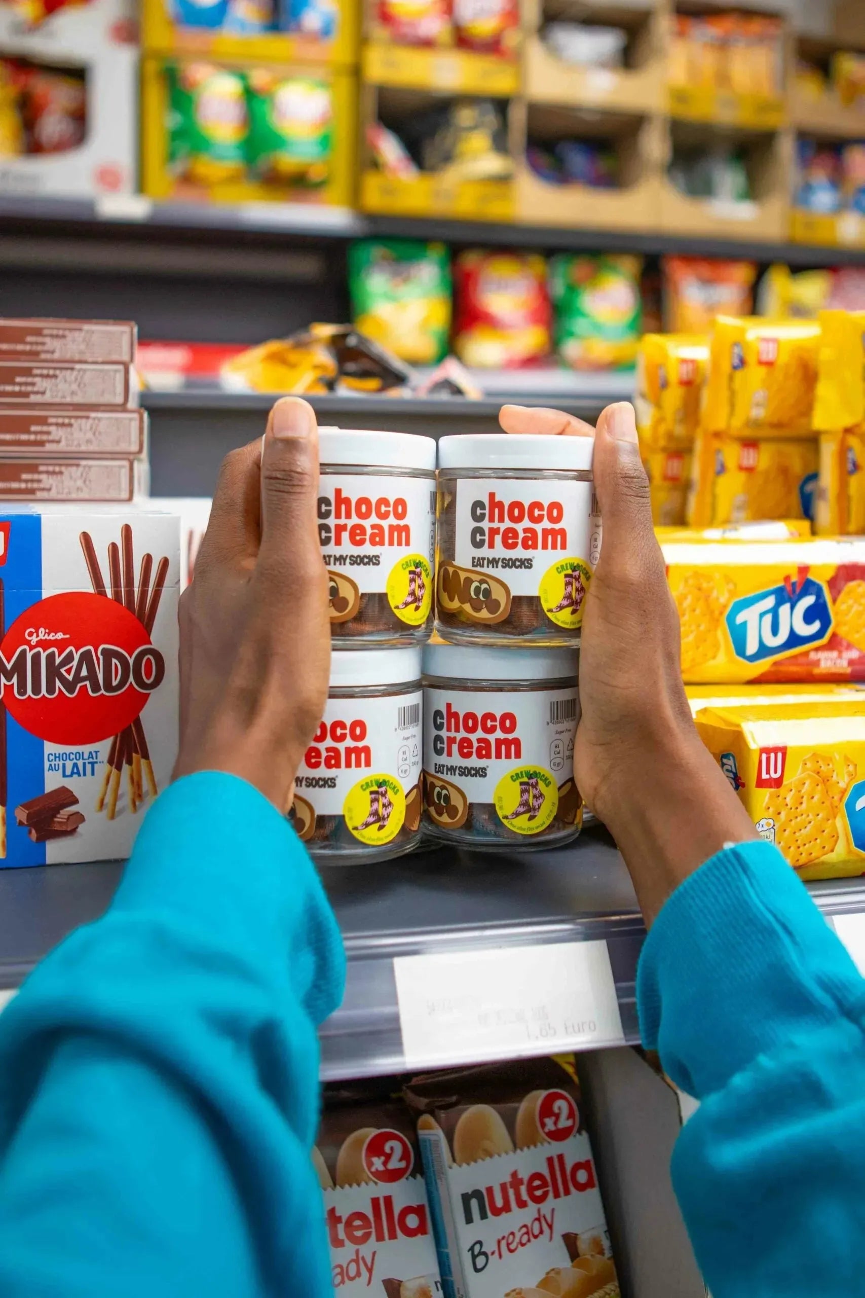 Un acogedor par de calcetines dentro de un tarro de crema de chocolate es un regalo inesperado y delicioso.