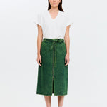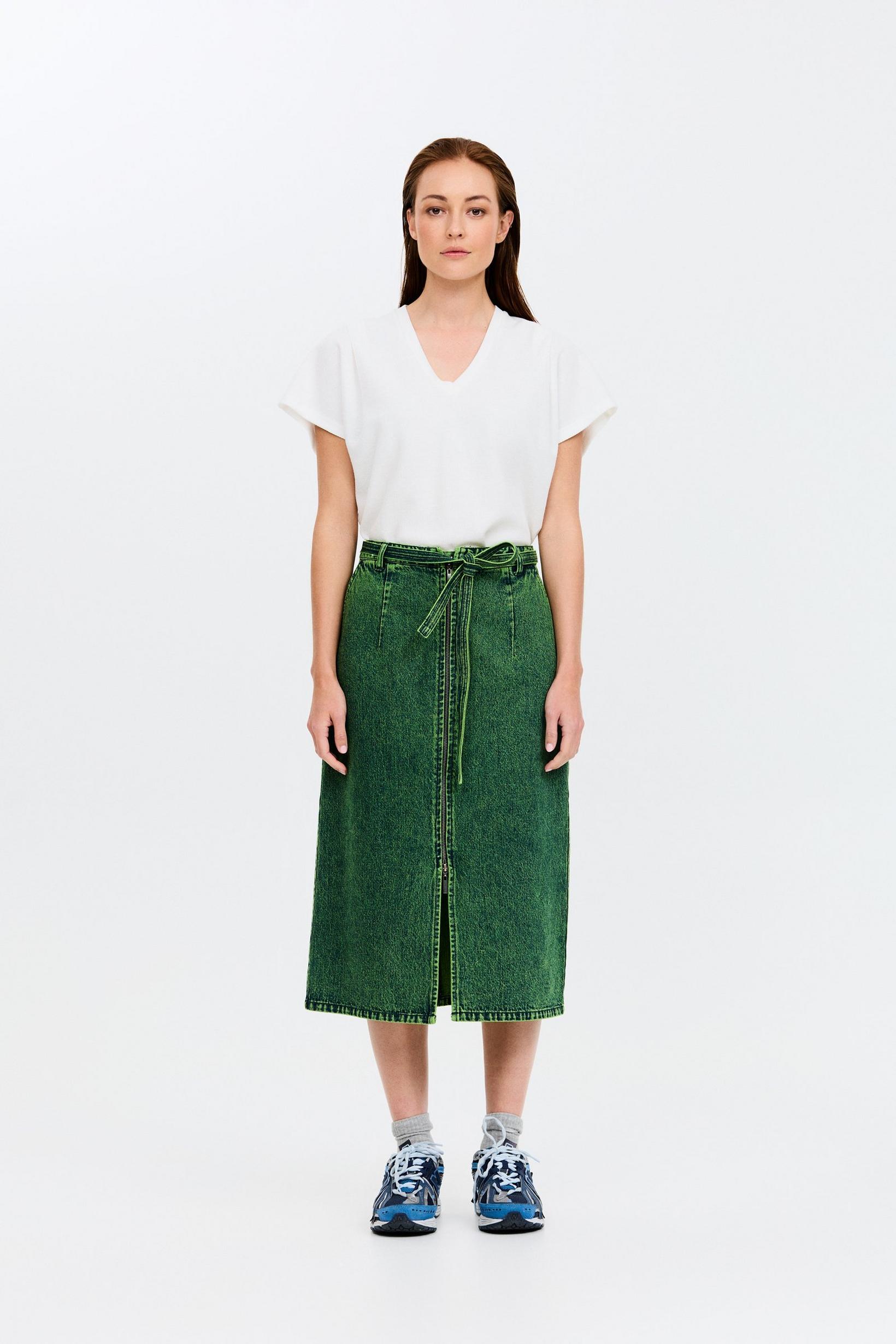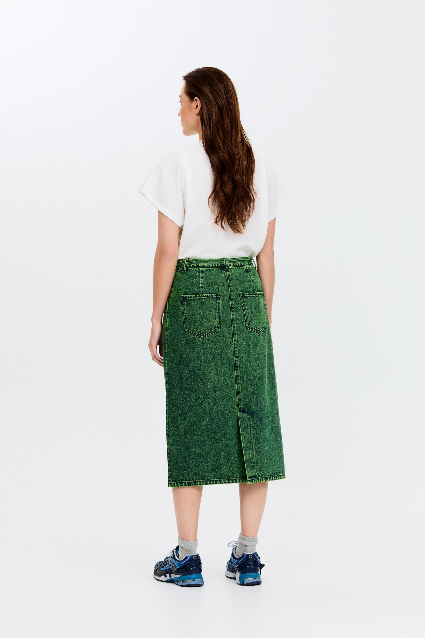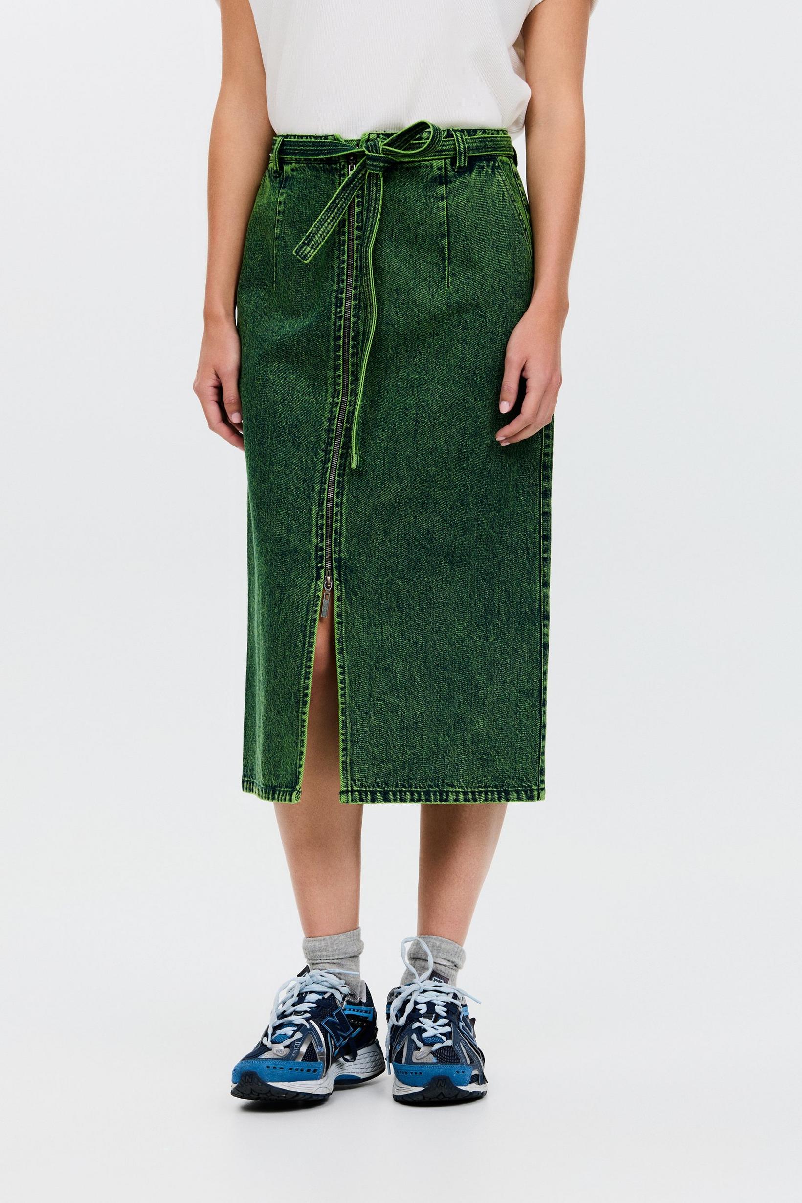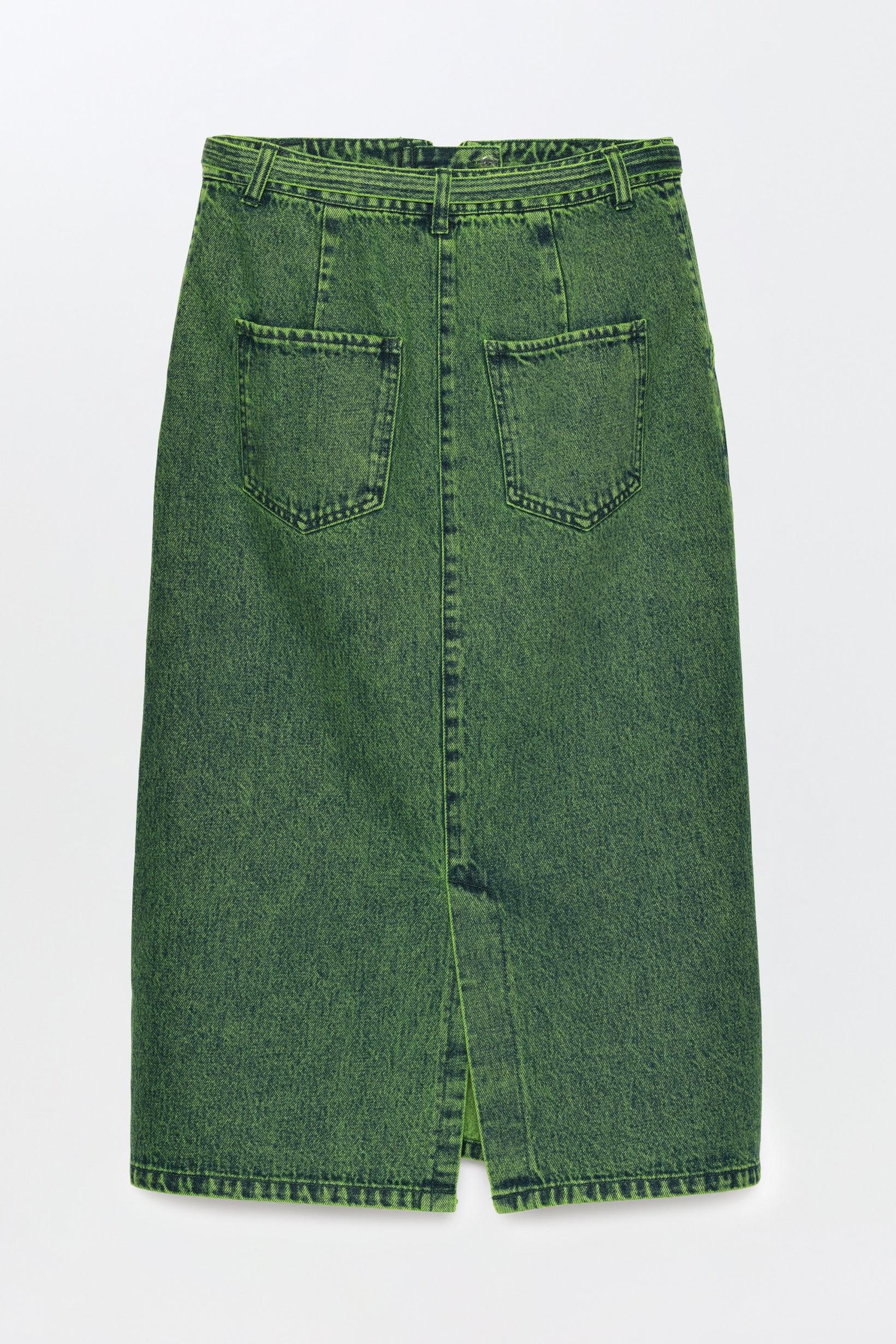 ¡Alerta de tendencia! El denim lavado al ácido es una tendencia que no te puedes perder esta temporada, y esta falda midi verde para mujer es la prueba definitiva. Un lavado al ácido atrevido le da a esta falda vaquera recta ese toque extra. Esta prenda tiene cintura alta, abertura en la parte delantera y una cinta a juego en la cintura.