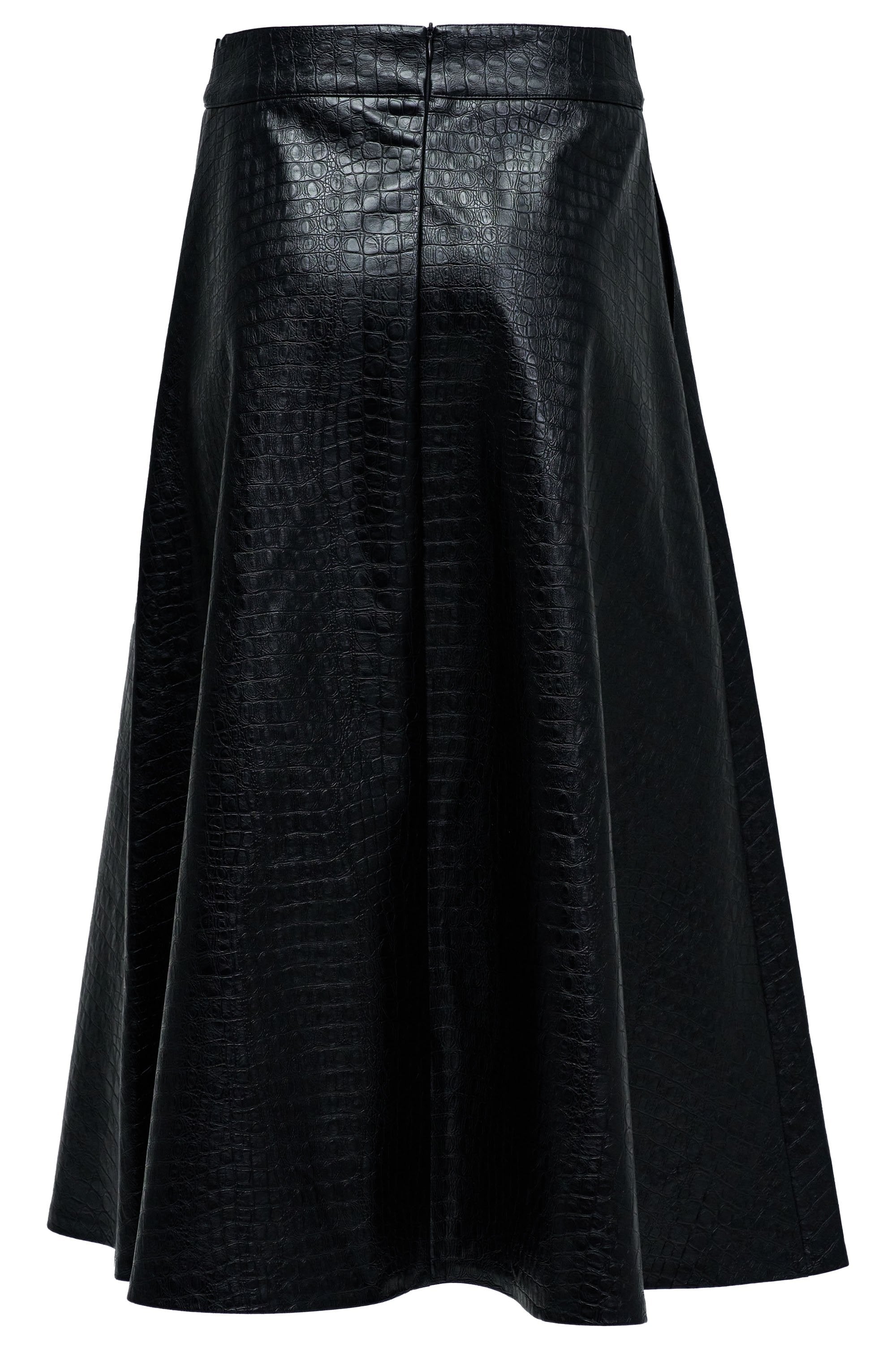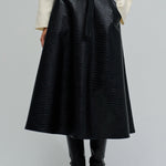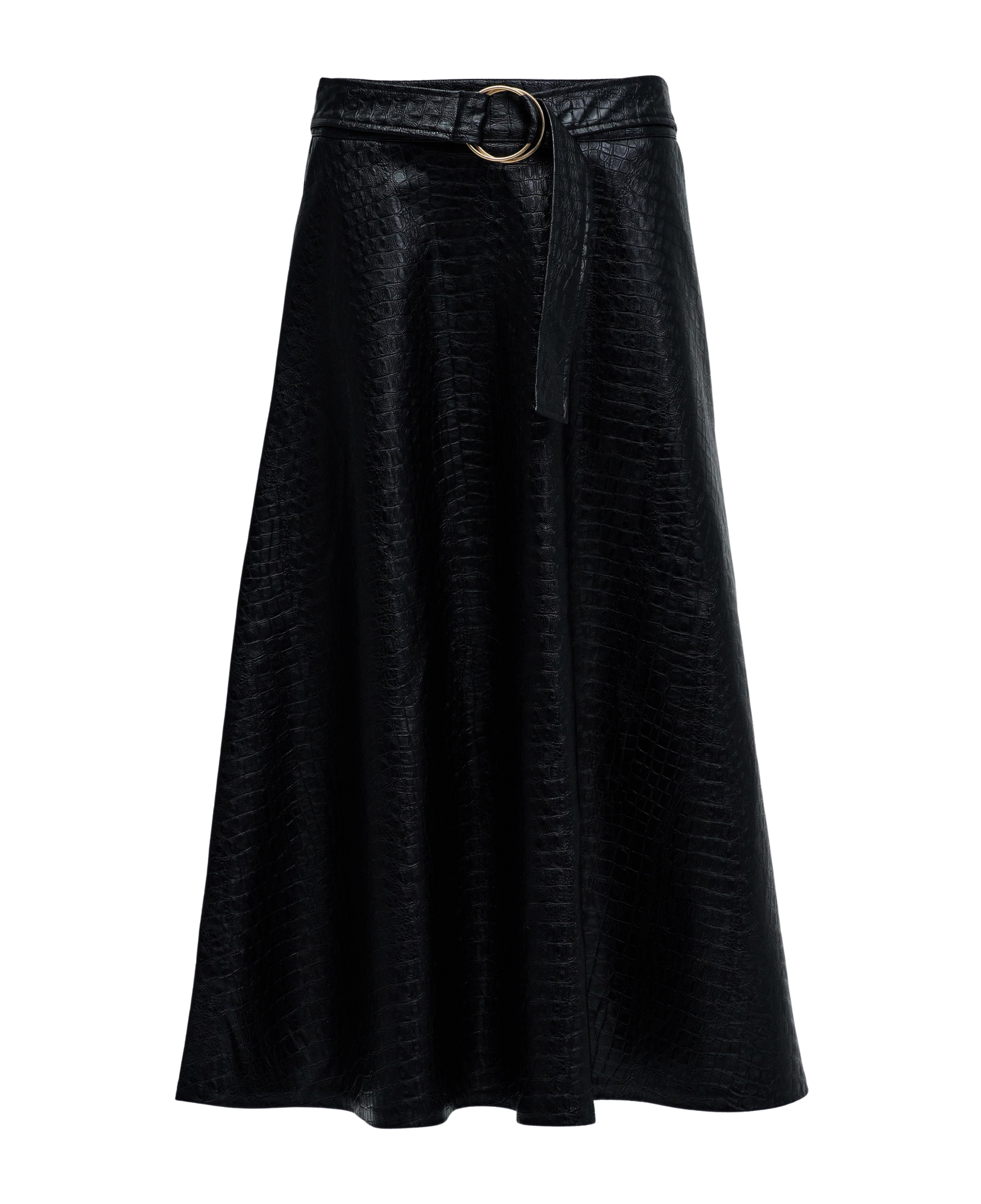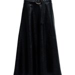 En esta falda midi de efecto piel, el invierno encuentra su expresión más envolvente. El negro profundo, con textura de cocodrilo, traduce la intensidad de quien avanza con confianza. El cinturón con hebilla metálica marca la cintura con un toque elegante y sutil. El corte midi y el ajuste regular crean un movimiento fluido, pensado para acompañar cada paso con ligereza y actitud. Forrada para mayor comodidad, con bolsillos discretos y cierre trasero, es una prenda que une estilo y confort. Perfecta para contrastar con tejidos suaves o con camisas de corte preciso, es la prenda que transforma el look y afirma la temporada.