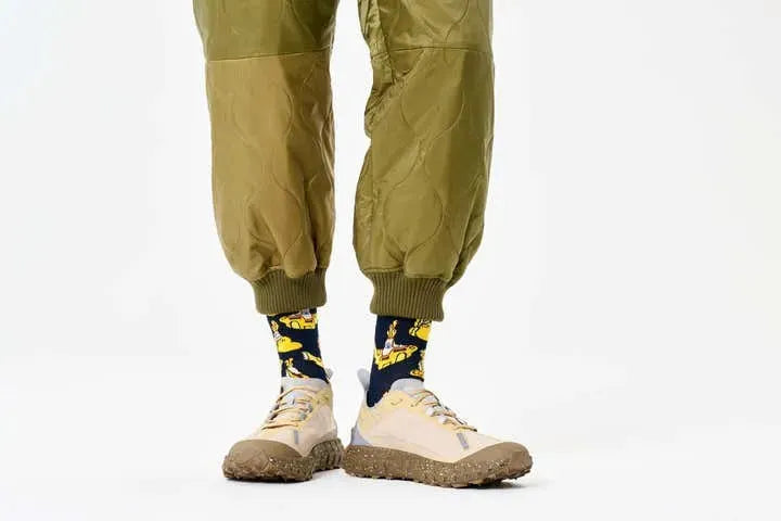 Puede que no todos vivamos en un submarino amarillo, ¡pero ahora todos podemos tener a nuestros pies el icónico Yellow Submarine con todos los miembros de los legendarios rock'n'roll The Beatles! Disfruta de esta obra de arte de la alucinante animación y navega hacia el sol mientras imaginas tu propio viaje submarino. Edición limitada de la colección Happy Socks x The Beatles. Hechos de algodón orgánico peinado.