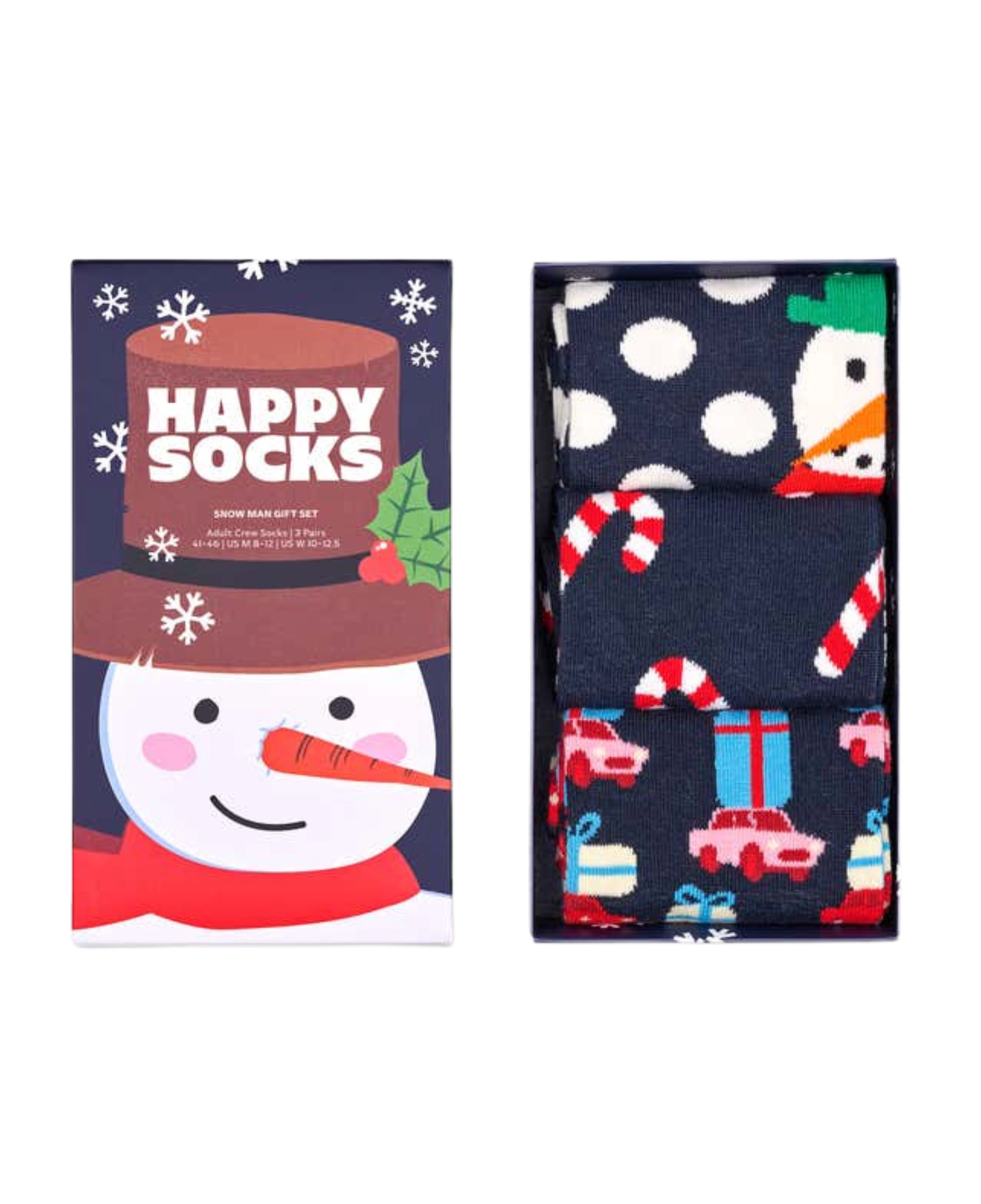 El pack 3-Pack Holiday Navy Gift Set de Happy Socks reúne tres pares de calcetines festivos con fondo azul marino, diseñados para aportar alegría a la temporada invernal. Confeccionados con una mezcla de 86 % algodón, 12 % poliamida y 2 % elastano. Cada par incluye un diseño navideño único (por ejemplo muñeco de nieve, nieve, motivos de invierno) sobre base azul, ideal para regalar o para incorporar un detalle con carácter a tu armario.