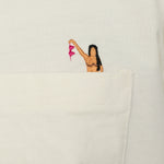 Sobre el bolsillo se encuentra un pequeño bordado con un diseño sutil y colorido, aportando un punto distintivo sin resultar excesivo.