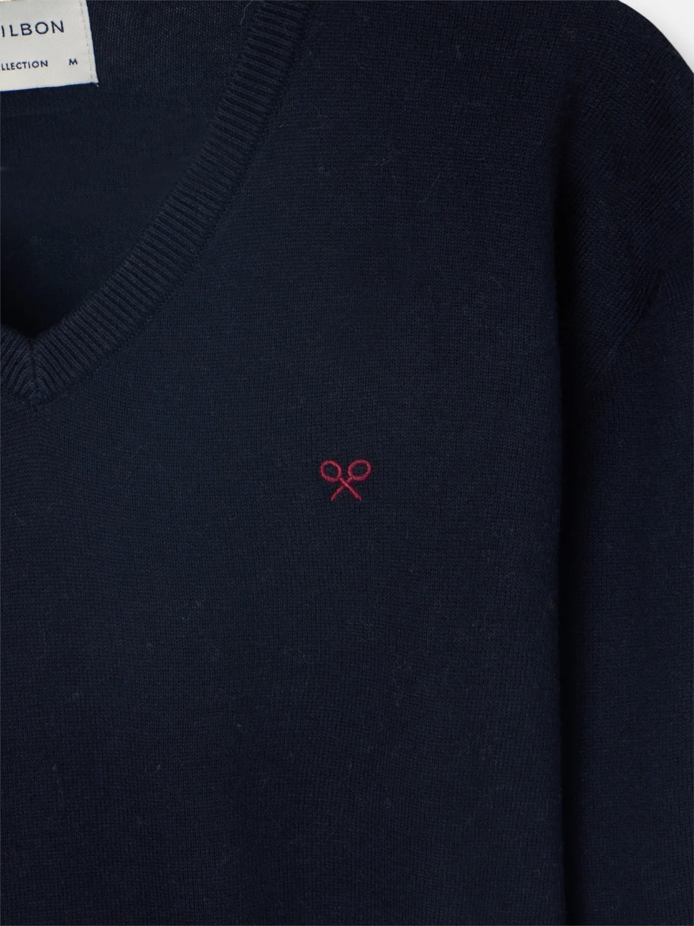 El diseño incluye un bordado de raquetas en el torso, aportando sutilidad deportiva y carácter atemporal. El cuello pico potencia una silueta más pulida que el jersey básico, ideal para looks urbanos cuidados o capas funcionales bajo una chaqueta informal.