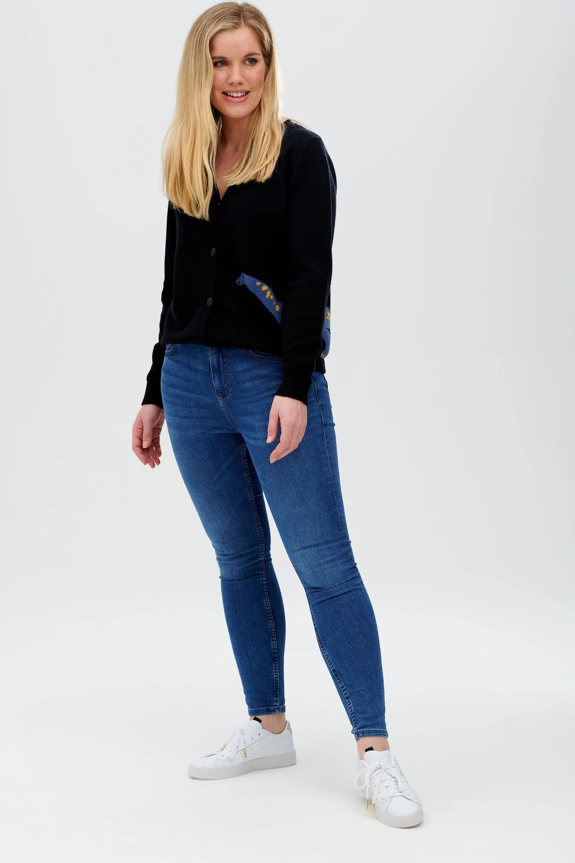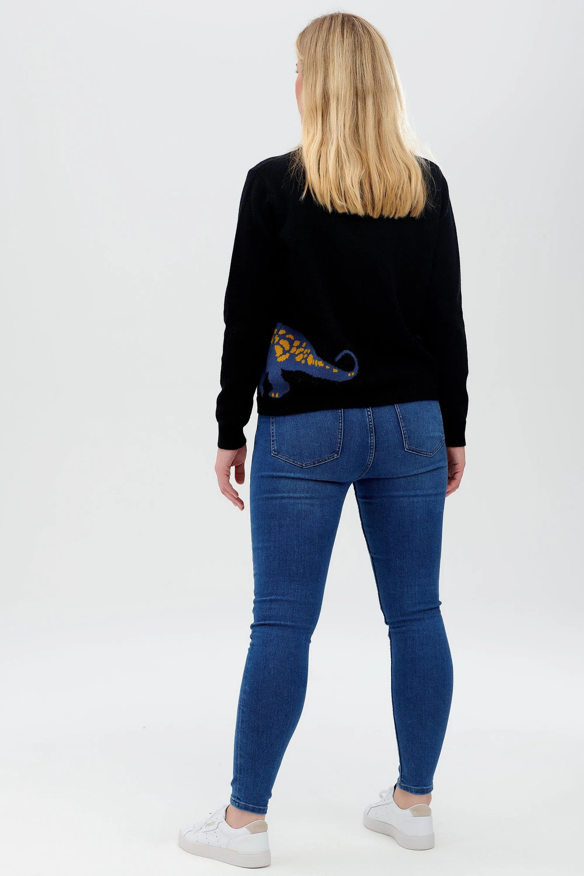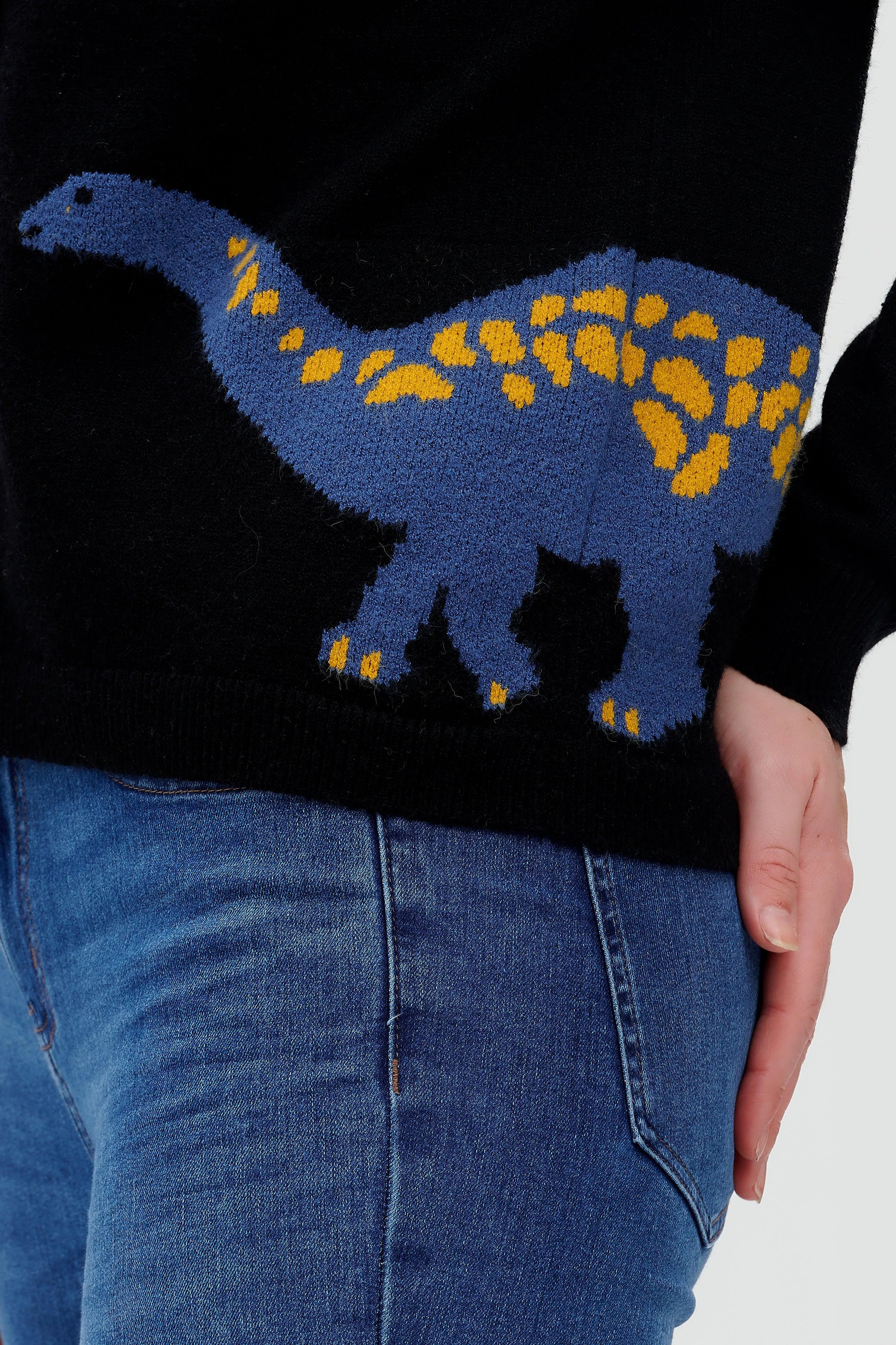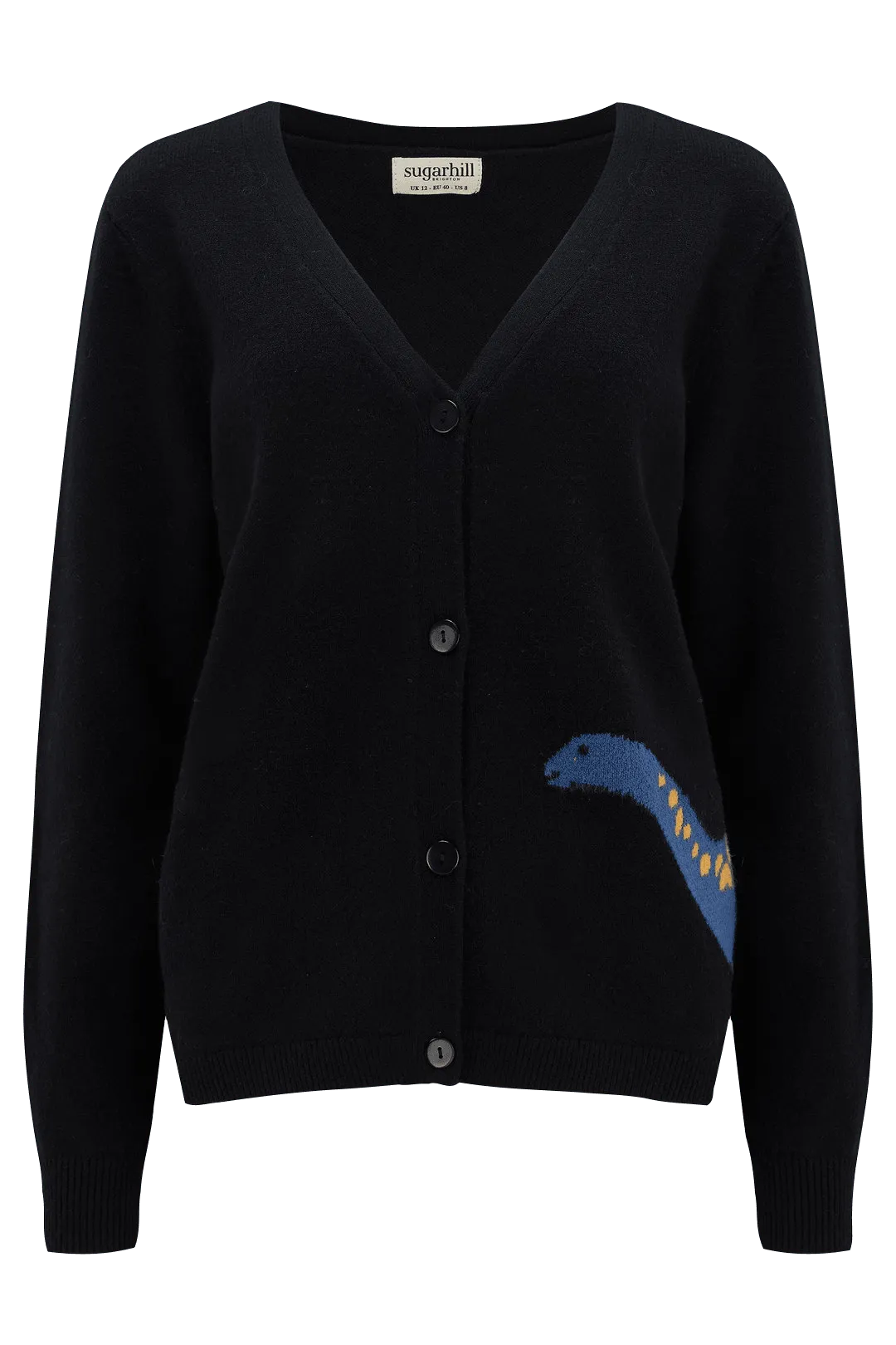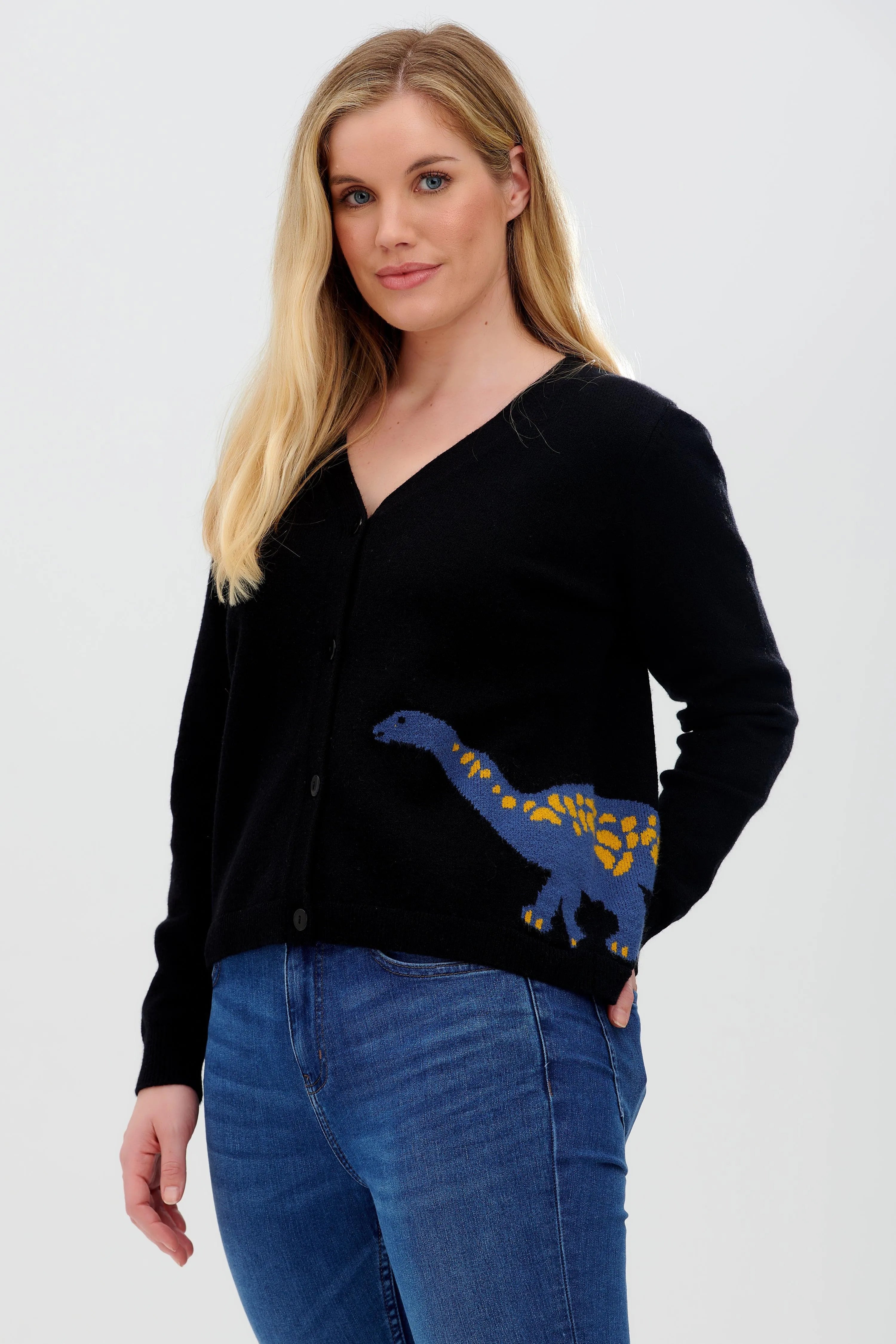 Una palabra; Dinosaurios El nuevo Jennifer Cardigan tiene una forma delgada y favorecedora, un escote en V profundo, puños de canalé y un funcional botón en la parte delantera. Este cárdigan luce una intarsia de dinosaurio envolvente sobre una base negra simple, con botones negros. Use este cárdigan abotonado como un suéter con cuello en V o abierto en capas sobre su vestido favorito (con suerte con estampado de dinosaurio).