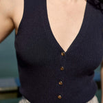 El chaleco Mayelle combina un corte recto ajustado con la suavidad de una mezcla de viscosa, elastano y poliamida, lo que ofrece una comodidad óptima y una silueta estilizada. Su corte sin mangas y su escote en V realzan la feminidad con sobriedad, mientras que la botonadura central adornada con botones dorados aporta un toque refinado y luminoso. Fácil de llevar en capas, Mayelle realza todos tus conjuntos, desde la oficina hasta las salidas, con una elegancia discreta y contemporánea.