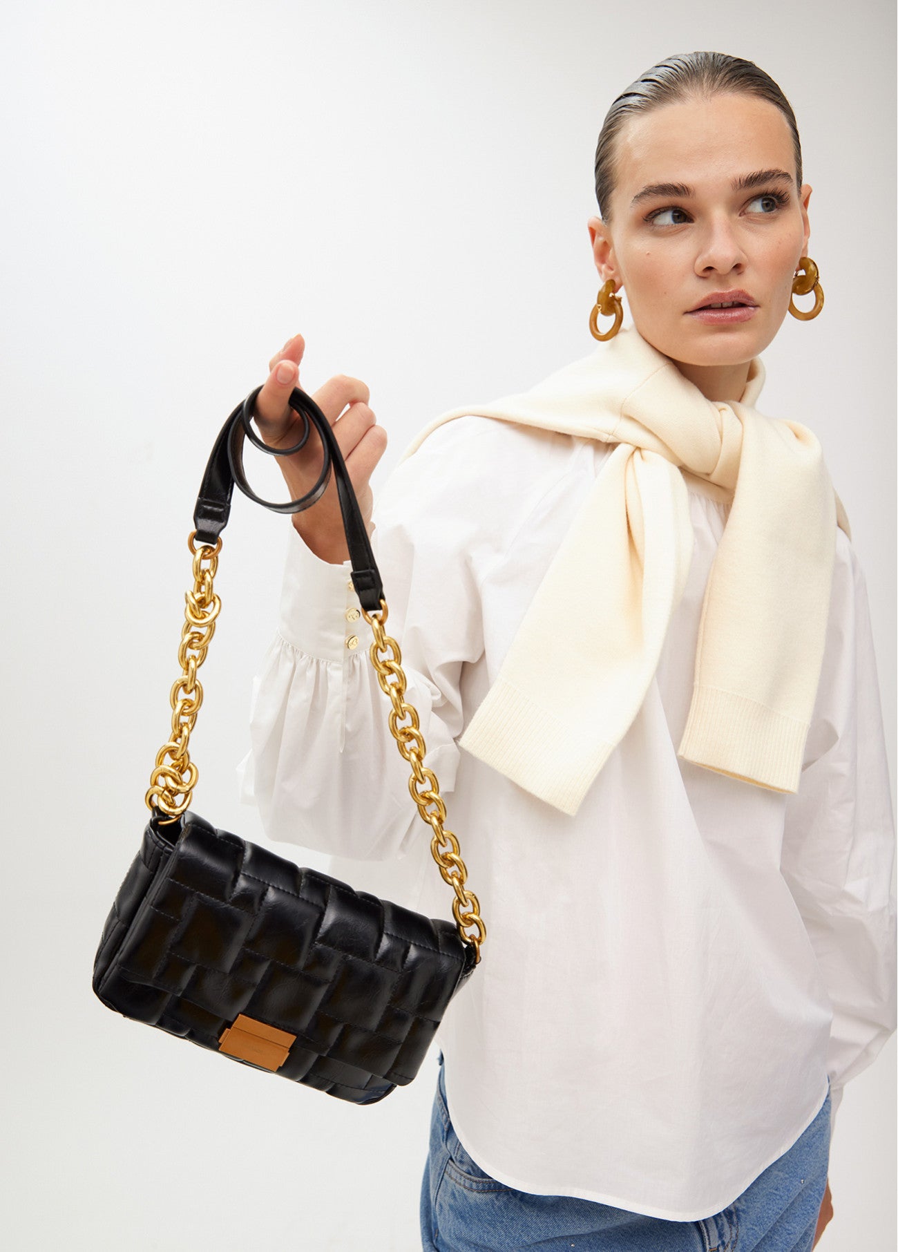 Elegante bandolera acolchada en polipiel con cierre automático personalizado. Cadena dorada y correa ajustable. Interior forrado con compartimentos prácticos para organizar tus pertenencias esenciales. Diseño moderno ideal para cualquier ocasión.