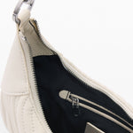 Bolso mediano de forma ovalada con correas intercambiables, una corta y otra mas larga de estilo bandolera, estampado de pespuntes bordados en los mismos tonos y aplique de logo metálico.