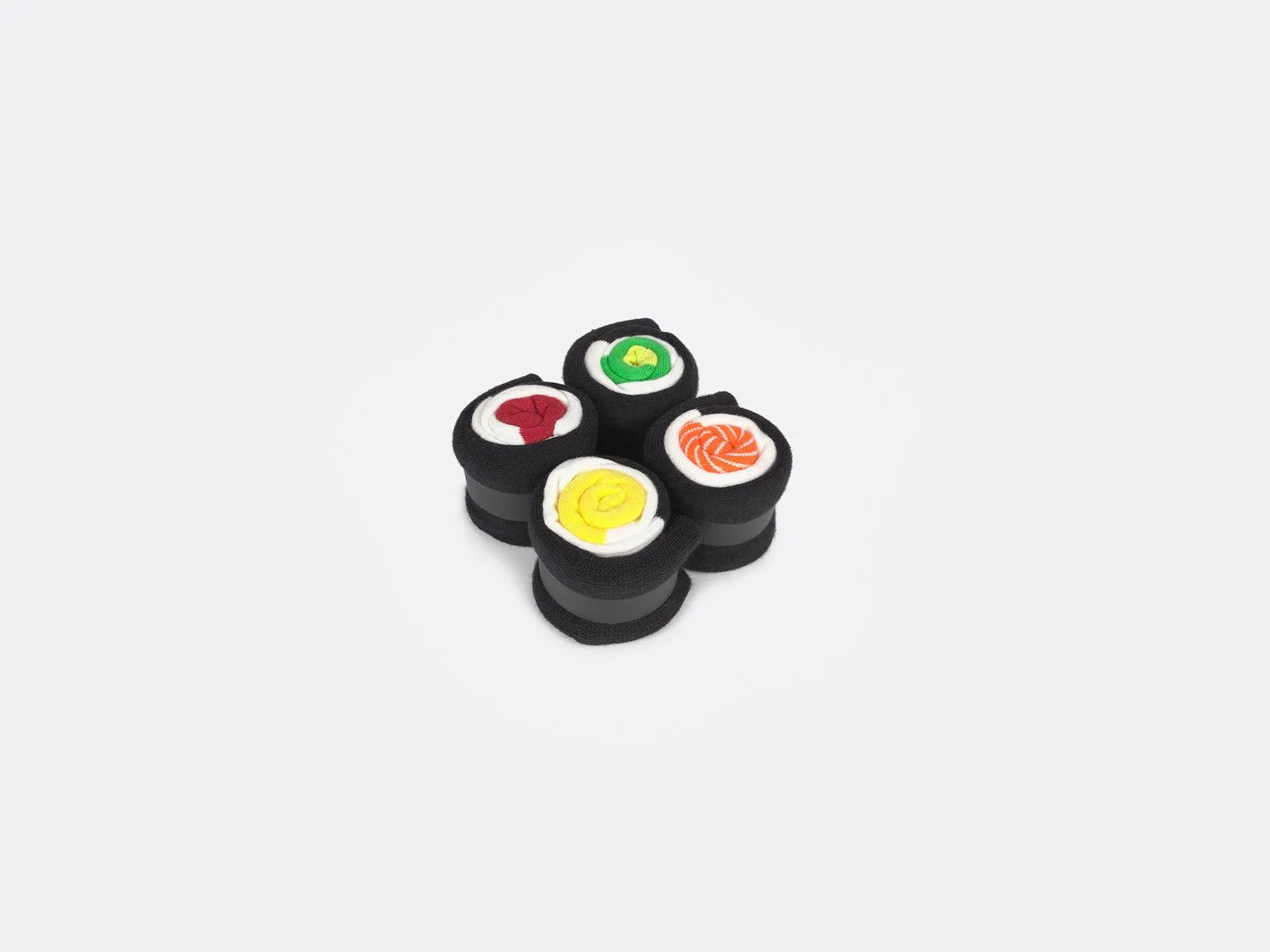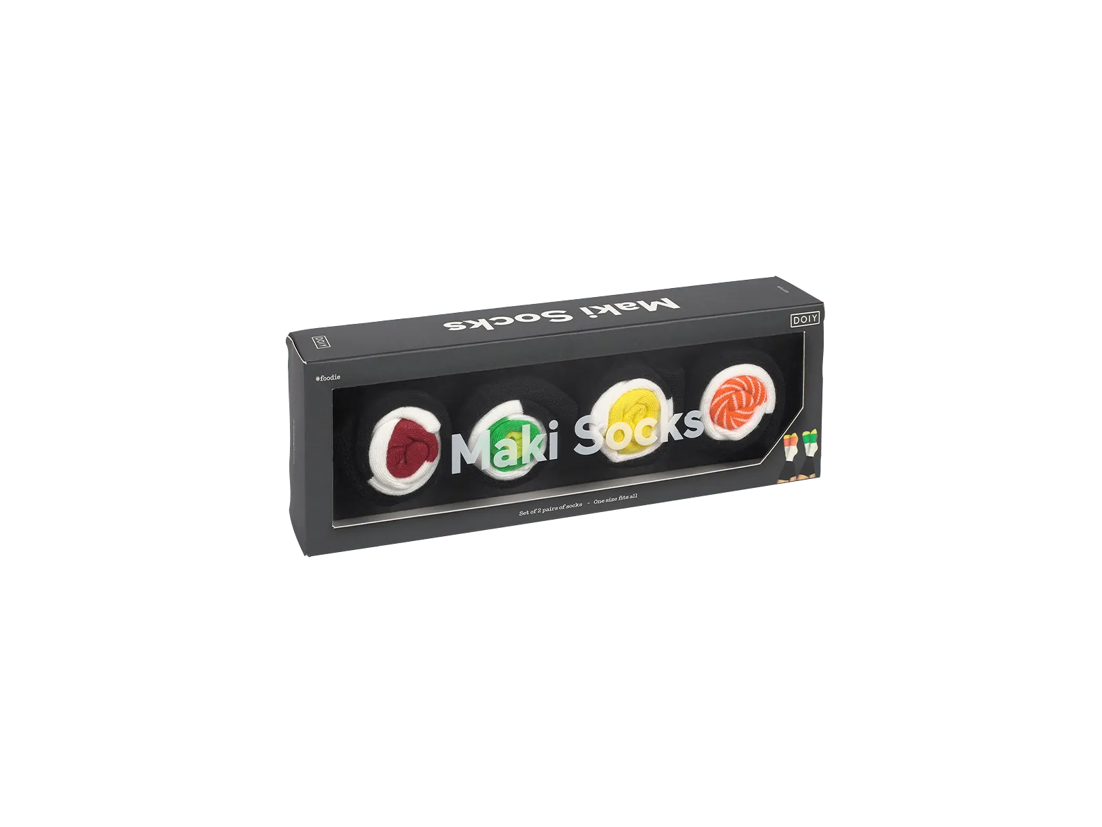 Entretenido y cómodo juego de 2 pares de calcetines en forma de bandeja de maki. Talla única.