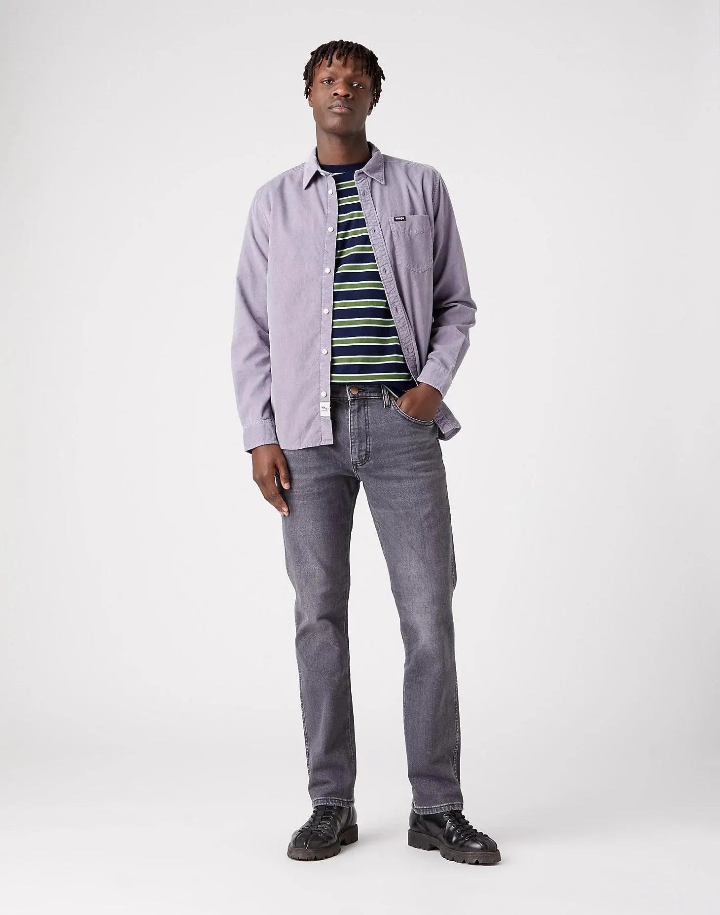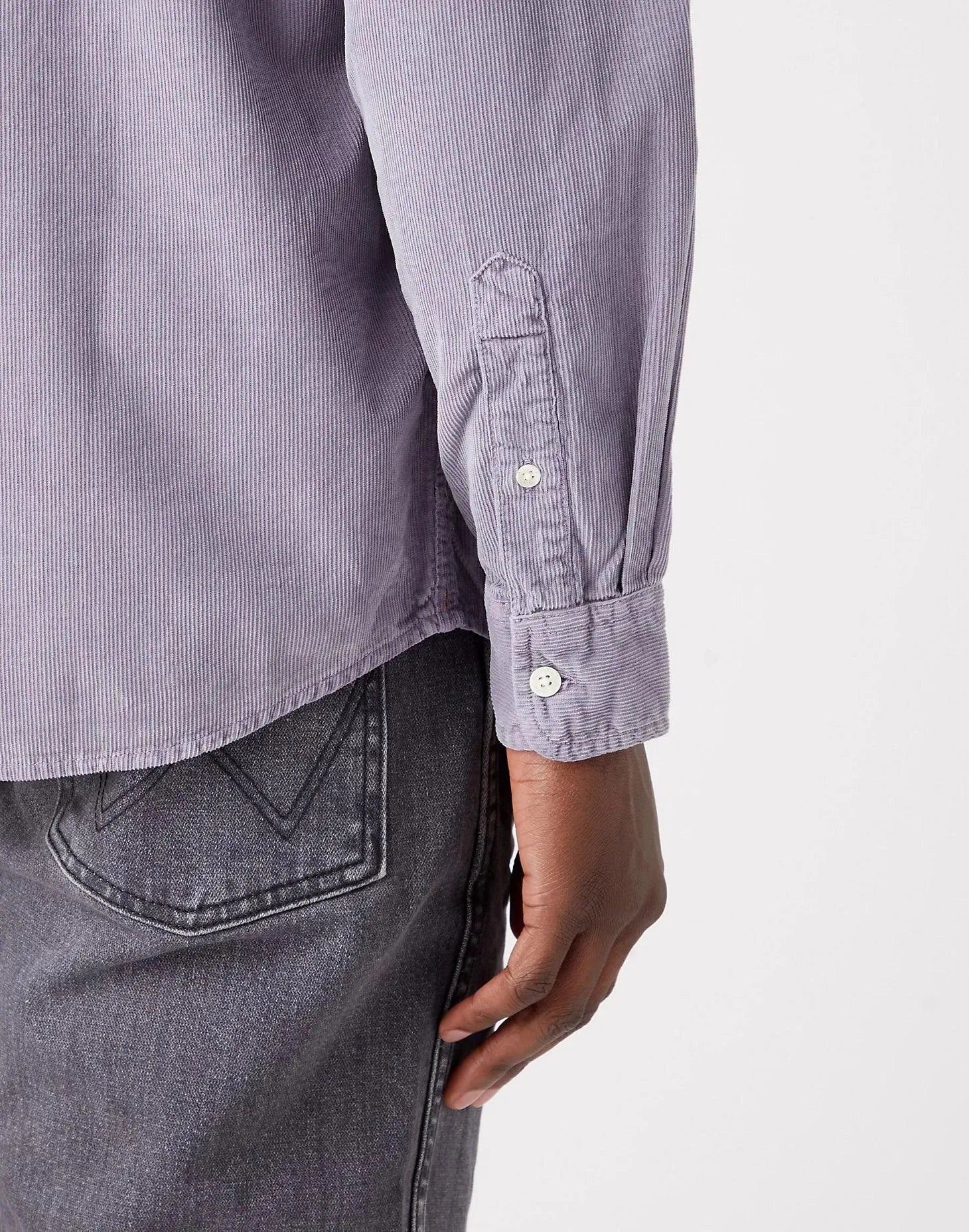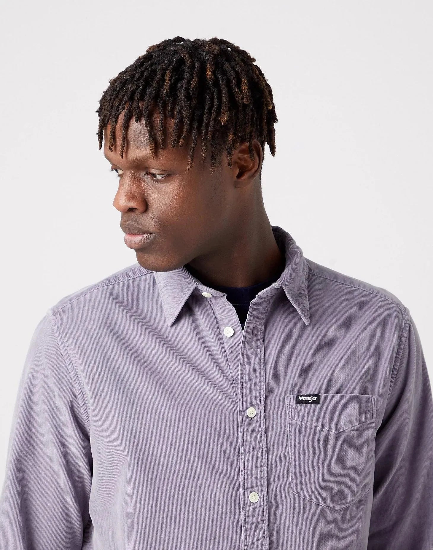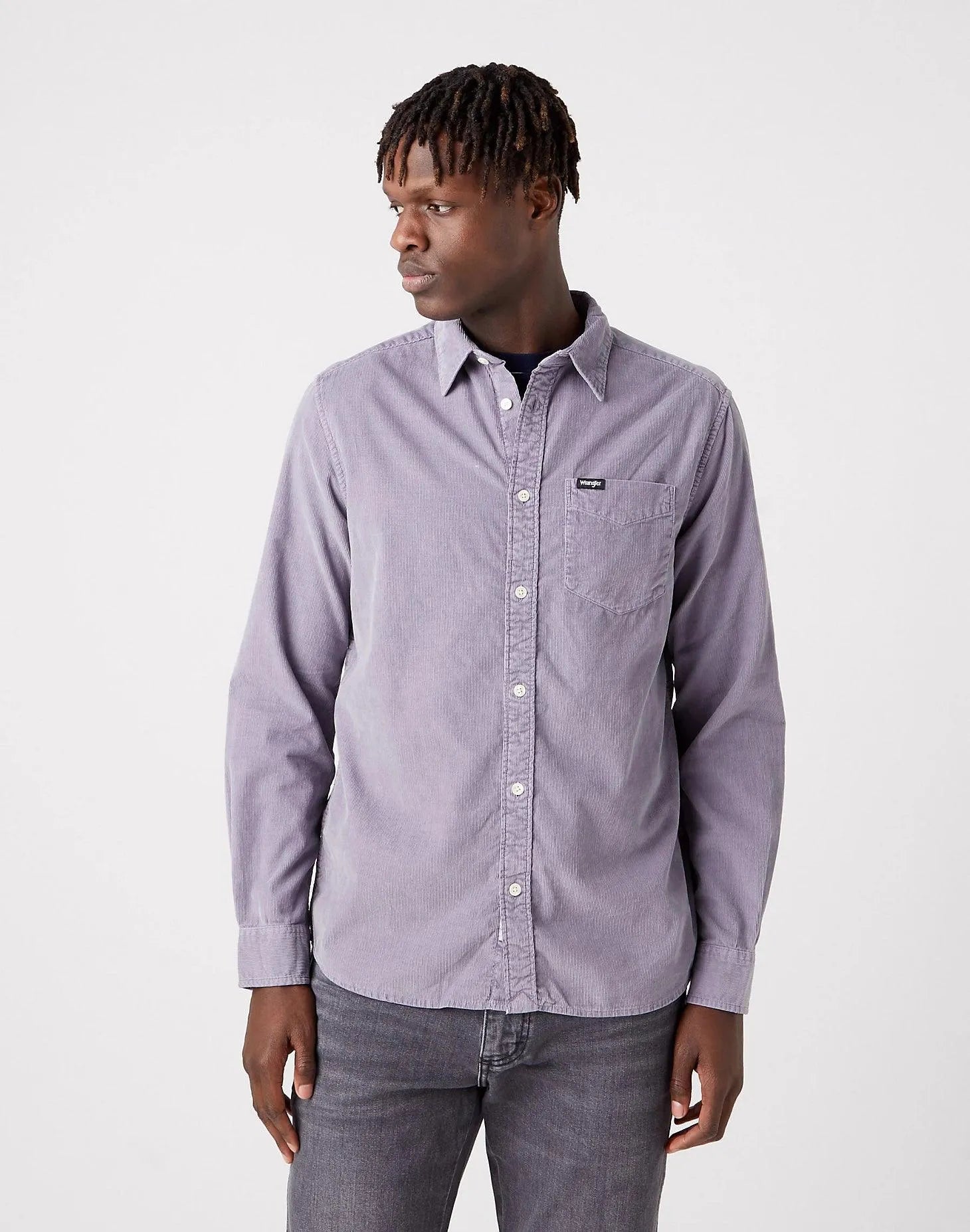 Vístete sencillamente con esta camisa clásica de manga larga con un bolsillo en pana de color lila, cuello de pico y puños abotonados.