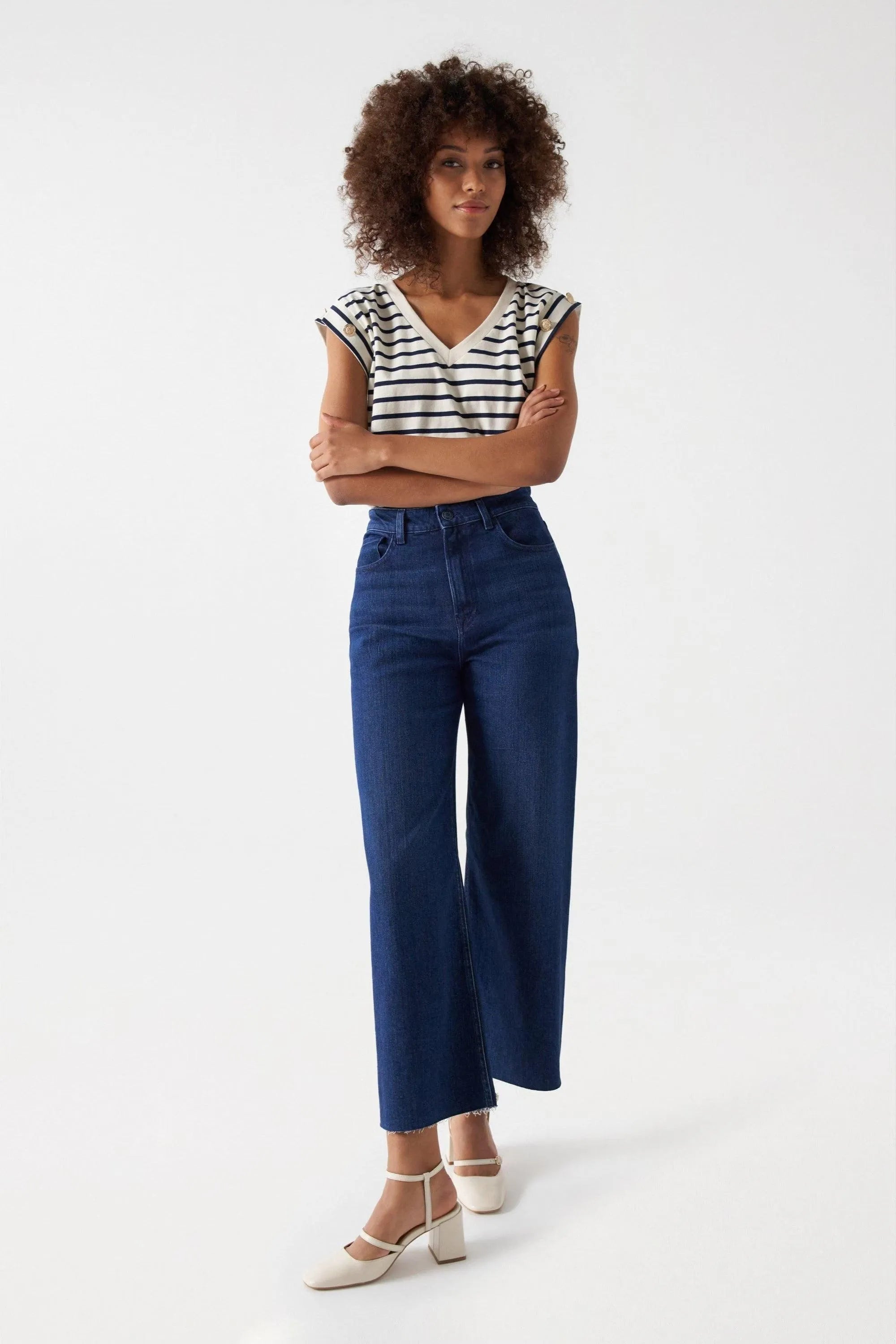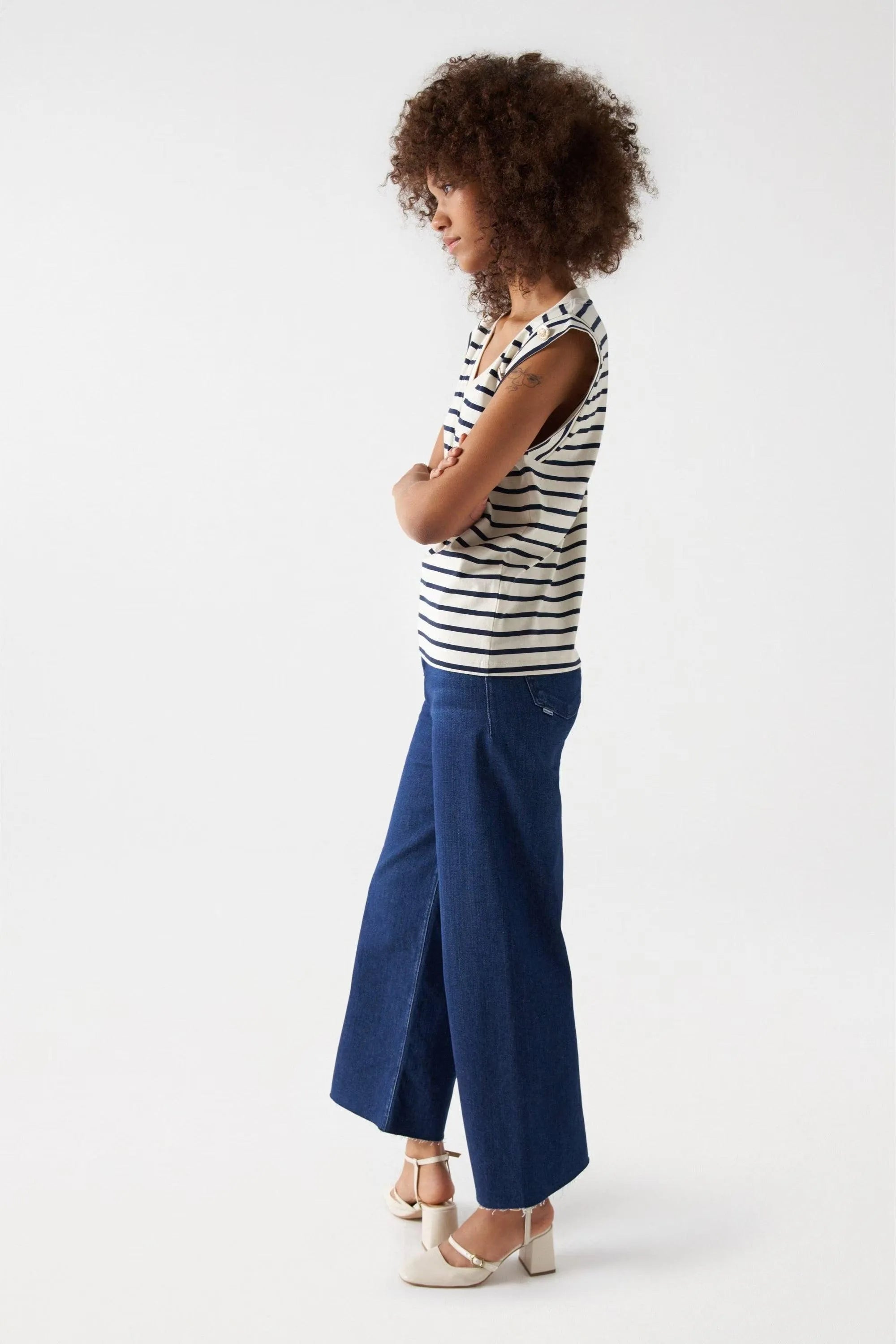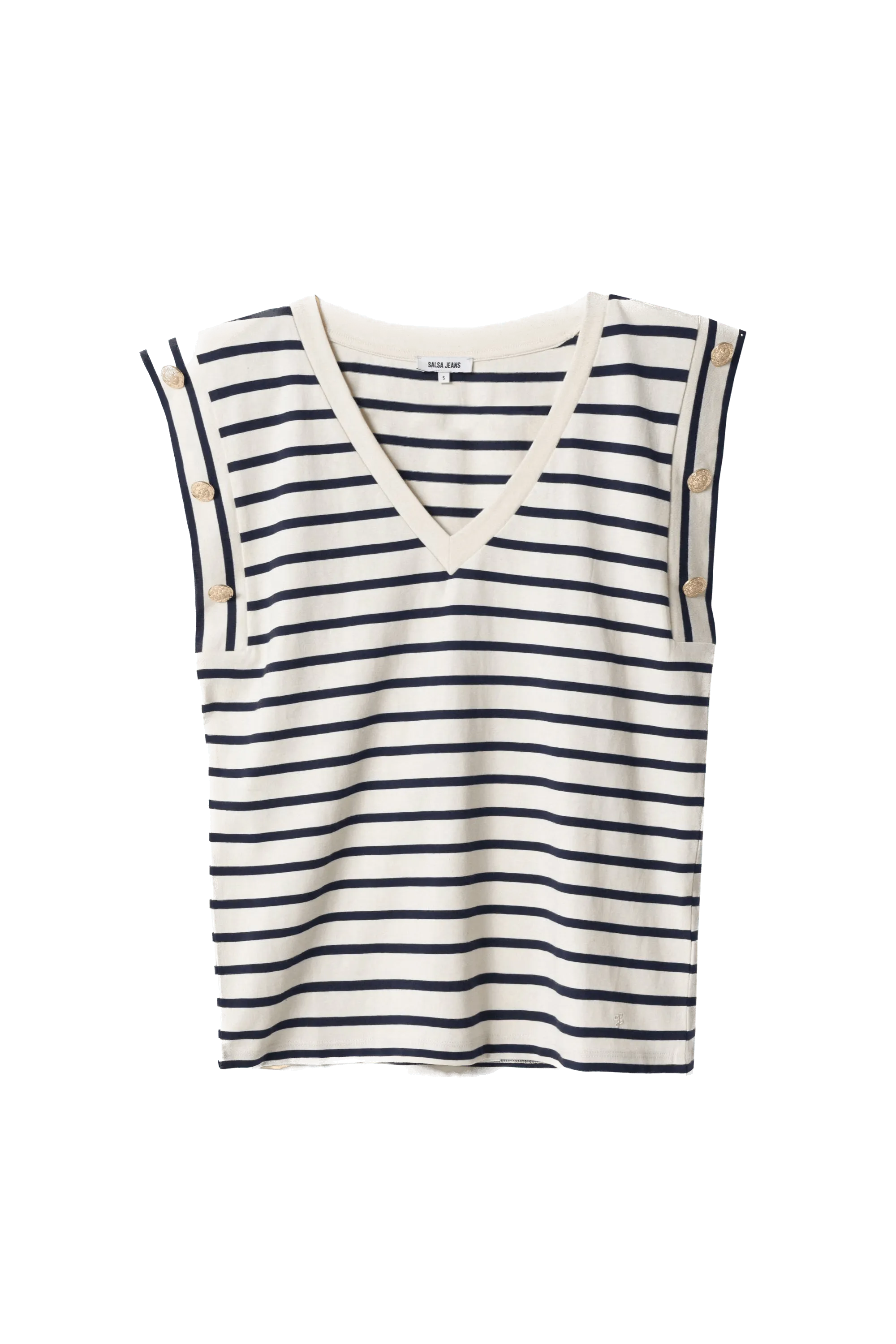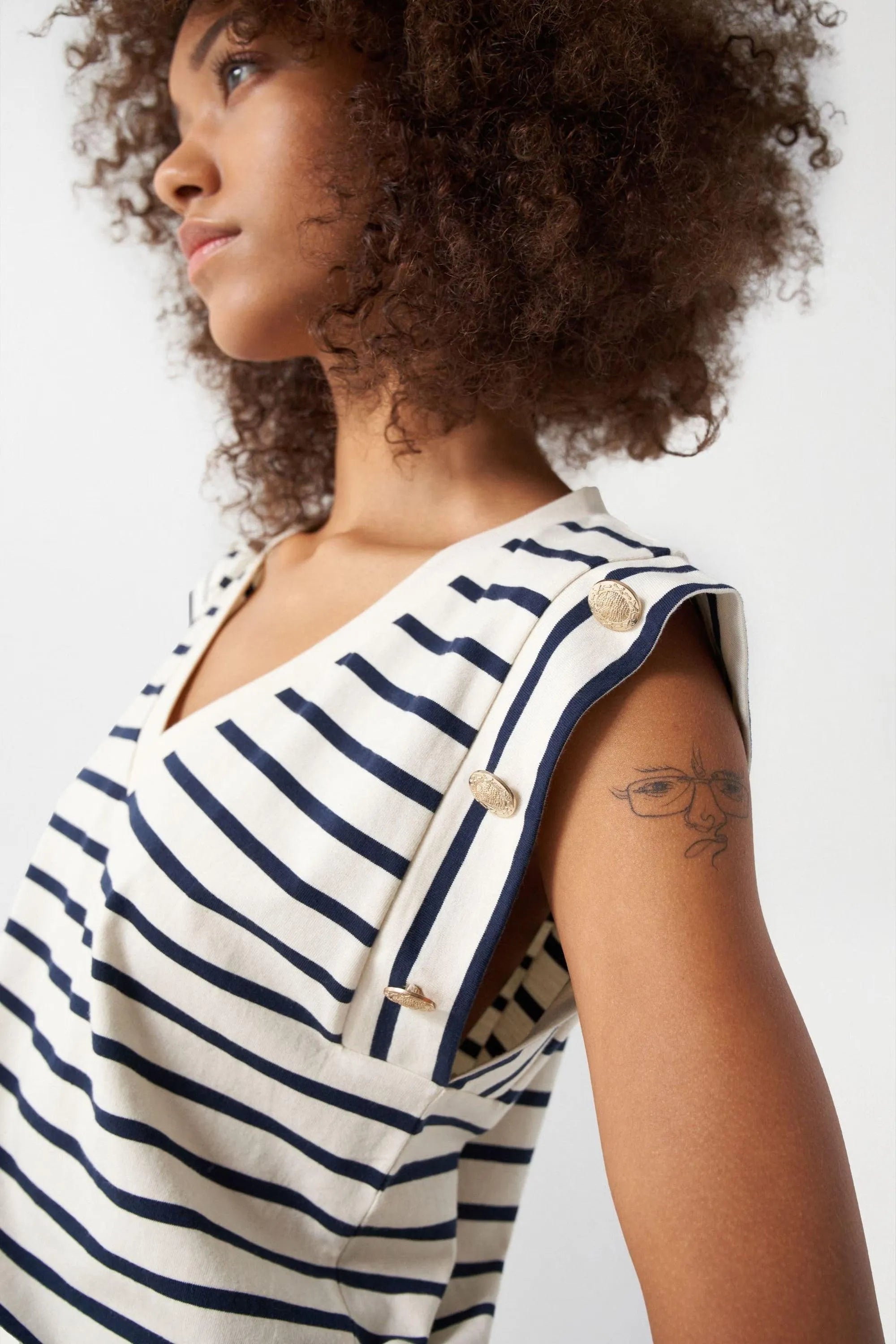 Camiseta de rayas. Color base beige con rayas horizontales azul oscuro. Ajuste regular. Manga sin mangas con botones dorados. Cuello en pico.