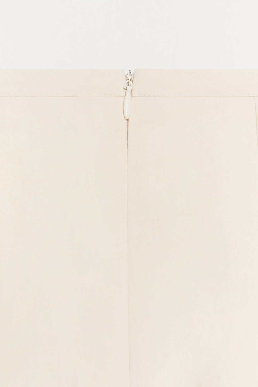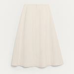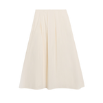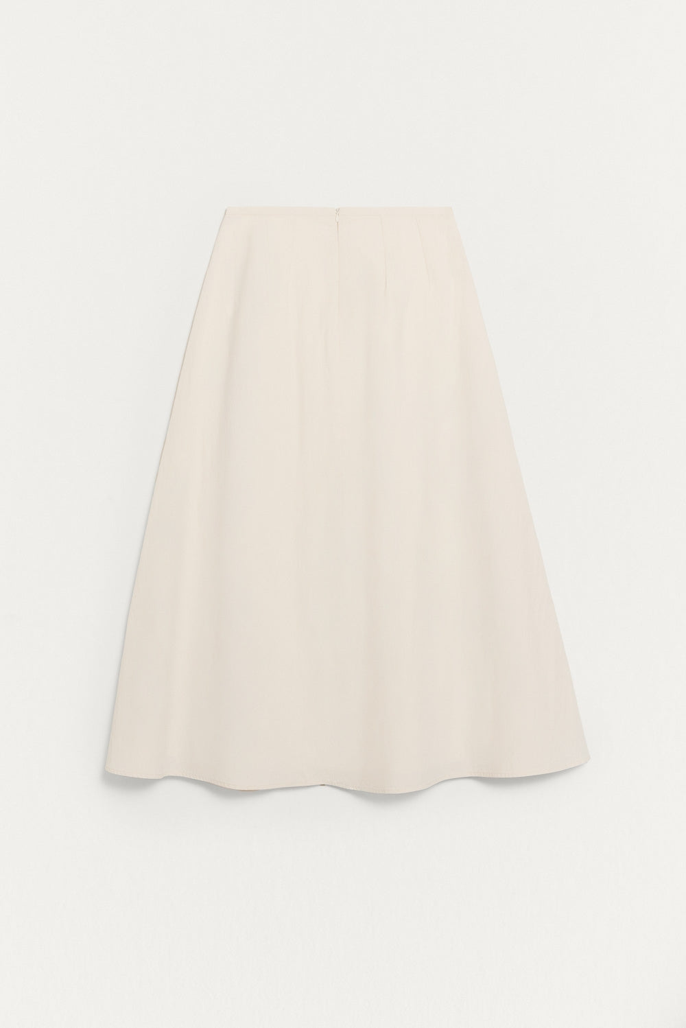 Falda midi vuelo. Tejido mezcla algodón y poliamida. Tiro medio. Con cinturilla. Dos bolsillos laterales. Cierre de cremallera oculta en la parte trasera. Con forro voile. Fitting ligeramente abullonado.