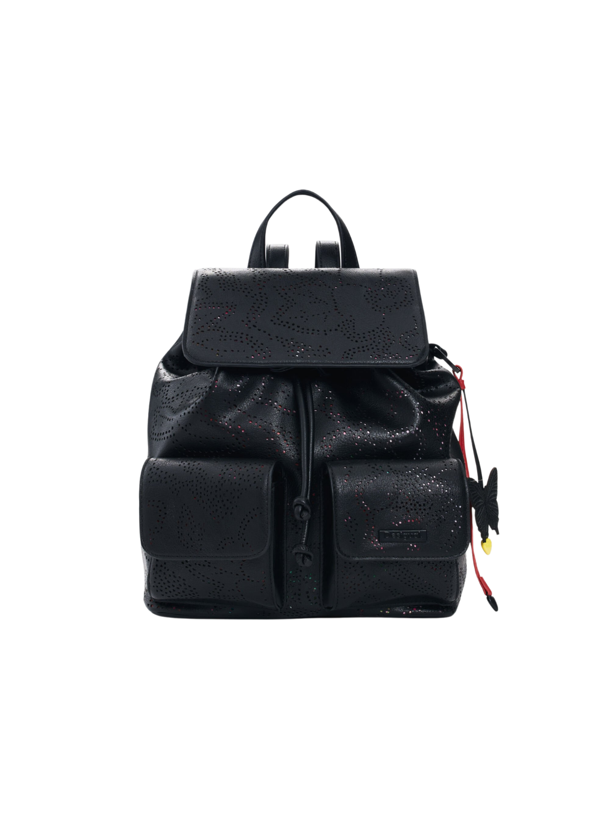 Mochila pequeña con dos bolsillos delanteros, detalles troquelados en forma de flor y cierre de cordón ajustable.