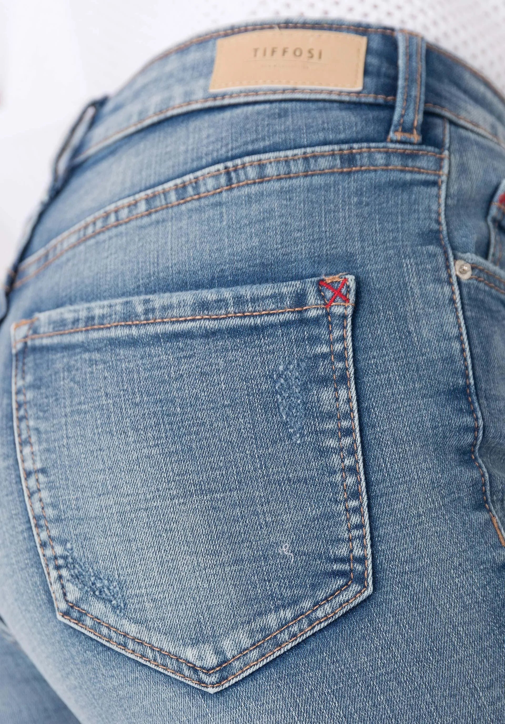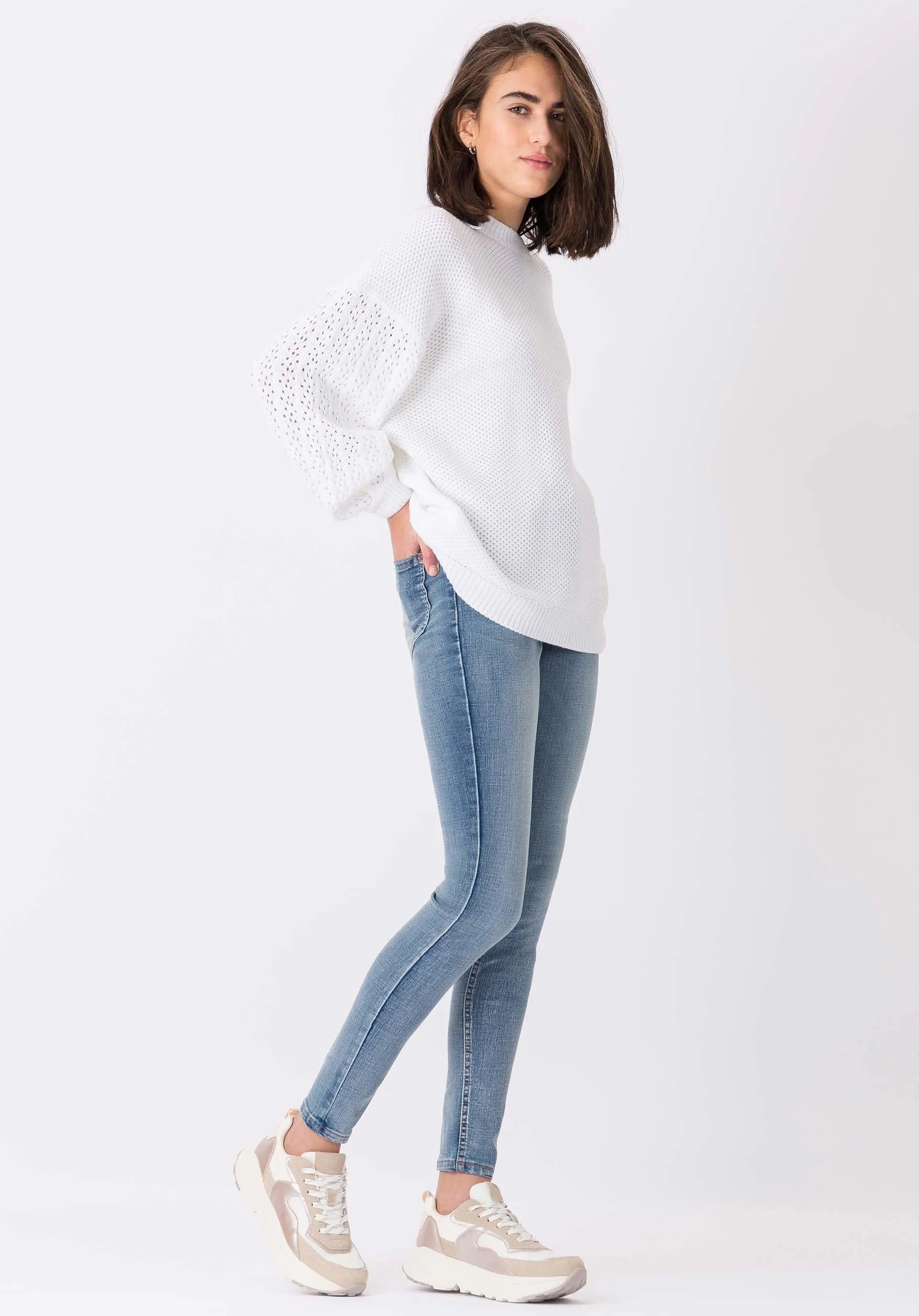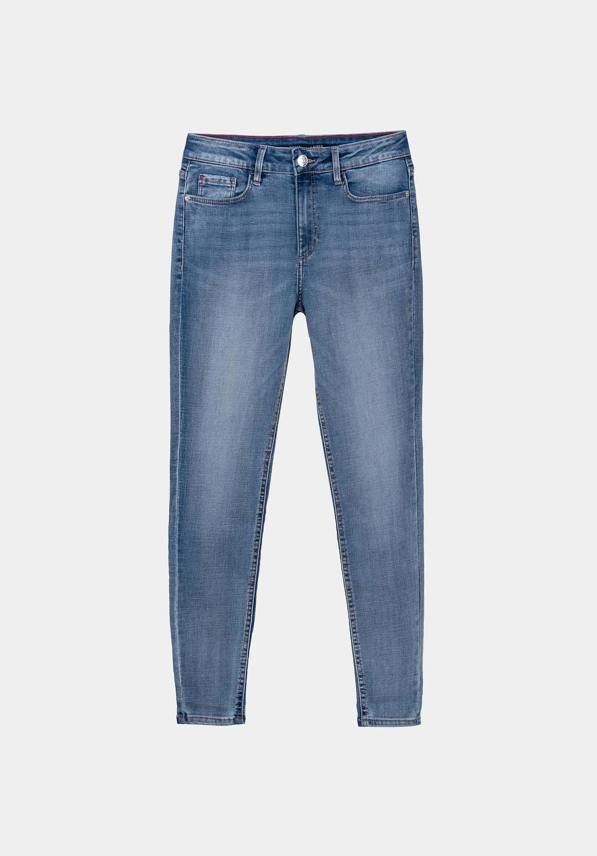 Jeans ajustados de tiro alto con cinco bolsillos. Cierre frontal con cremallera y botón metálico. Efecto lavado.