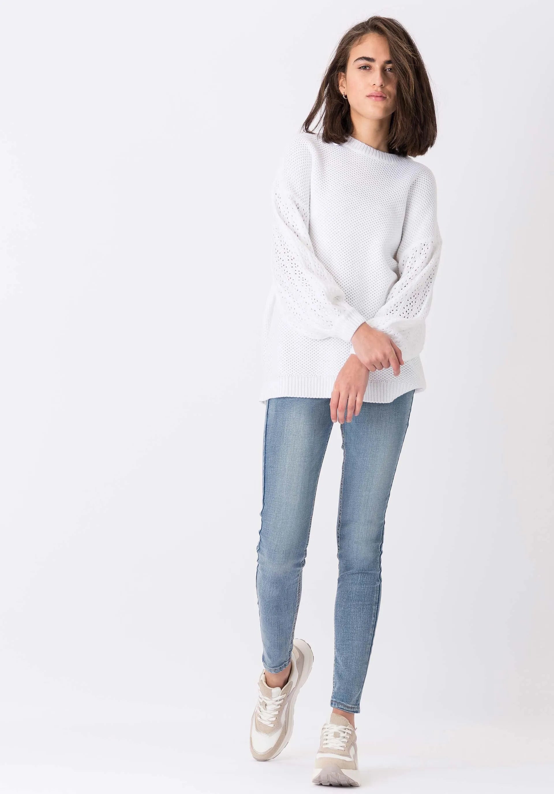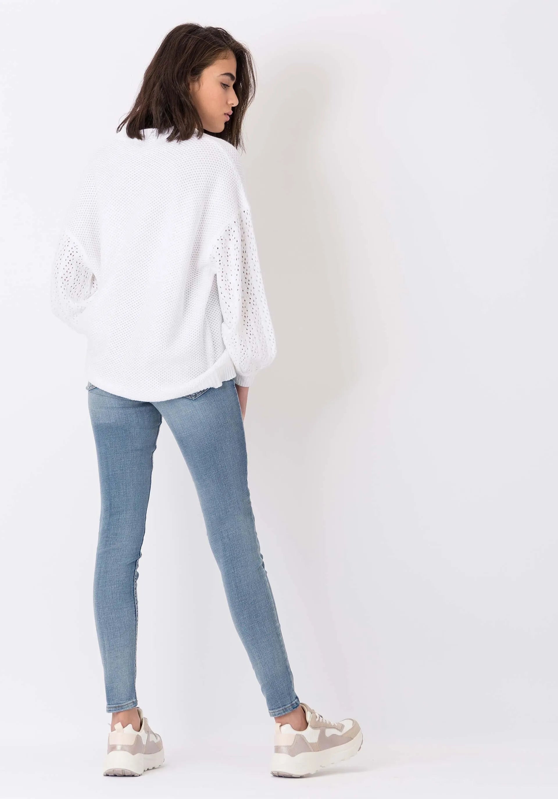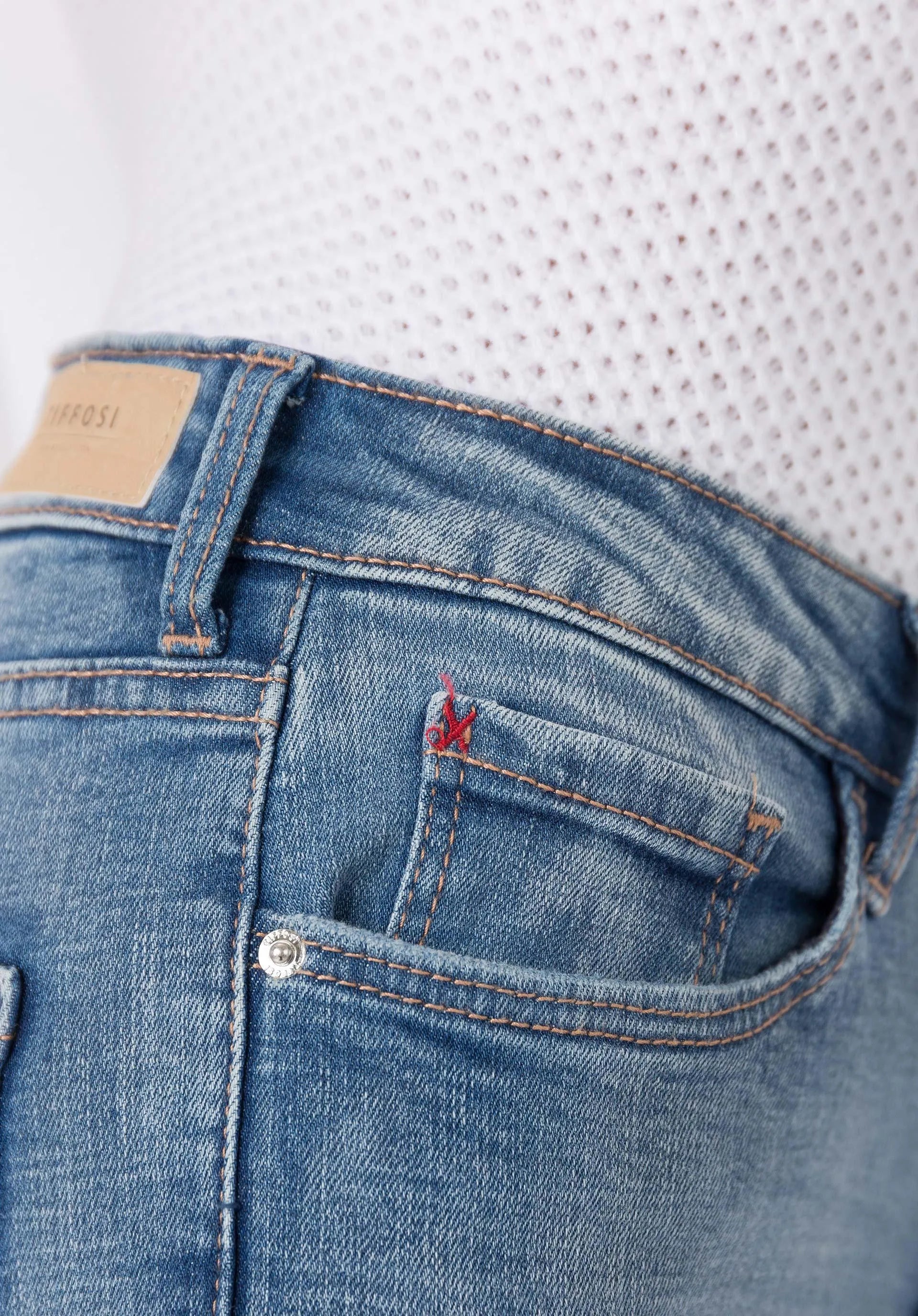 Jeans ajustados de tiro alto con cinco bolsillos. Cierre frontal con cremallera y botón metálico. Efecto lavado.