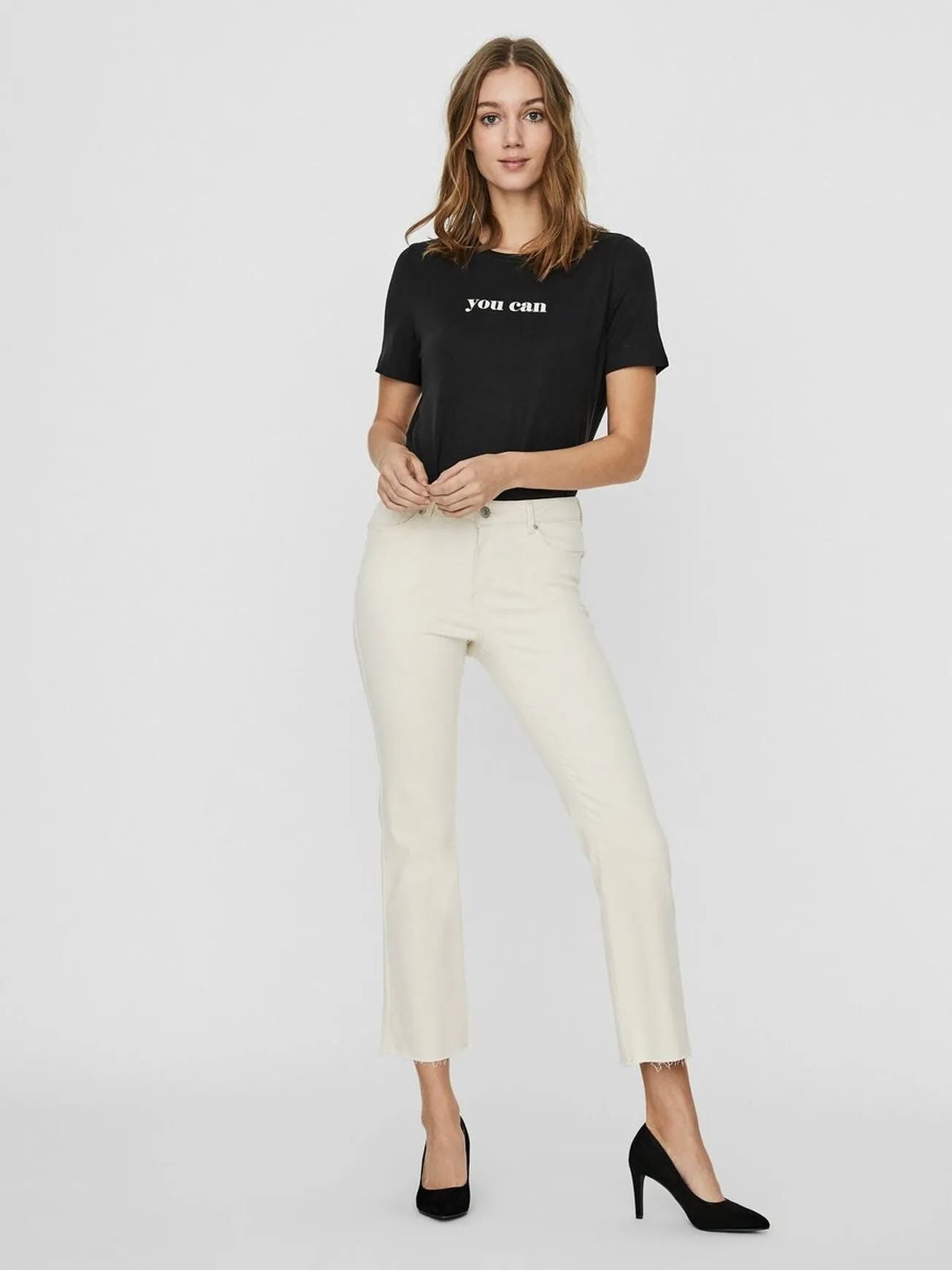 Jeans con piernas acampanadas, cintura normal, cinco bolsillos y tobillos deshilachados. Diseña los jeans con una blusa femenina y un par de botas de tacón alto.