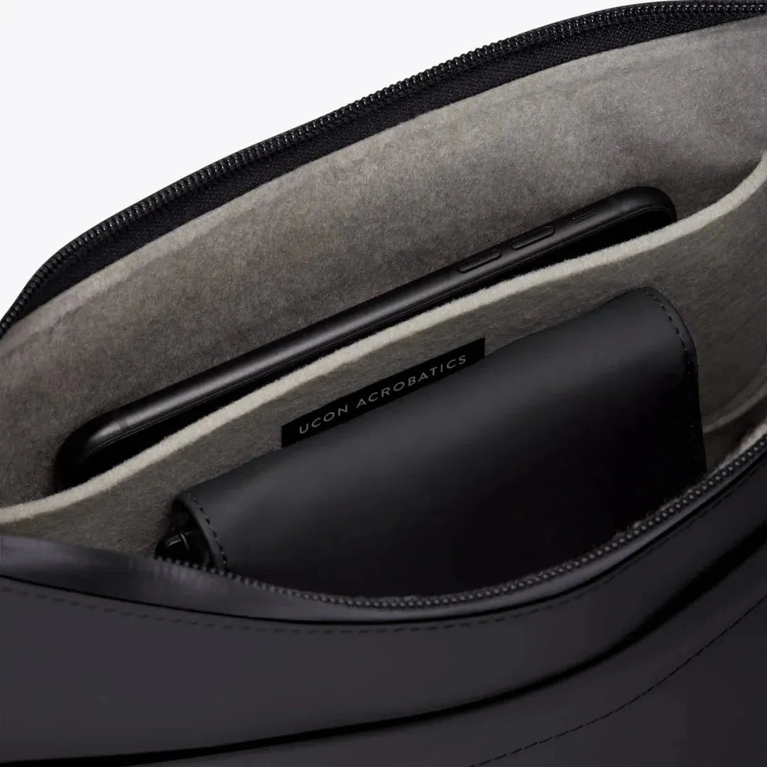 La serie Lotus Infinity está confeccionada en PUrTEX∞, un material tecnológico ultraduradero desarrollado por Ucon Acrobatics a lo largo de varios años. Está fabricado con residuos textiles reciclados y acabado con un revestimiento rígido de poliuretano (PU) sin disolventes.