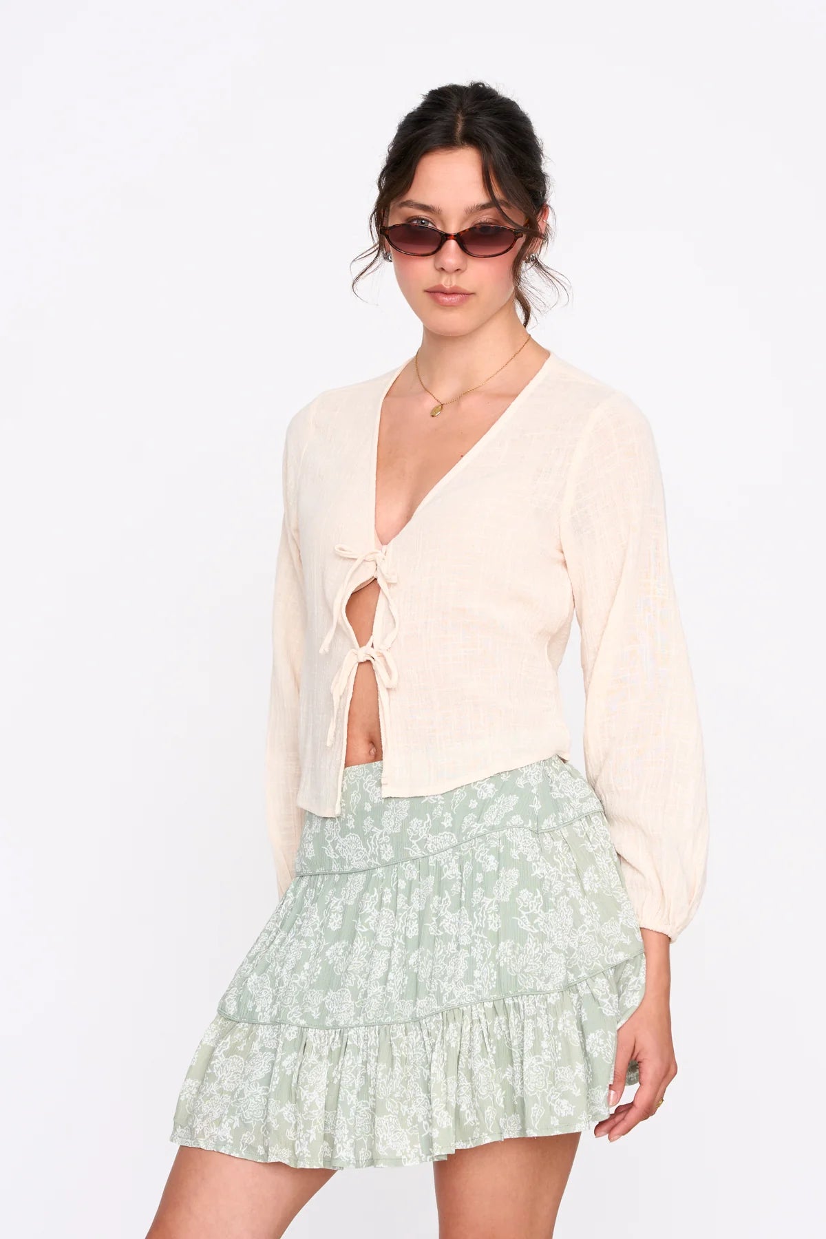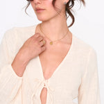 El diseño apuesta por una construcción limpia, con líneas sencillas que favorecen la versatilidad. Es una blusa pensada para adaptarse a diferentes contextos sin exceso de elementos.