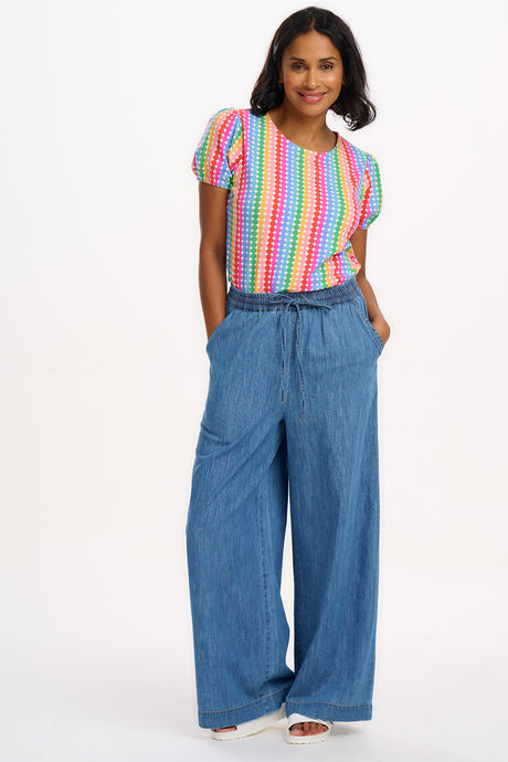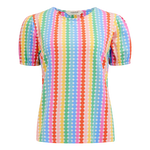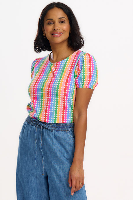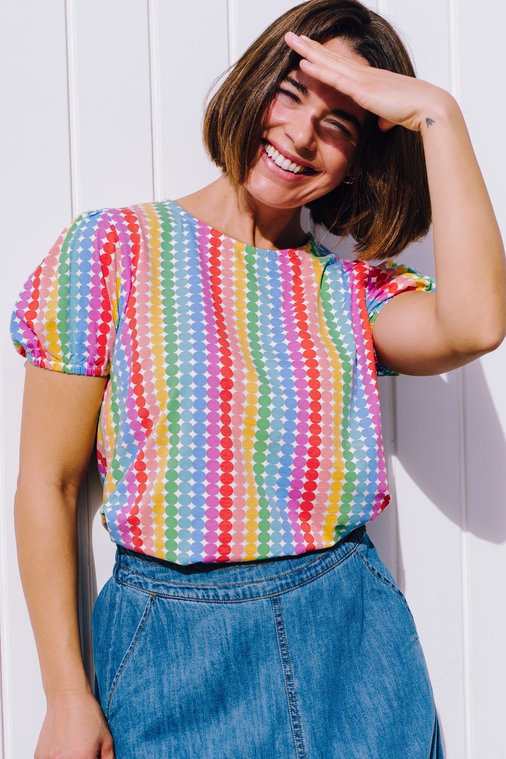 La Lexley Top es una camiseta relajada de punto con un sencillo escote redondo y alegres mangas cortas abullonadas. Presenta el nuevo estampado Rainbow Circles de coloridos círculos arco iris sobre una base de color hueso.