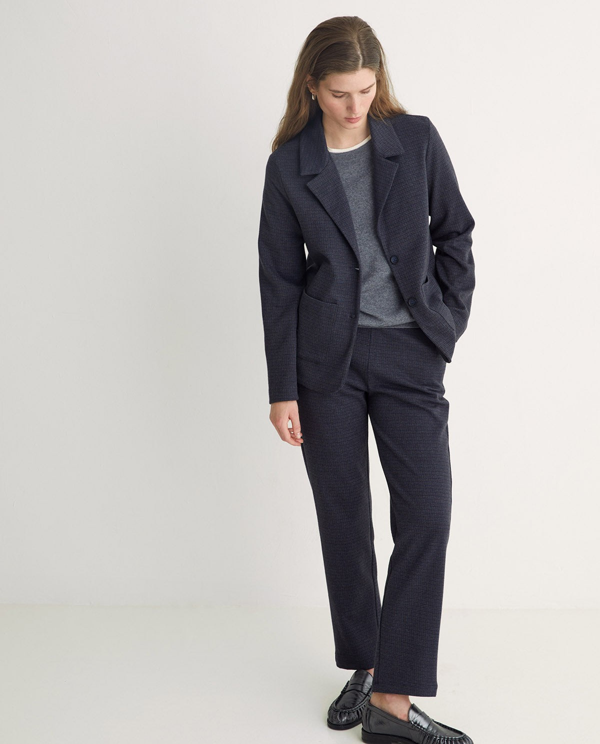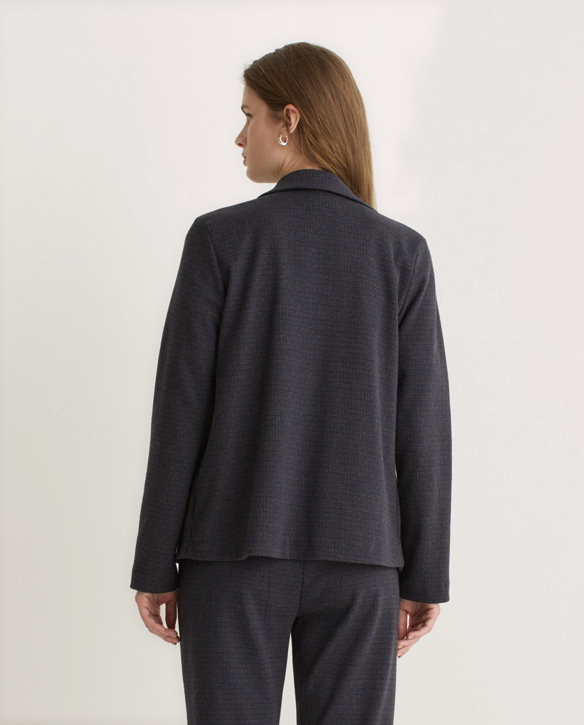 Blazer Jacquard de punto. Regular fit. Estampado de cuadros. Sin forro. Cuello solapa. Manga larga. Cierre con 2 botones. Dos bolsillos plastrón frontales.