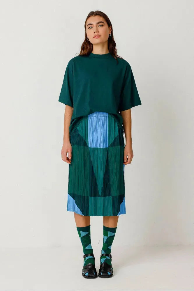 Falda midi acampanada con cintura elástica, de estilo fácil de poner y fino tejido plisado. Una opción cómoda y actual.