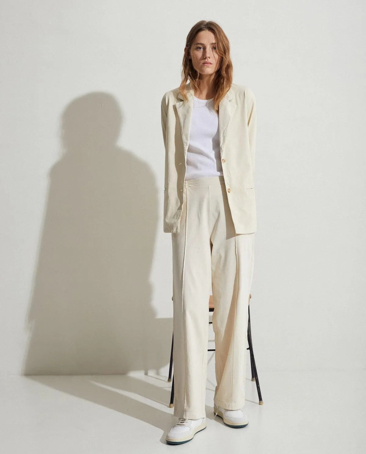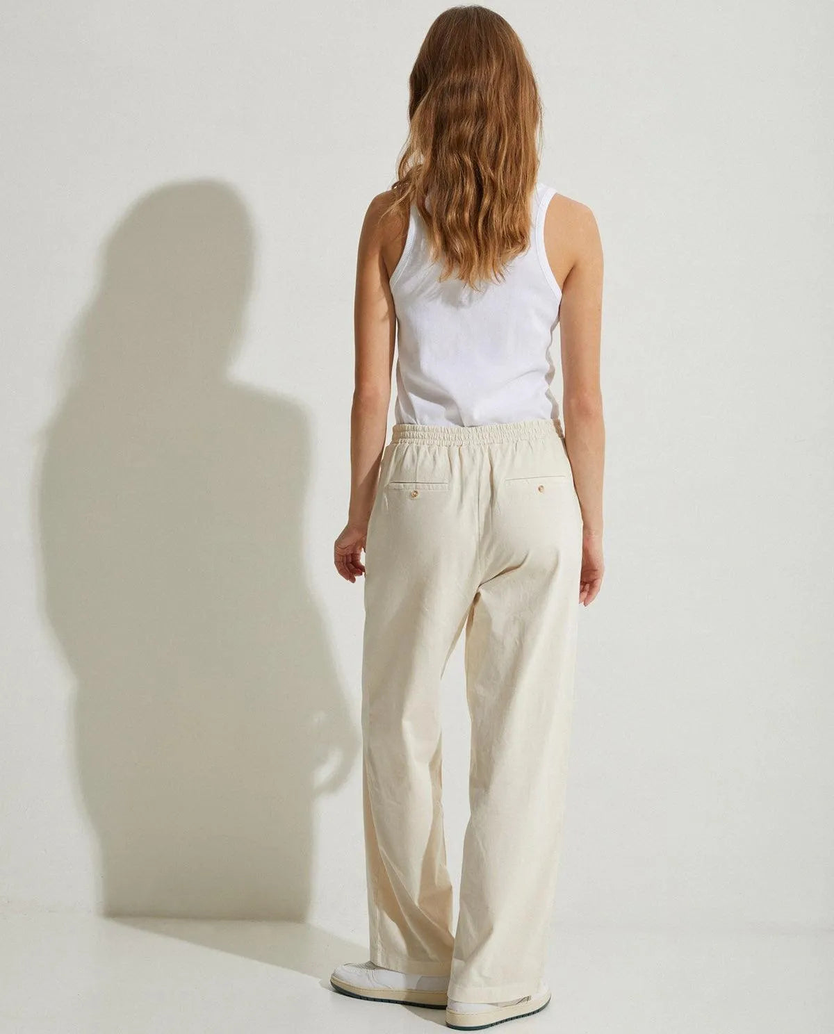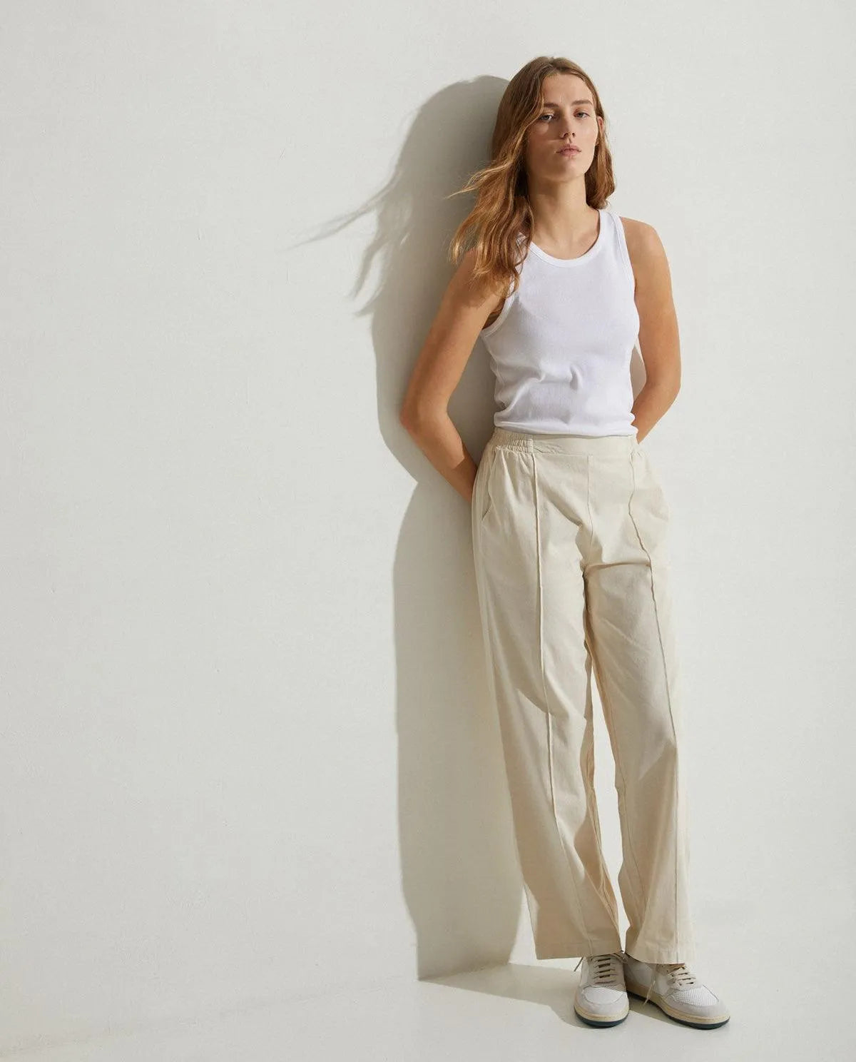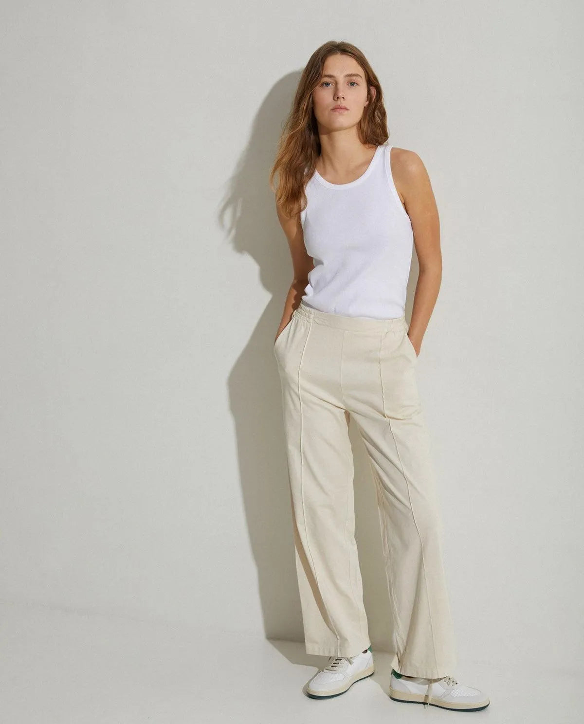 Pantalones de punto. Cintura elástica. Tallaje ancho con detalle de costura central. Bolsillos laterales. Composición: 100% algodón. Altura modelo 175 cm, talla S.