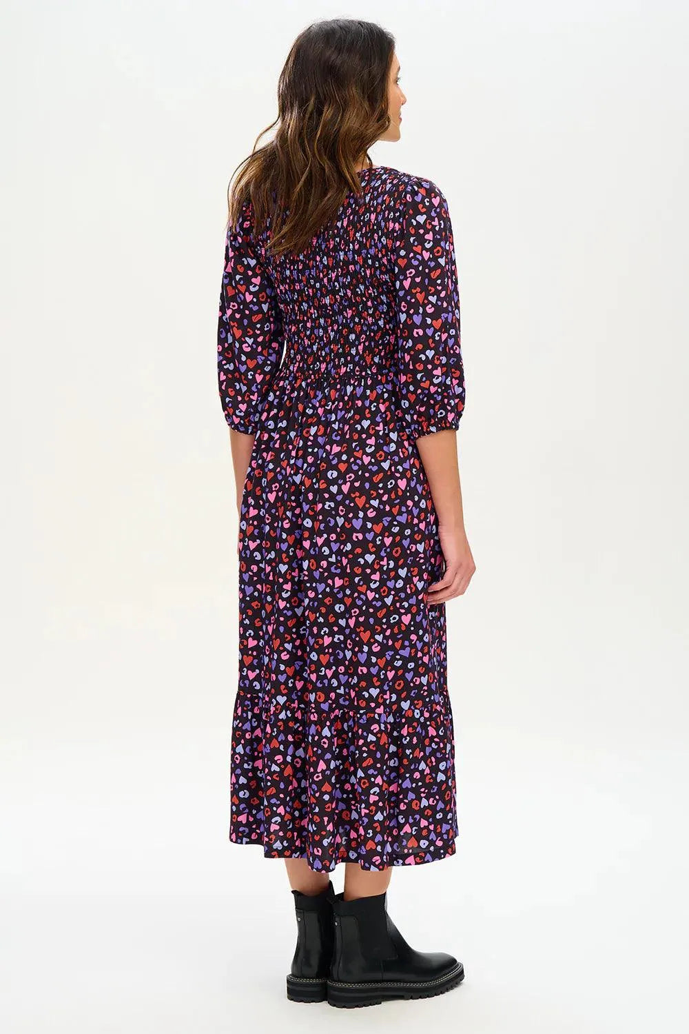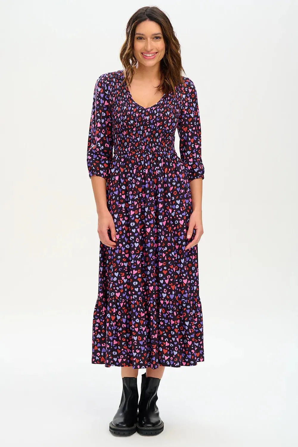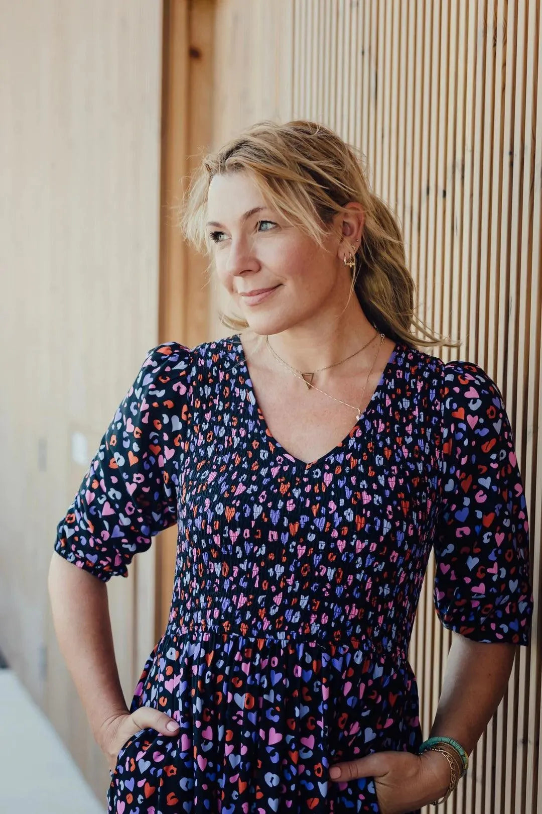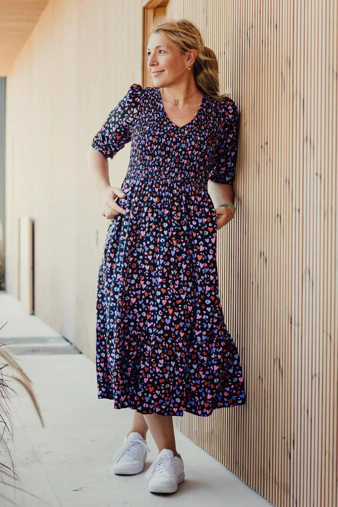 Nuestro estilo Magdalene es un vestido fruncido de largo más largo. Este estilo tiene un favorecedor escote en V, busto fruncido elástico, mangas largas con puños elásticos y una falda midi amplia con volante en el bajo. El estampado Leopard Love presenta minicorazones rosas y morados y estampado animal, en estilo confeti, sobre una base negra.