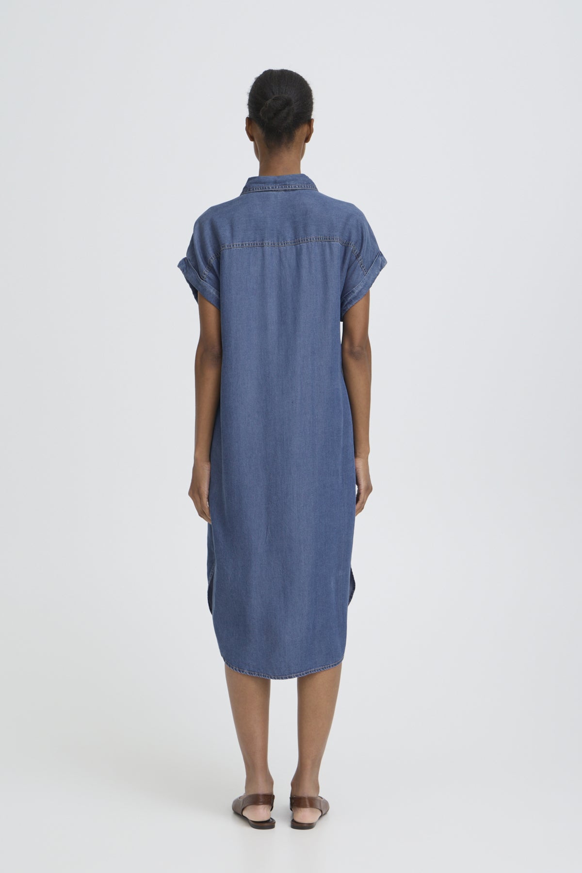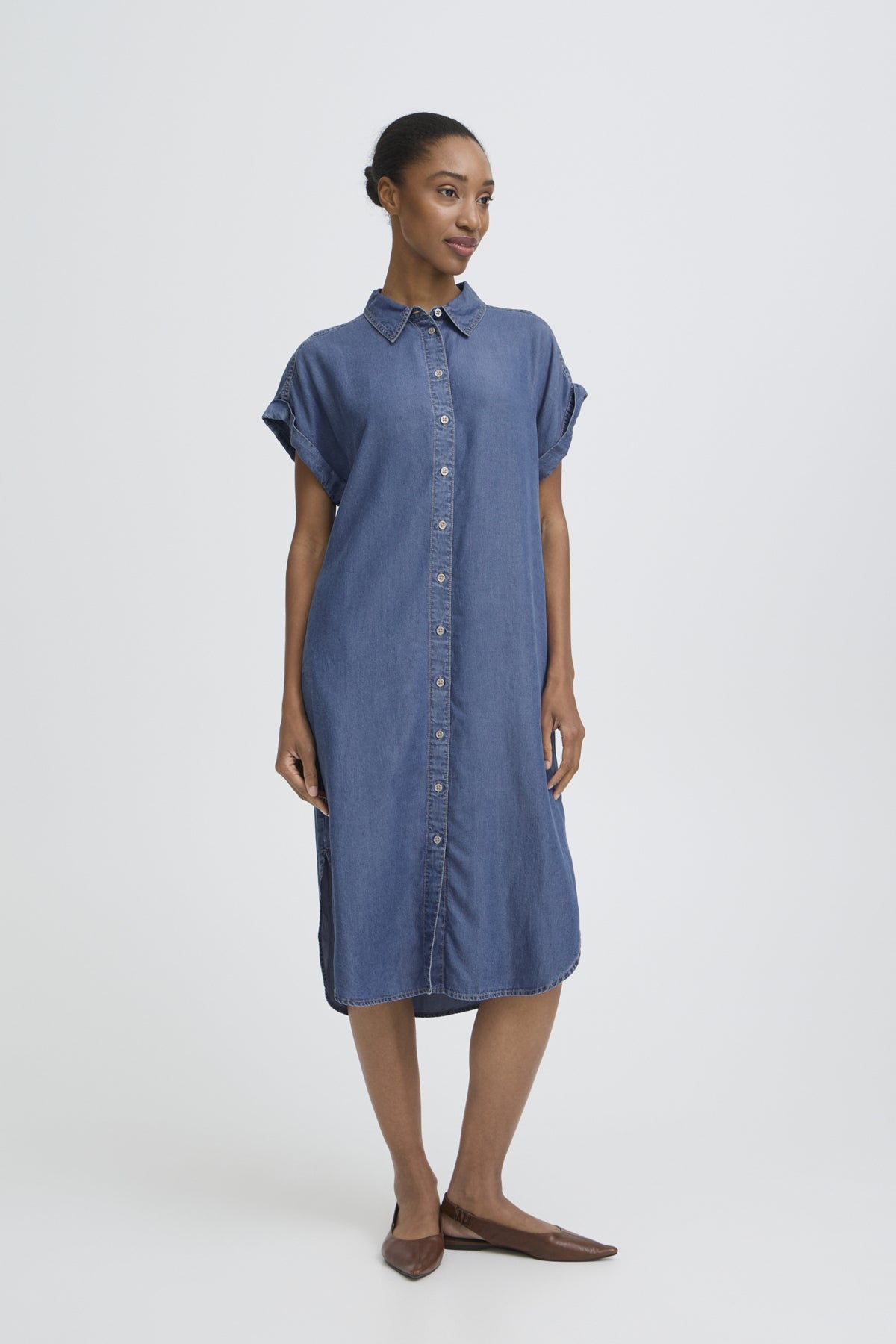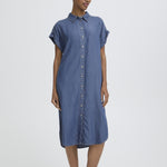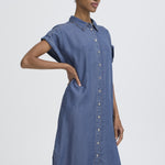 Este vestido tipo camisa en un tono denim azul medio combina comodidad y estilo con su tejido de lyocell, ofreciendo una textura suave y transpirable ideal para el uso diario. Su manga corta lo hace perfecto para climas cálidos o para combinar con otras prendas en temporadas más frescas, aportando un aire desenfadado pero cuidado a tu guardarropa.