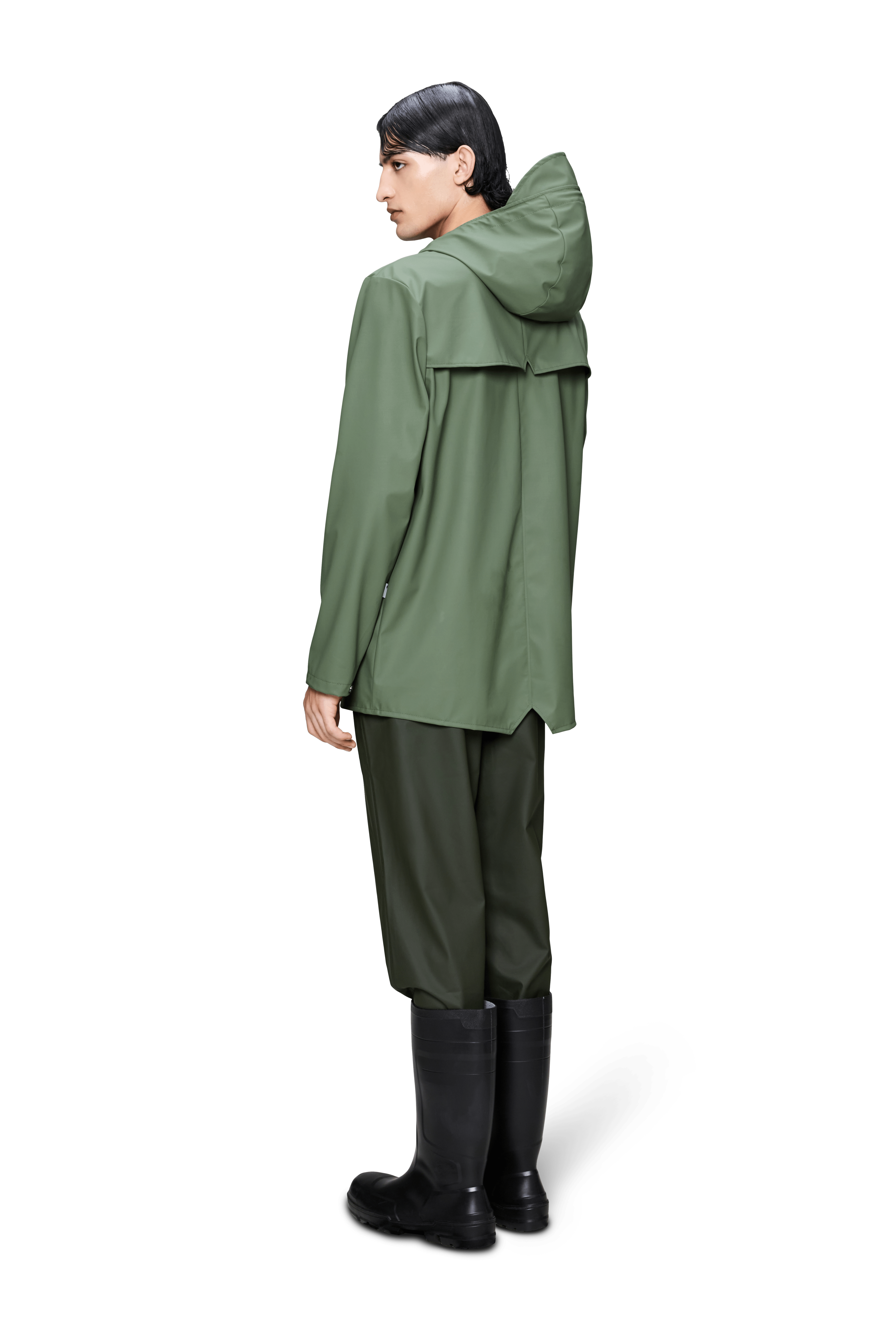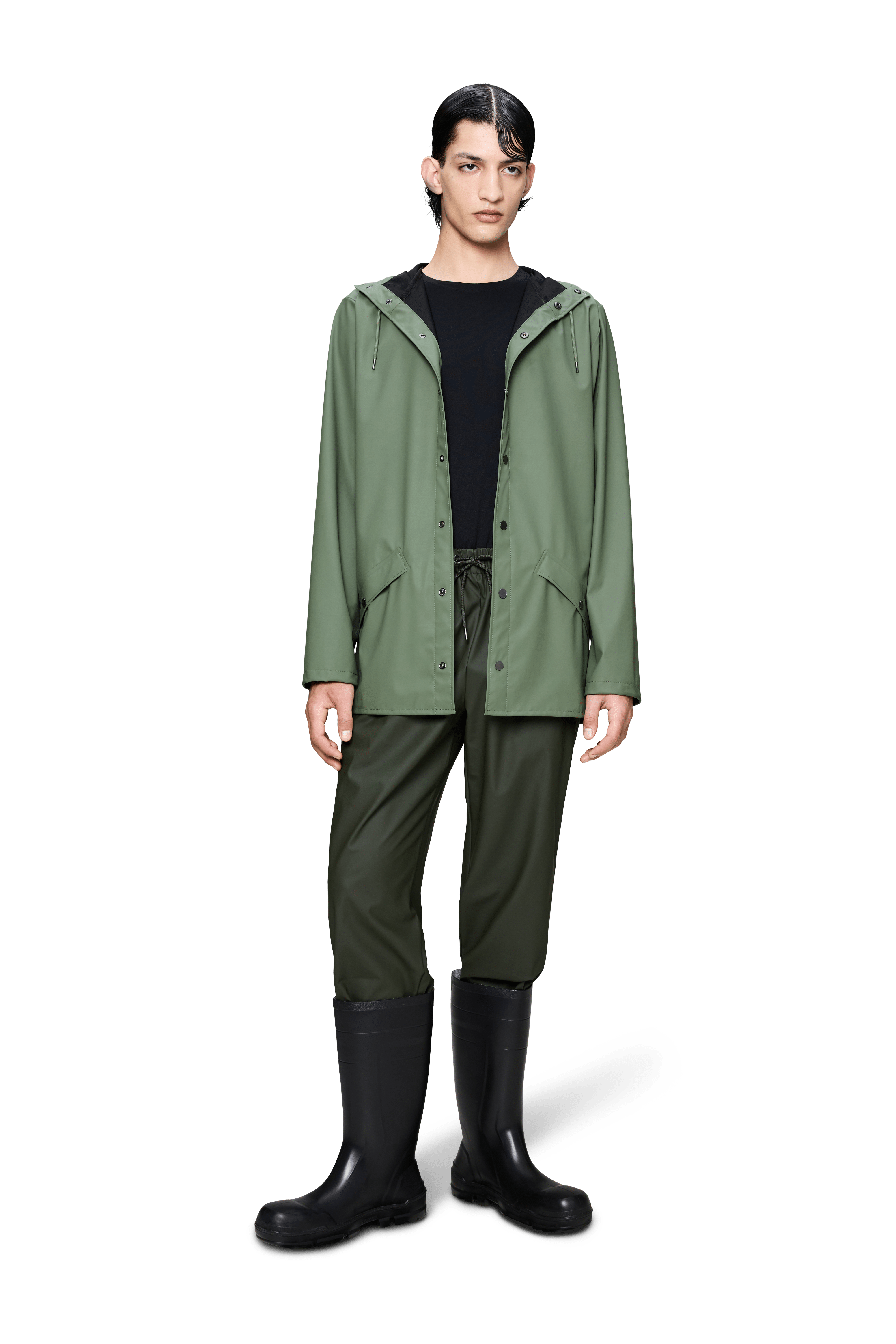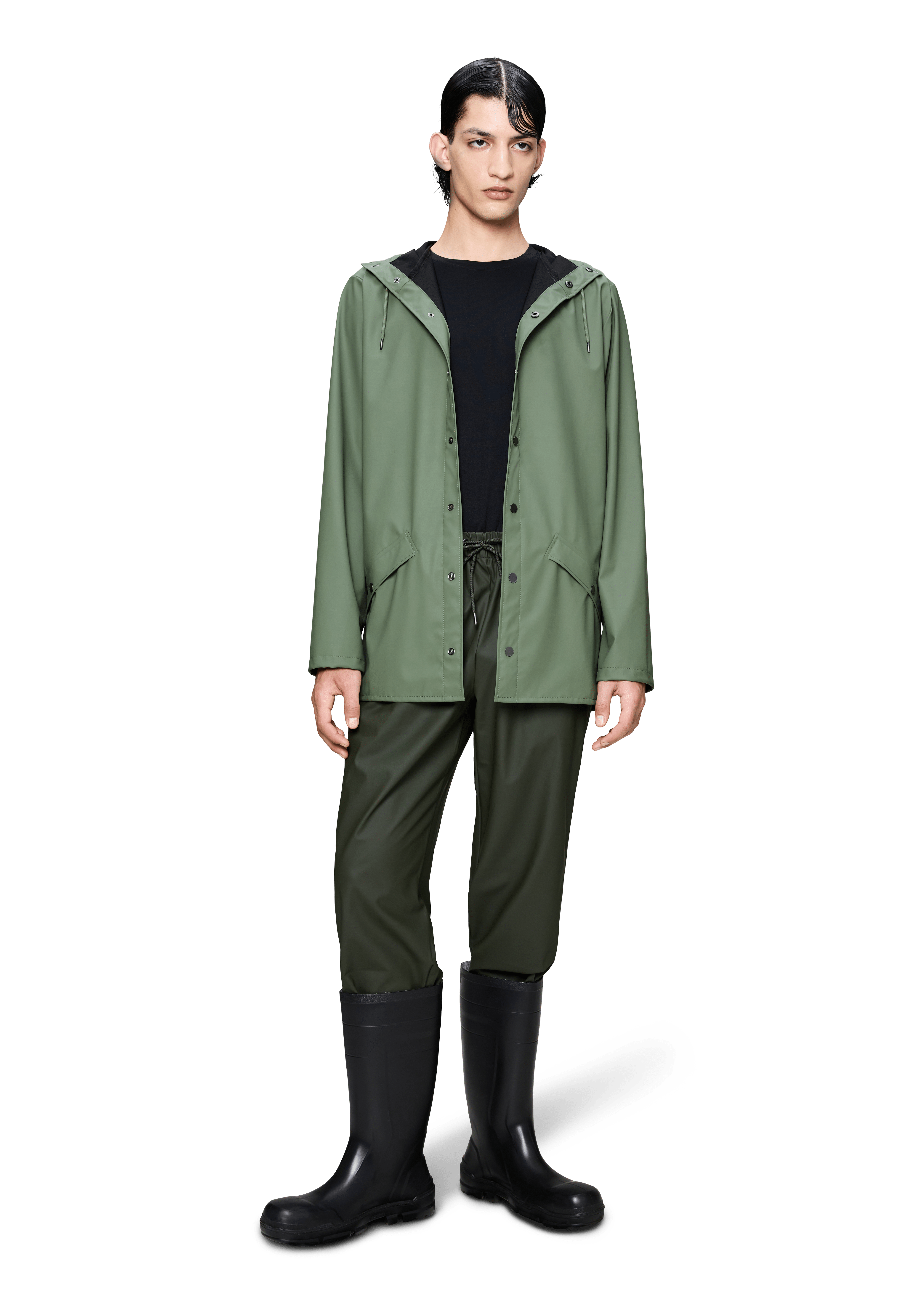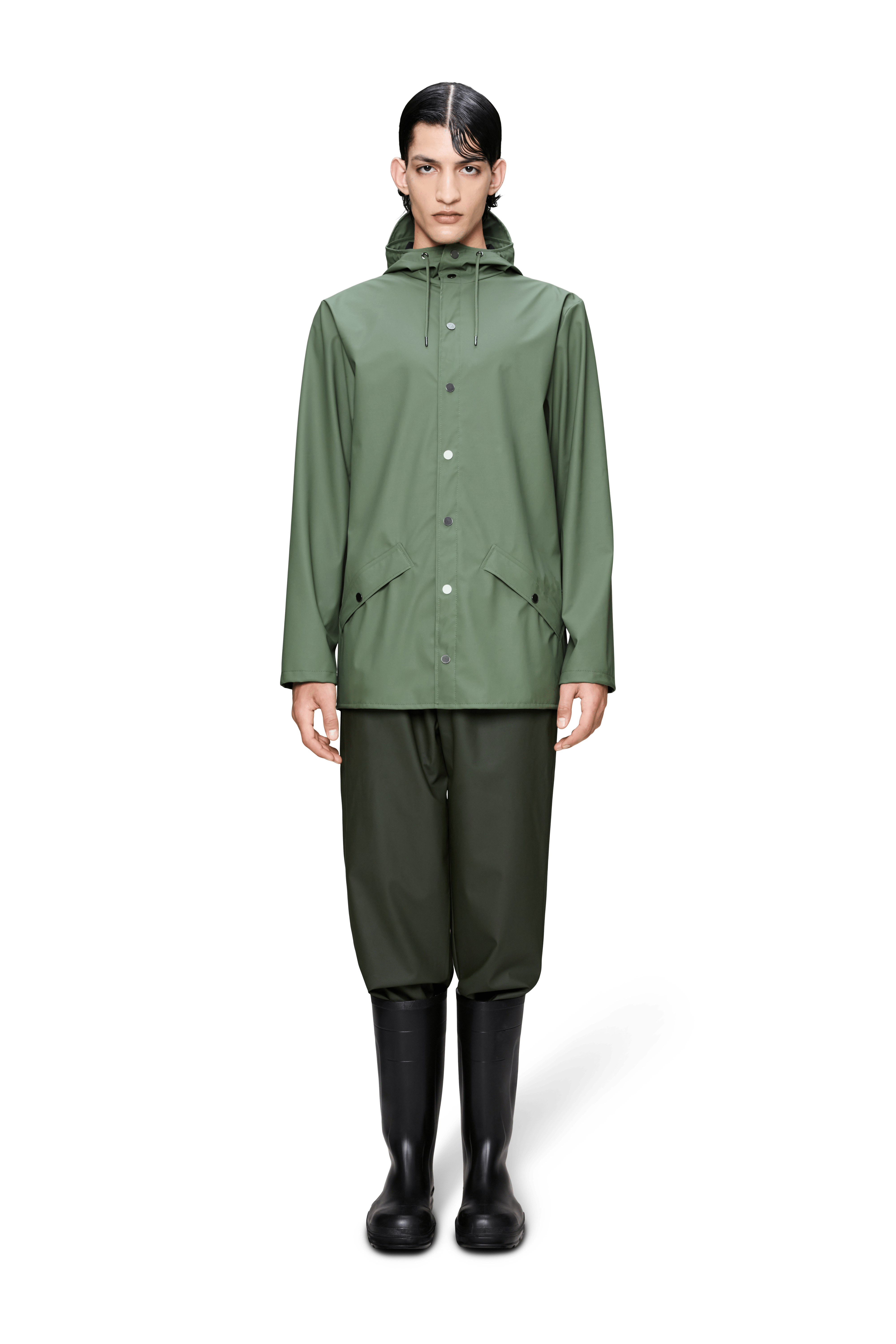 Jacket es una chaqueta impermeable unisex de corte regular y estética minimalista, pensada para el día a día en ciudad. Un básico de PU con costuras selladas que combina protección y una caída elegante.
