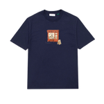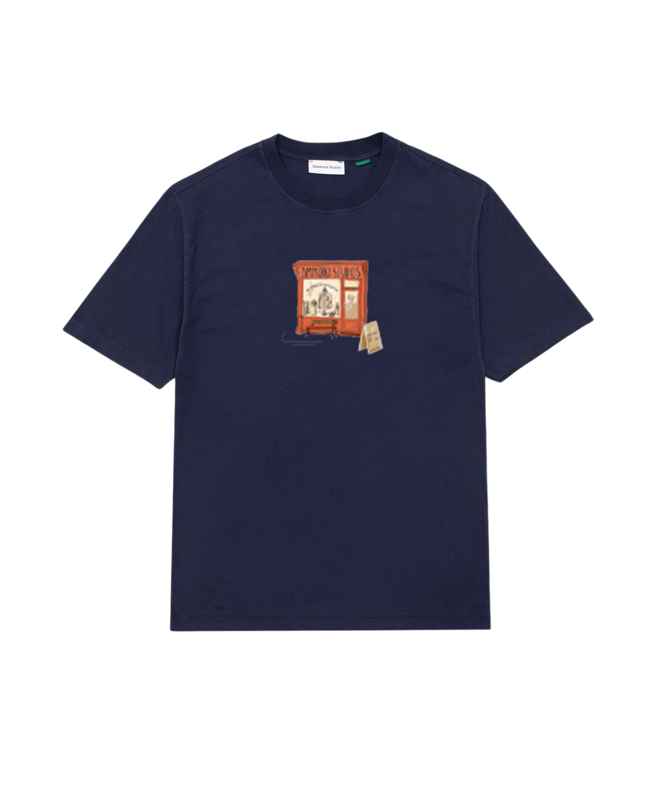 Camiseta azul marino de manga corta, fabricada con algodón 100% orgánico. Diseñada con un corte relajado y una longitud perfecta. Presenta una ilustración especial en la parte frontal en tonos naranjas que muestra la tienda de "Edmmond Studios". Fabricada en Portugal.