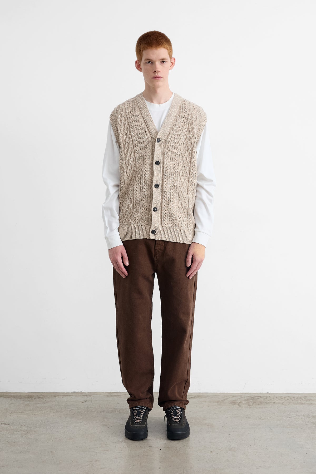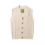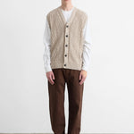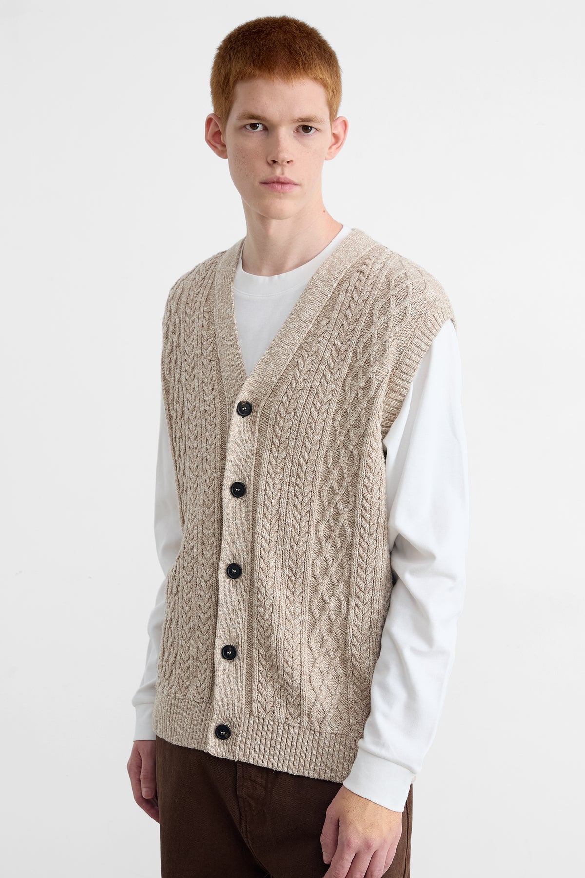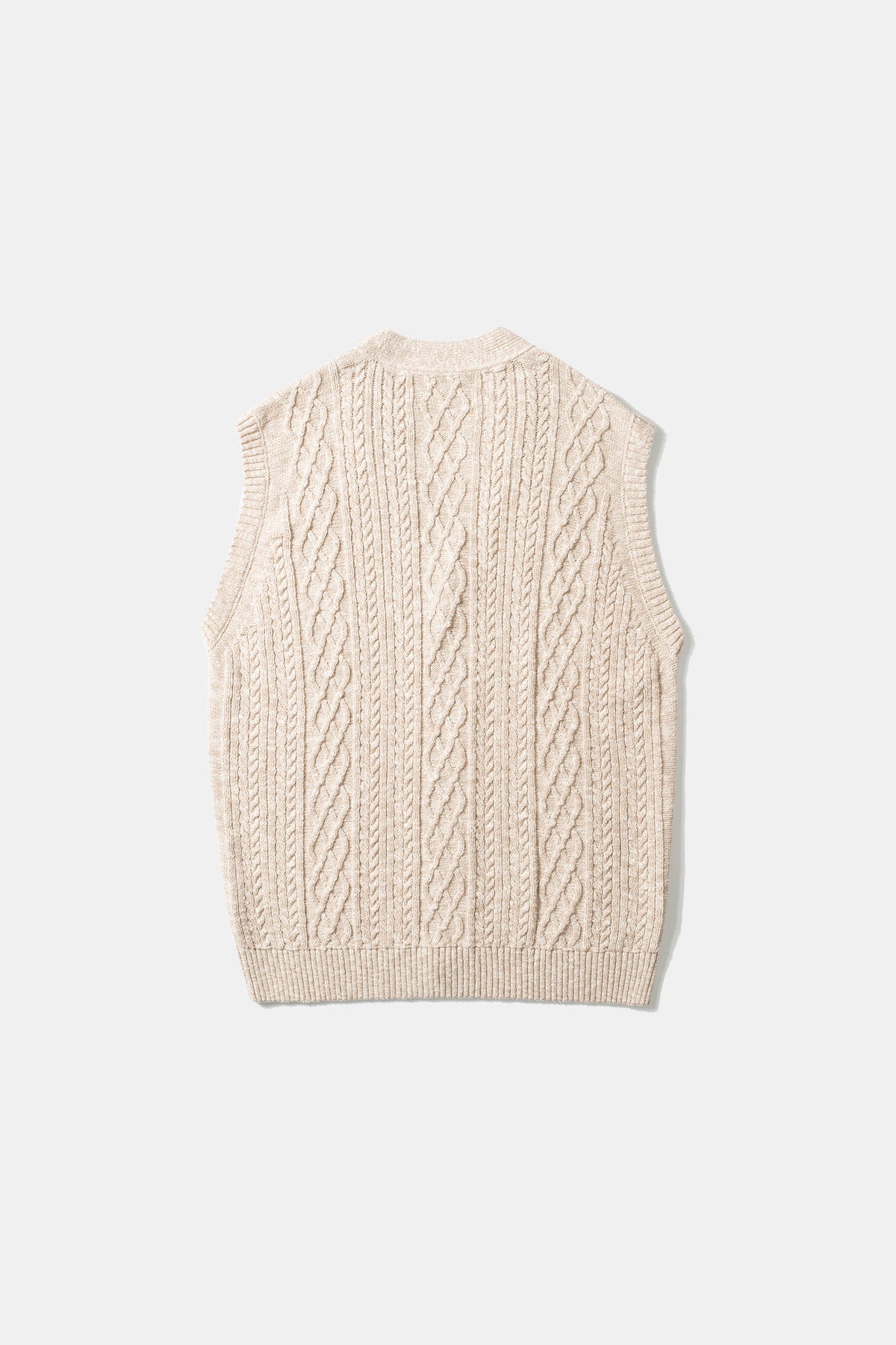 Chaleco blanco hueso de punto con trenzas tipo aran, confeccionado en hilos mouliné de algodón que aportan un efecto jaspeado. Fabricada en Portugal.