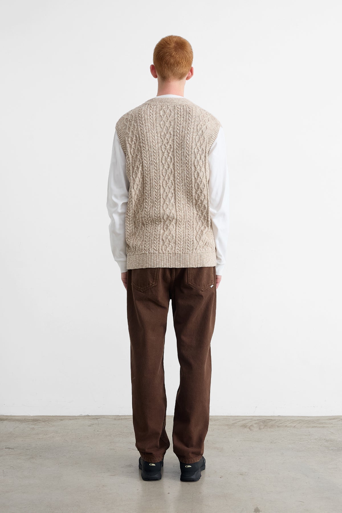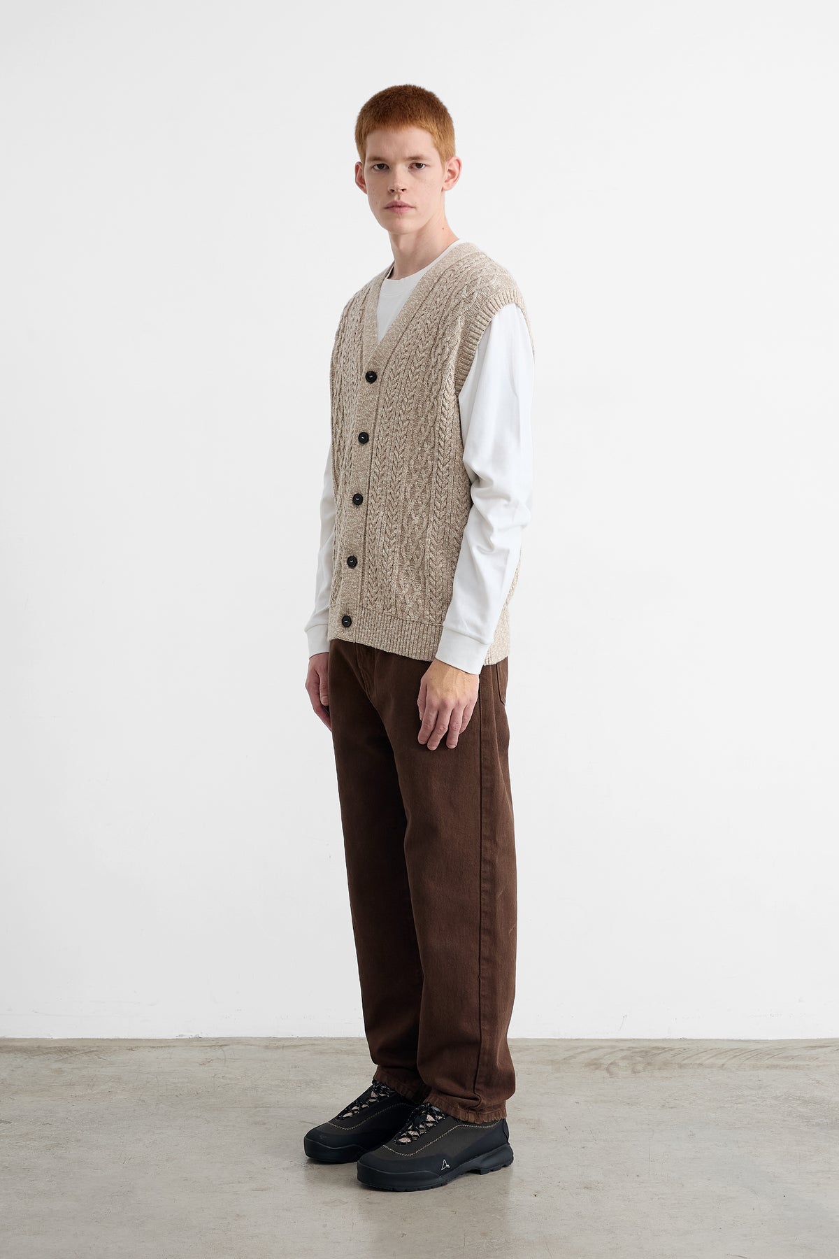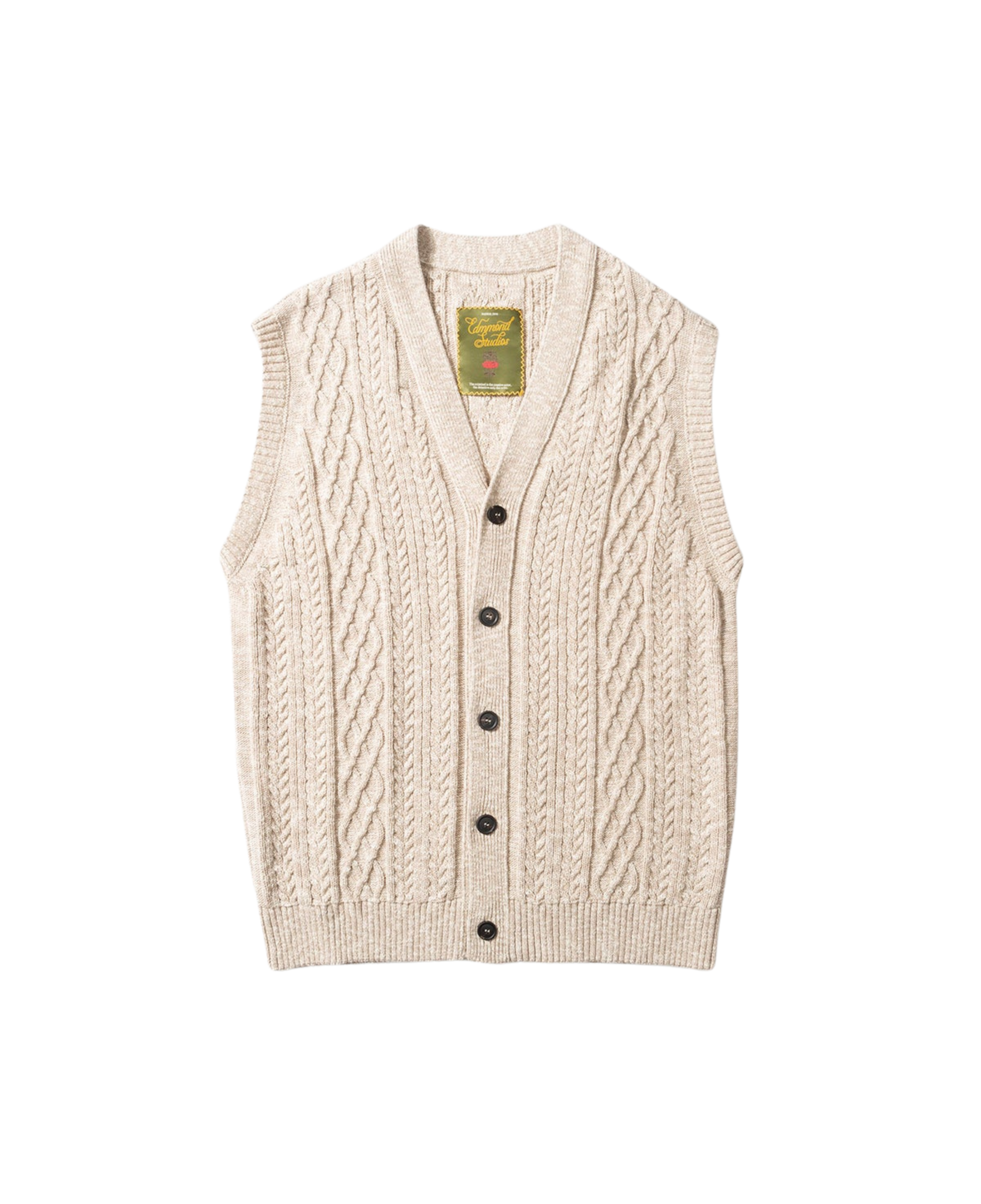 Chaleco blanco hueso de punto con trenzas tipo aran, confeccionado en hilos mouliné de algodón que aportan un efecto jaspeado. Fabricada en Portugal.