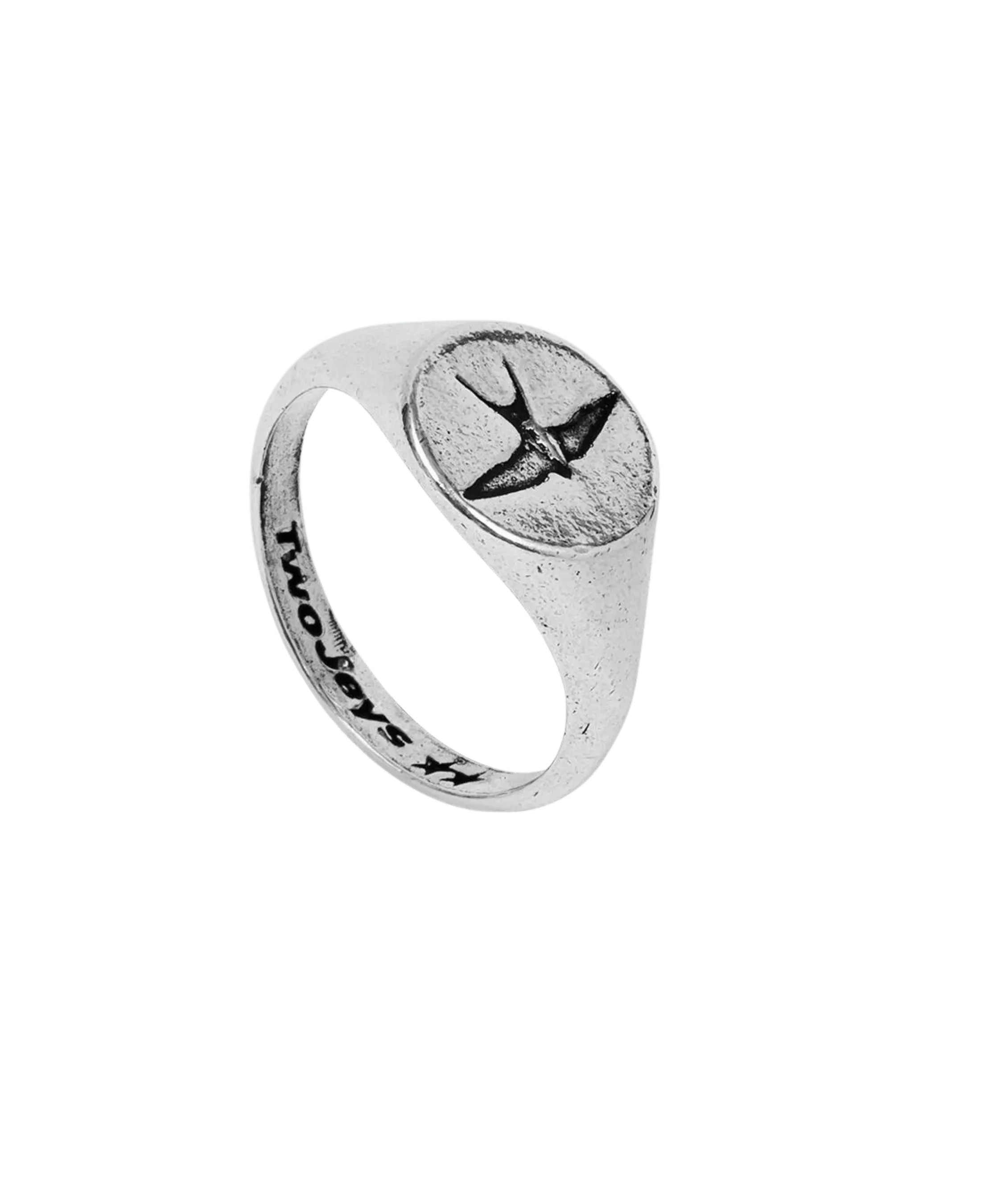 El Anillo Libertad está hecho de latón con una golondrina grabada en la cara frontal del anillo.
