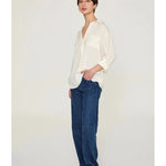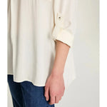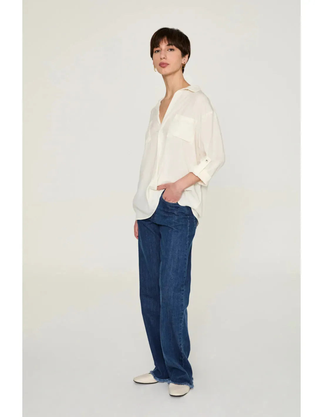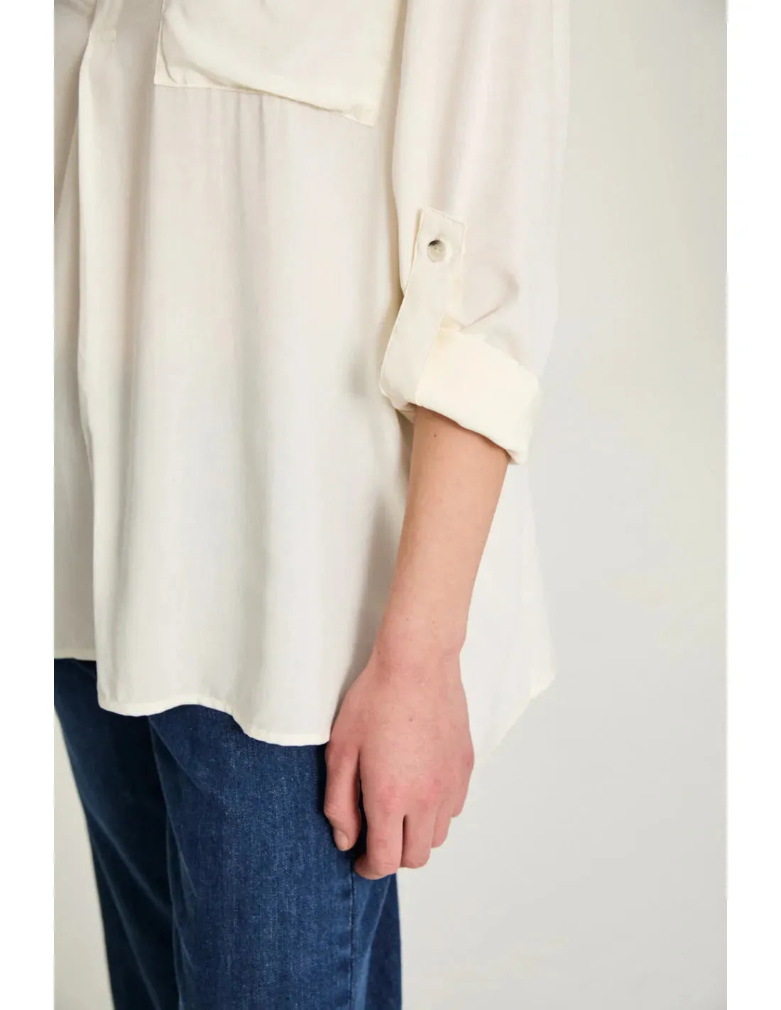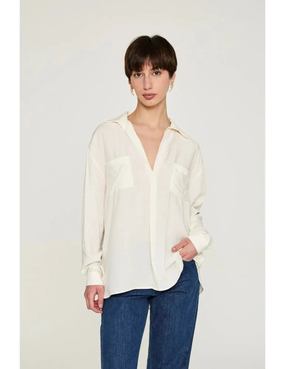 Camisa oversize con cuello camisero y pico central, manga larga. Bolsillos de plastrón en delantero.