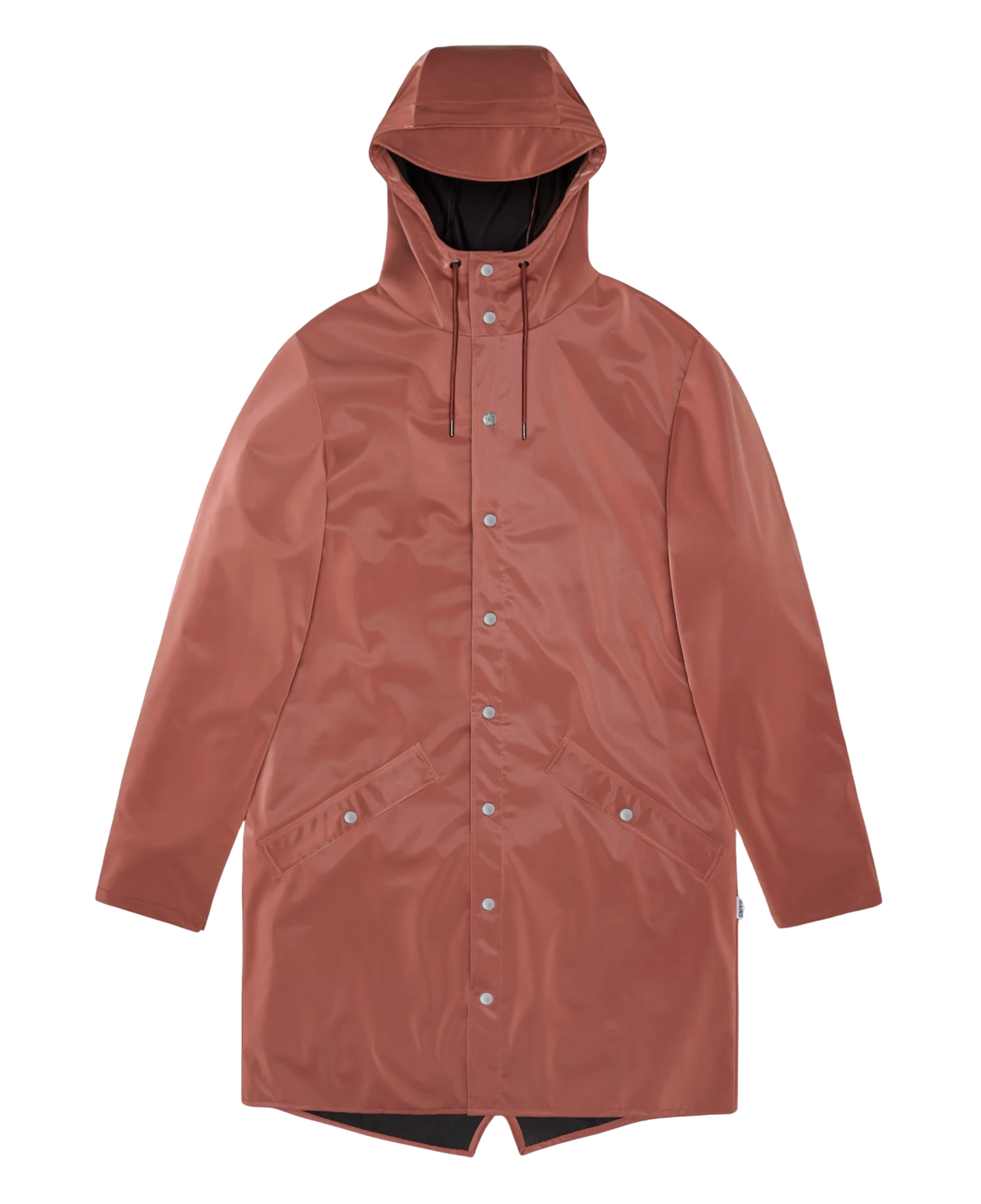 Este impermeable es la versión larga del clásico impermeable de Rains. Presenta una tapeta con botones de presión, capucha con visera incorporada y dos bolsillos laterales con botones automáticos. Las mangas presentan botones de presión que permiten ajustarlas para que queden sueltas o recogidas.