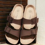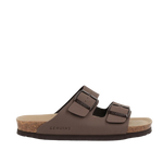 Sandalia marrón con planta anatómica y tiras con hebillas ajustables. Calzado vegano aprobado por PETA, libre de animales y respetuoso con el medio ambiente. Diseñado y fabricado en las fábricas de Elche de Genuins, bajo una producción sostenible y proveedores locales.