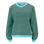 Descubre tu nueva prenda imprescindible para el tiempo libre: la sudadera Mindy con mangas abullonadas. Confeccionada en suave jersey de algodón, esta sudadera a rayas presenta llamativas rayas horizontales en azul marino y verde, acentuadas con un dobladillo, puños y cuello acanalados en azul brillante a contraste. Las llamativas mangas abullonadas añaden un toque femenino a esta silueta informal, lo que la hace perfecta para combinar fácilmente con vaqueros, pantalones de chándal o faldas. Diseñada para ofrecer una comodidad relajada, Mindy es tu jersey de cuello redondo imprescindible para combinar con facilidad y aportar color a tu día a día.