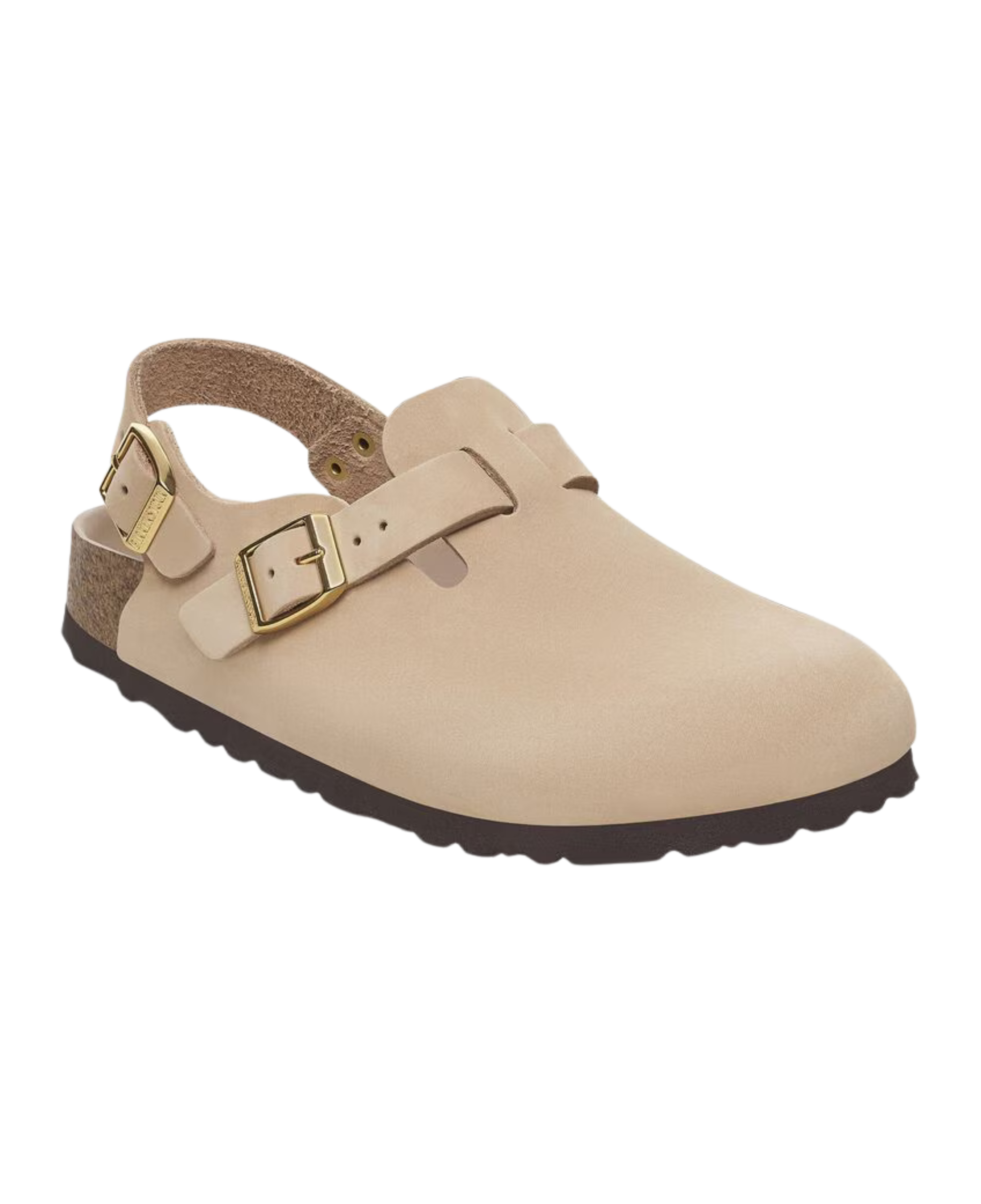 El zueco Tokio de BIRKENSTOCK es una variación basada en el clásico modelo Boston. Cuenta con correa de talón y se puede llevar durante todo el año. La capa superior de la plantilla semi-exquisite está forrada con piel lisa en color a juego con el calzado. El material superior está compuesto por suave piel de nobuk de alta calidad, que convence gracias a su aspecto natural y rústico.