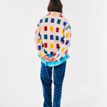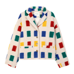 La chaqueta jacquard de botonadura sencilla Color Game luce un estampado geométrico divertido en azul klein, rojo, verde y amarillo sobre una tela de color blanco roto. Fabricada en poliéster reciclado, ofrece un ajuste ligeramente holgado y un tejido no elástico que se ajusta a todas las siluetas, lo que la convierte en una prenda versátil para lucir en diferentes ocasiones.