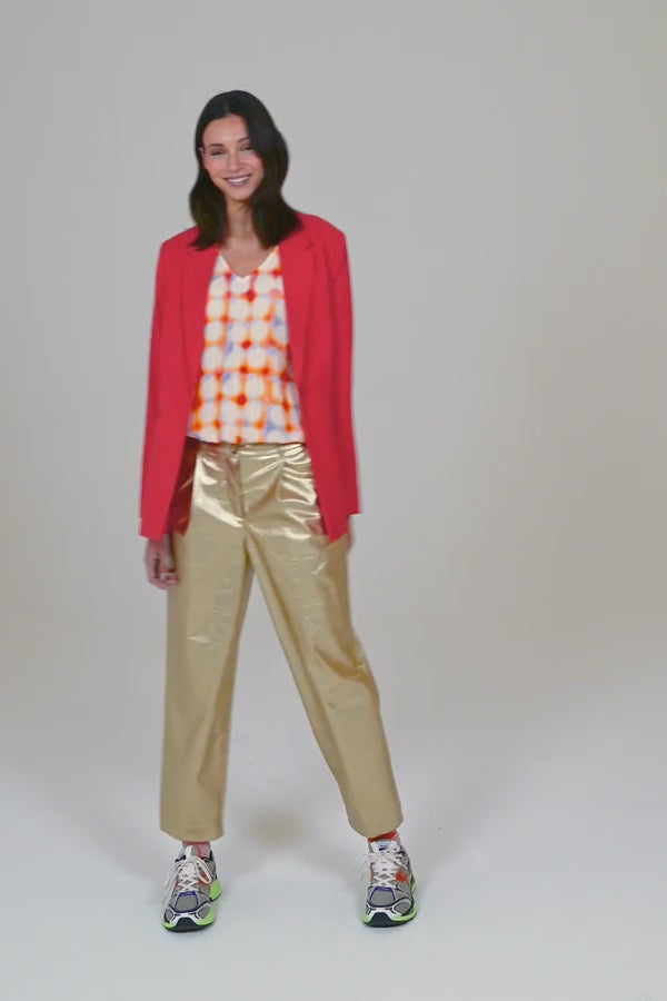 Blusa naranja de manga corta y cuello de pico con estampado tie dye de diseño propio inspirado en el sol. La paleta de colores naranja y rojo se basa en las tonalidades de una puesta de sol. Esta blusa tiene un cordón en la parte inferior y está hecha de 51% lino y 49% viscosa.