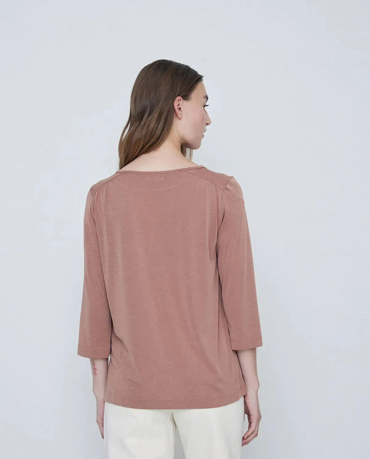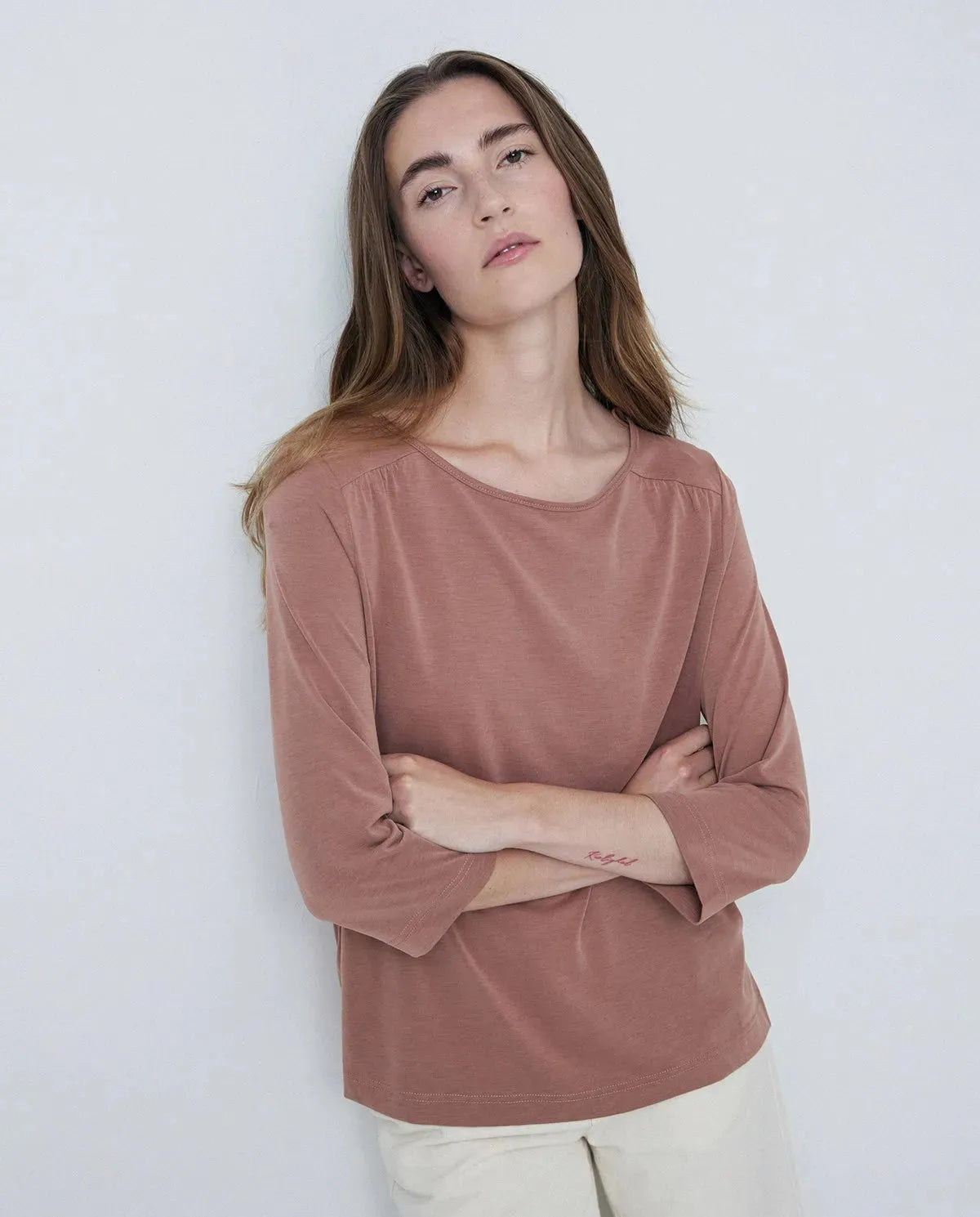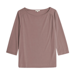 Camiseta escote barco. Manga francesa. Detalle fruncido hombros. Tejido fluido, modal combinado.
