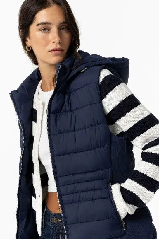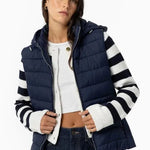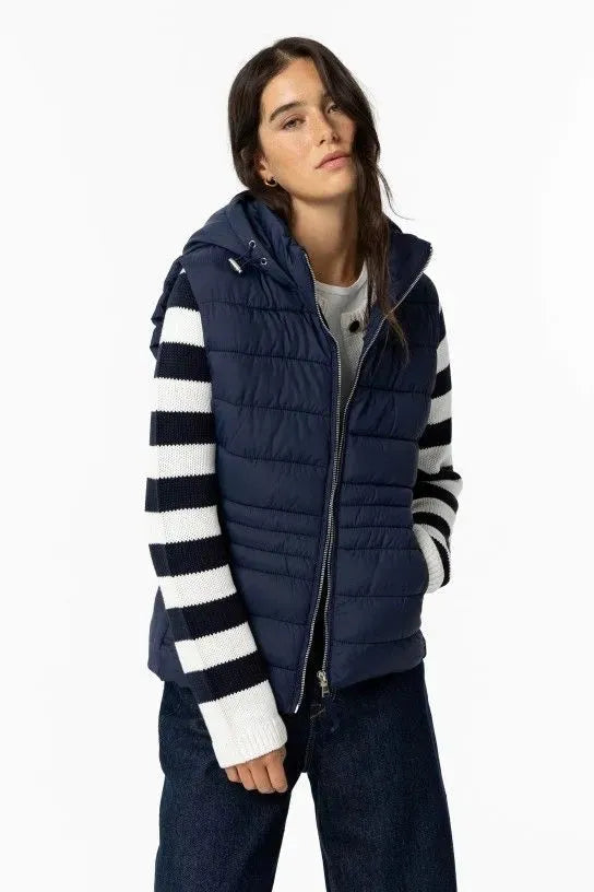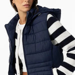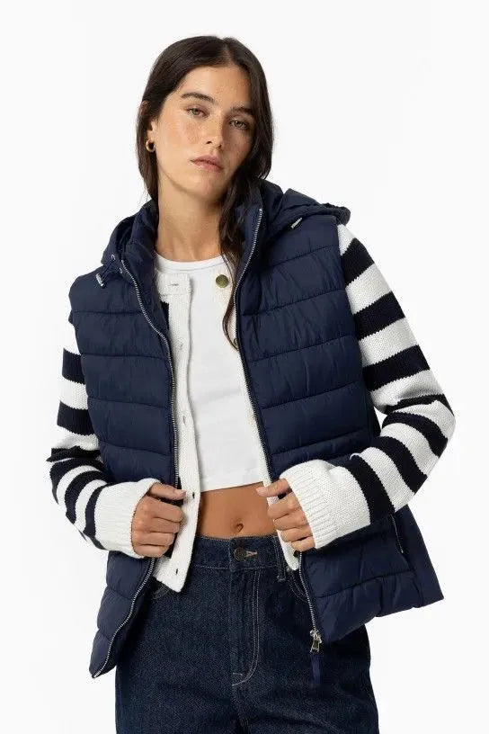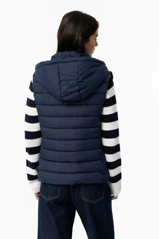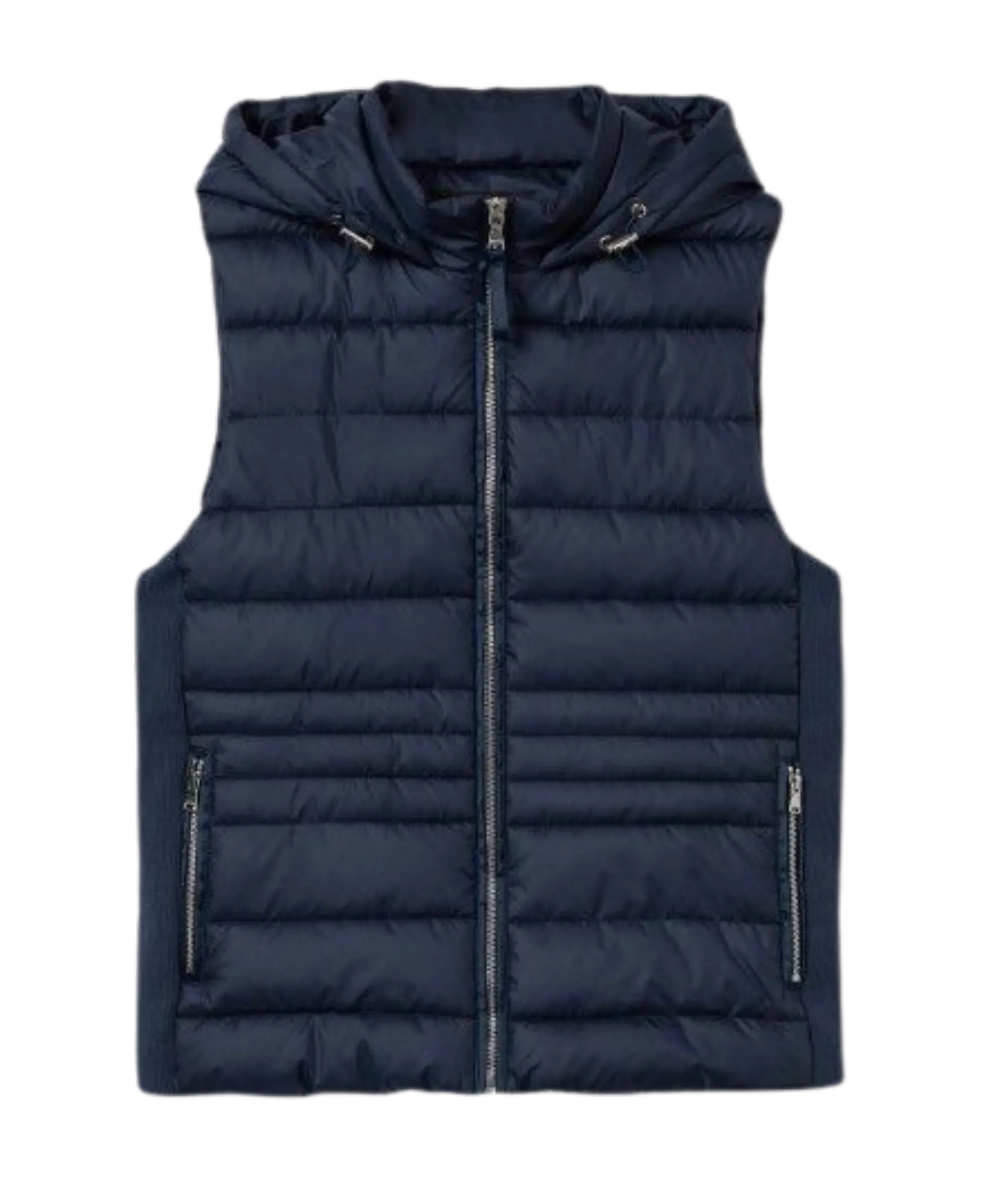 Chaleco combinado con capucha ajustable y manga sisa. Bolsillos laterales. Cierre frontal con cremallera.