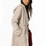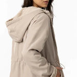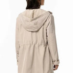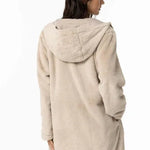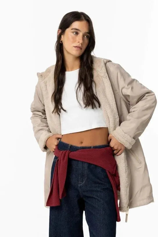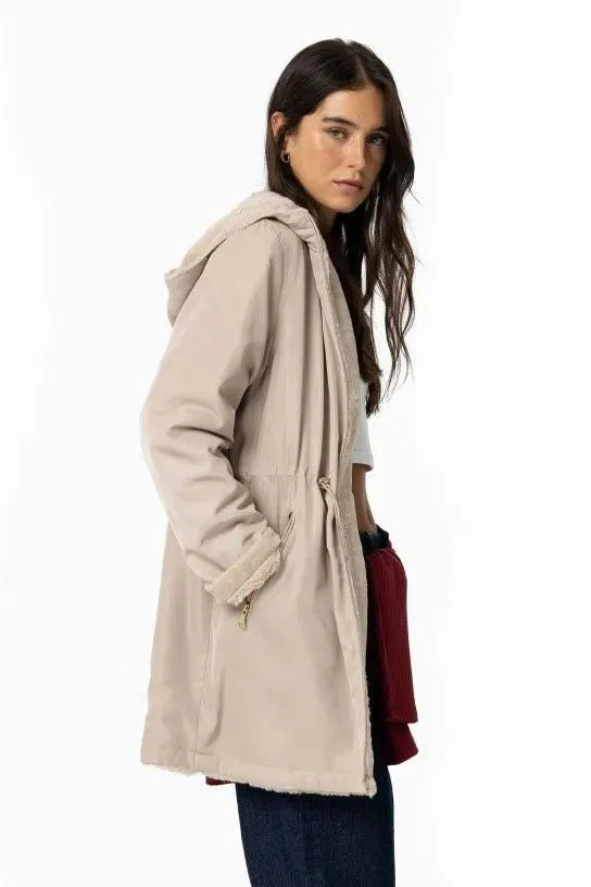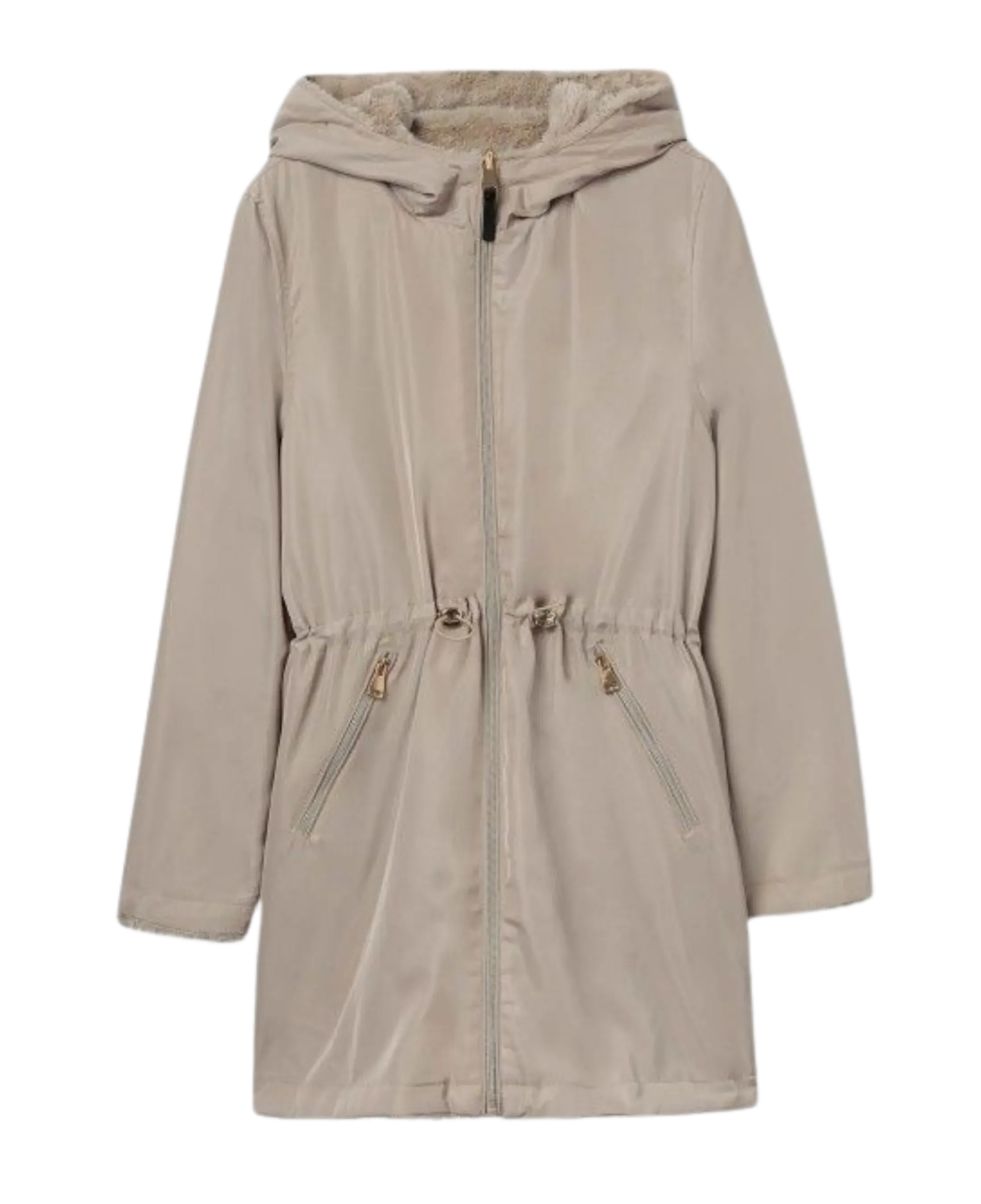 Chaqueta reversible de capucha y manga larga. Bolsillos laterales. Cierre frontal con cremallera. Cordón ajustable en la cintura.