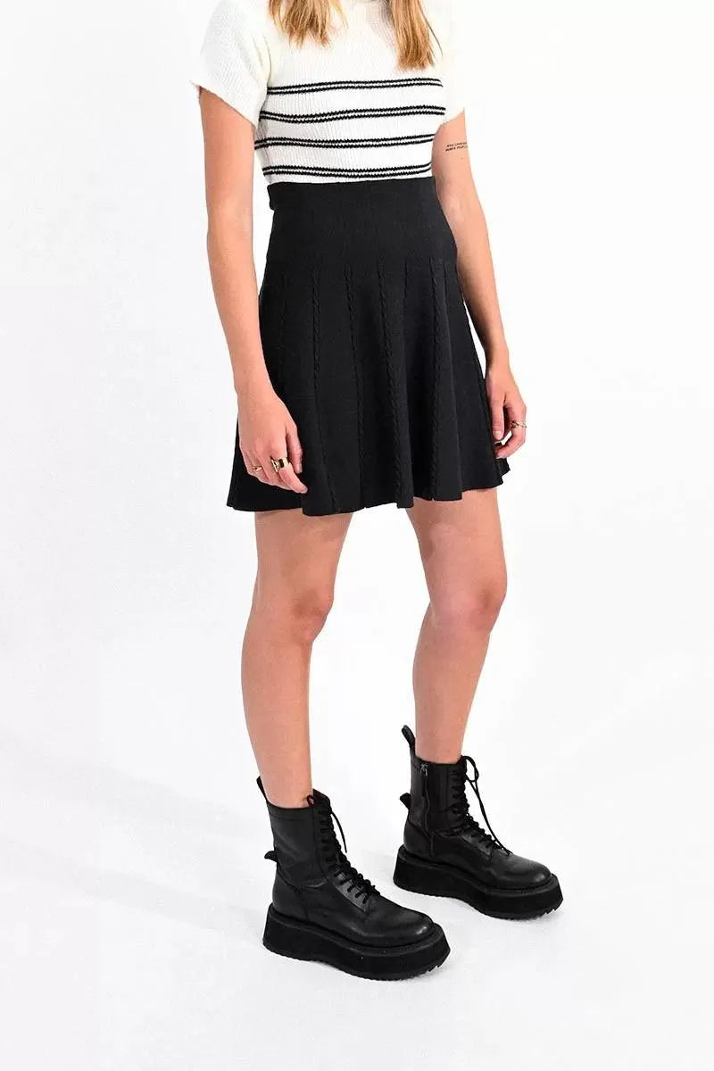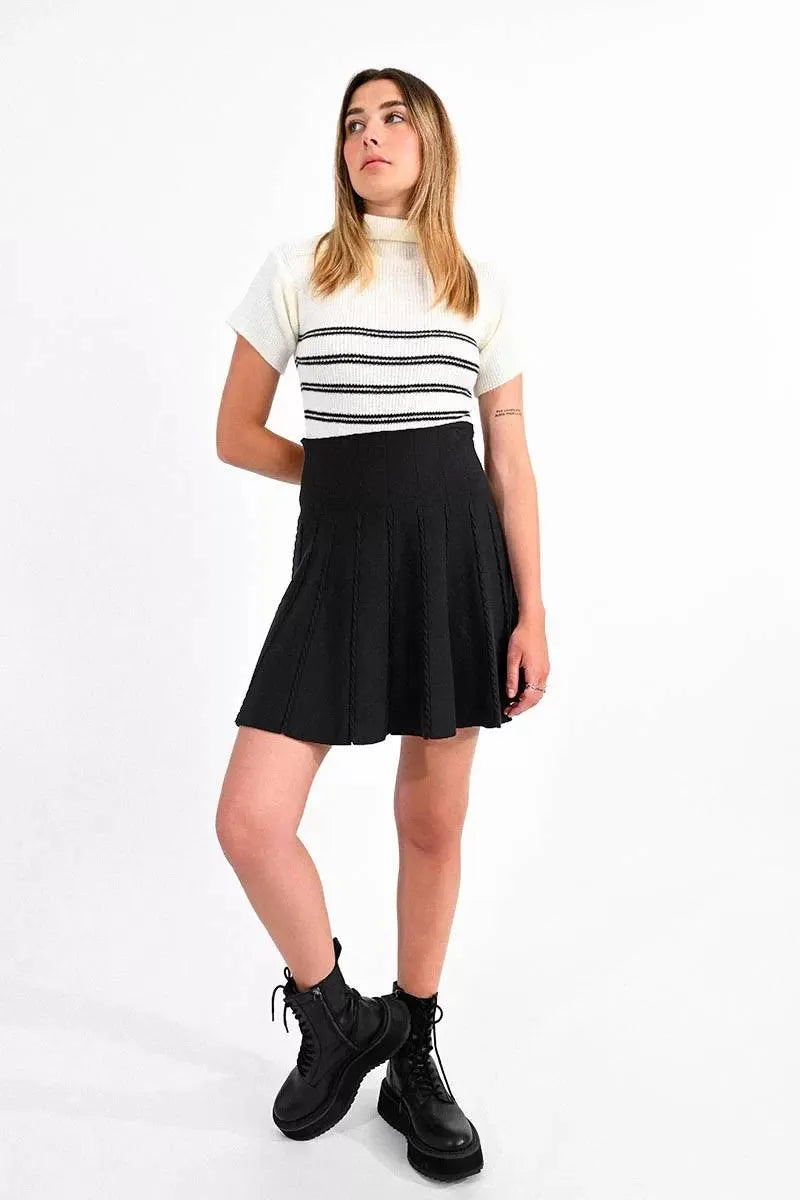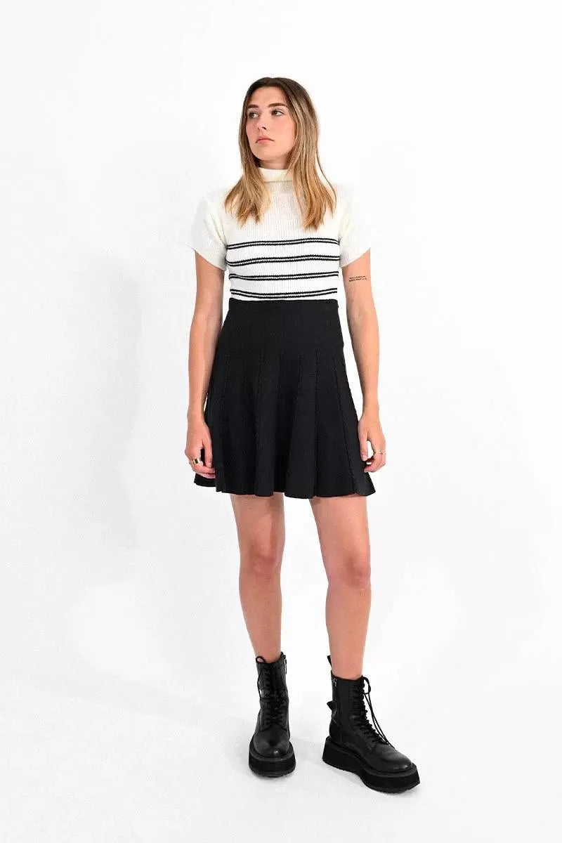 Falda corta, de tiro muy alto, con pliegues bordados. Modelo de corte linea A, en tejido elástico.
