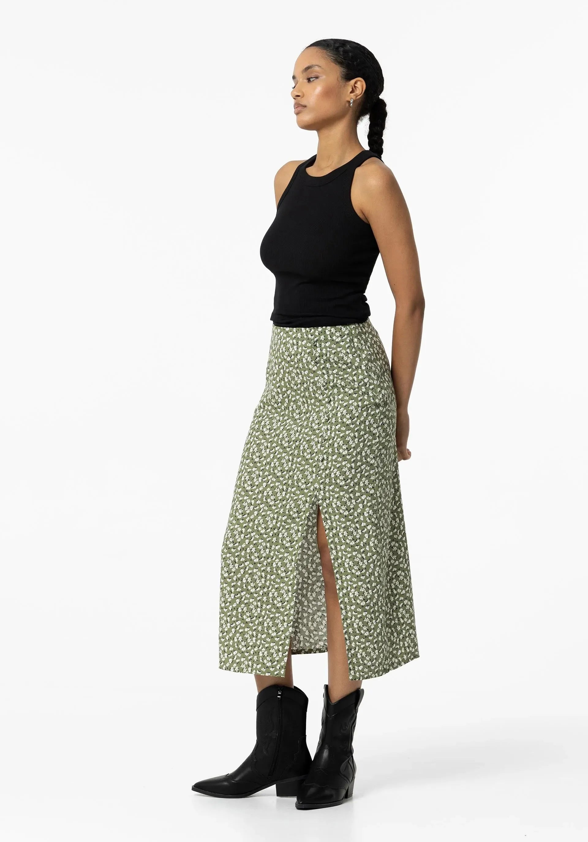 Falda con botones falsos forrados y abertura delantera. Cierre lateral con cremallera oculta en costura.